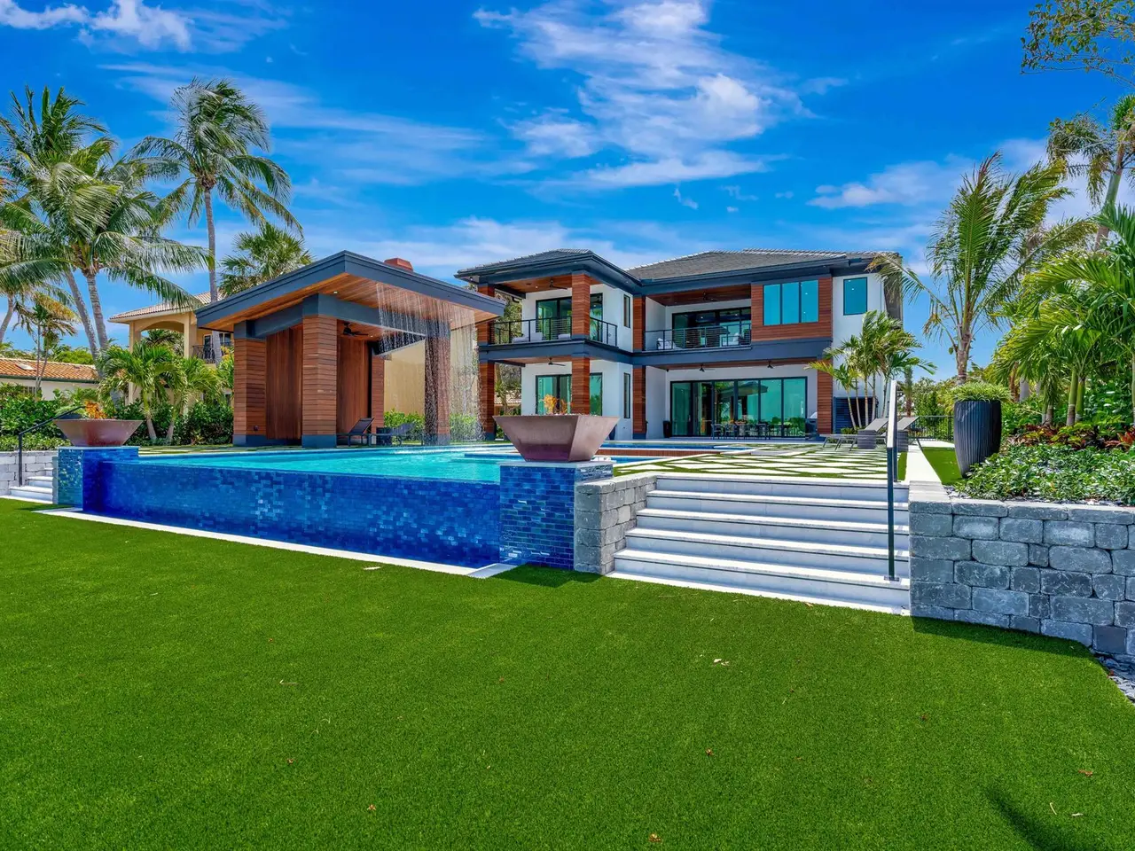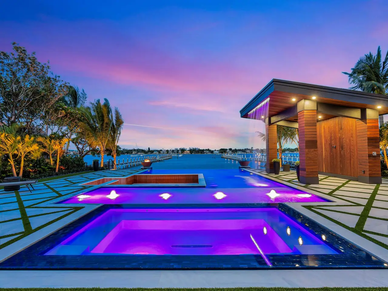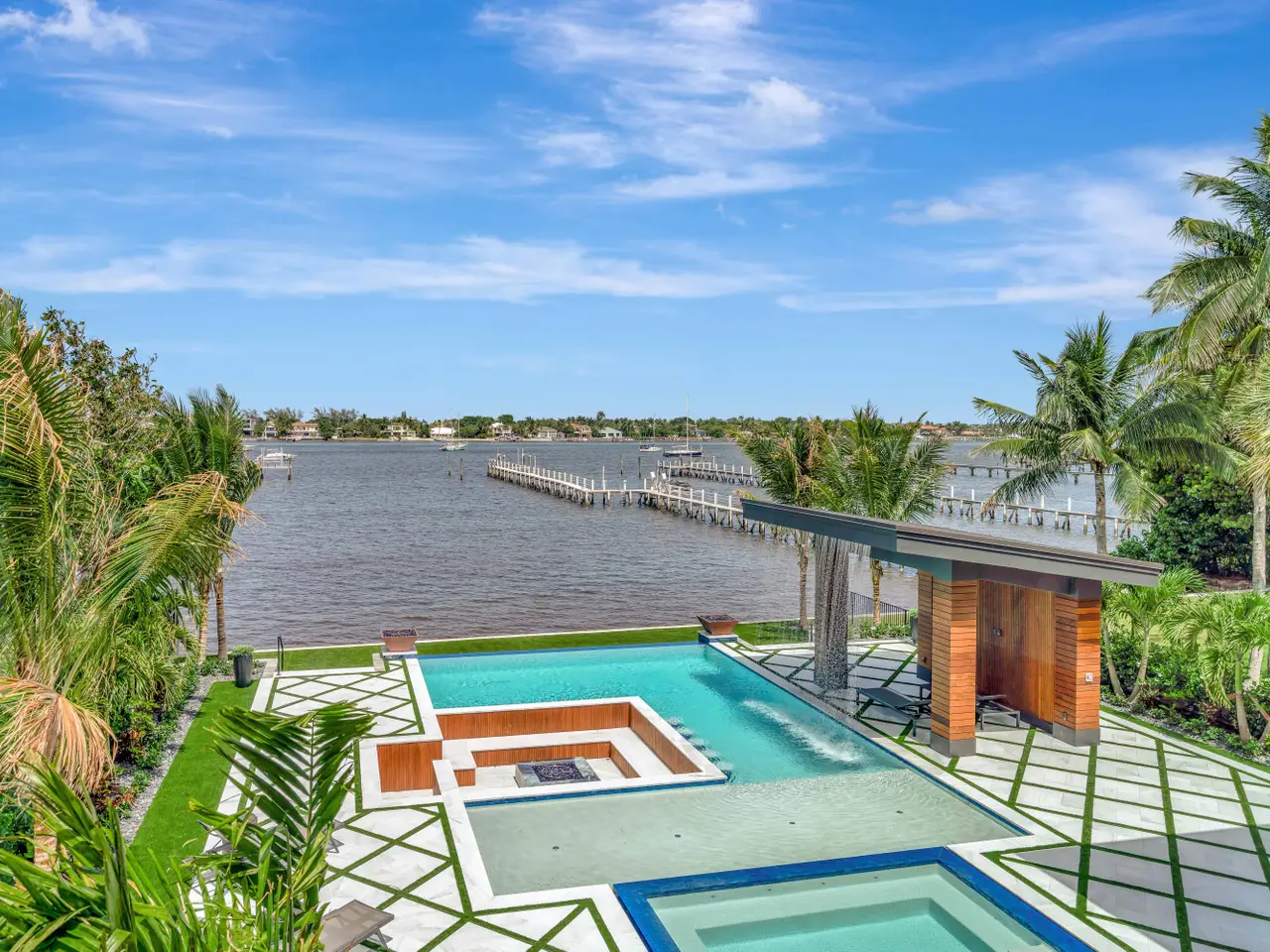 Brand-new gated intracoastal estate in prime Lantana location! Brand new 385 foot dock with 32k boat lift and pilings to tie up your very large vessels. This is the lowest price per square foot new construction on the direct intracoastal in Palm Beach County! Walk to the beach, Eau Resort & Spa, and top dining spots. Just 1.5 mi to I-95, minutes to PBI & private jet access. This smart, energy-efficient compound offers ultimate privacy with unobstructed water views, upstairs/downstairs living rooms & master suites. Loaded with upgrades: Sonos, security, landscape lighting. Backyard is a showstoppera"$500K+ resort-style pool, sunken firepit, waterfall gazebo w/ 10 stools, and multiple fire features. Luxury living at its finest!