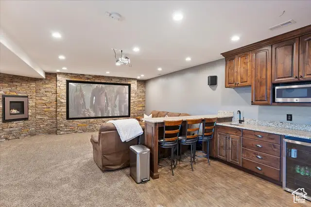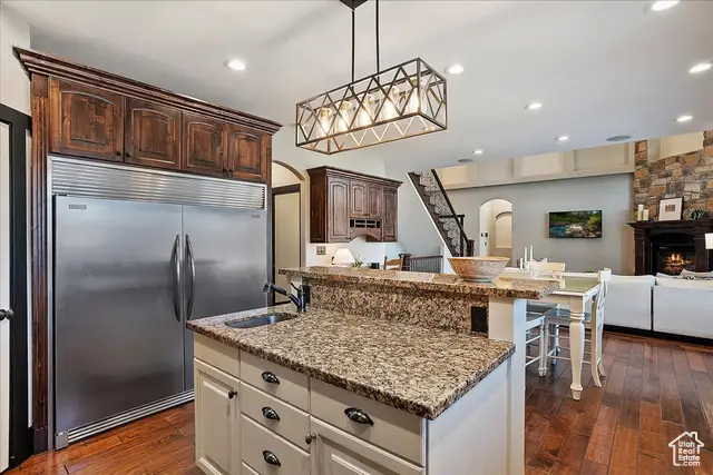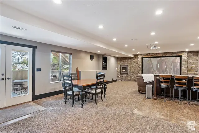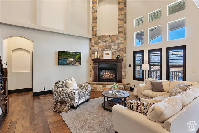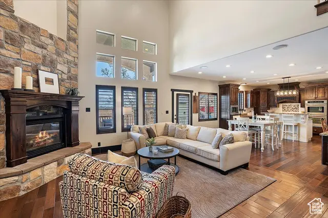 • Floor-to-ceiling stone fireplace