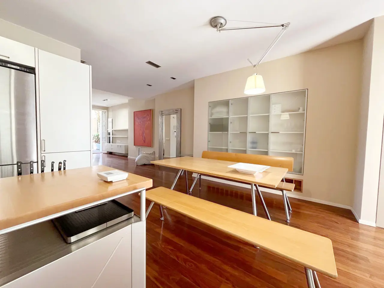 Located in one of the most sought-after areas of Valencia's Eixample, just a few meters from the Mercado de Colón, this penthouse represents a real real estate gem: spaciousness, design and a unique terrace in the heart of the city. With 163 m² built, the property stands out for its impeccable distribution and a spectacular terrace of approximately 50 m² facing the emblematic Cirilo Amorós street. An outdoor space difficult to find in this location, perfect to enjoy the Mediterranean climate throughout the year. The main living room, spacious and bright, opens directly onto the terrace, creating a seamless connection between indoors and outdoors. The kitchen, designed by the prestigious firm Bulthaup, combines functionality and style, becoming one of the most special corners of the house. The night area has three bedrooms. The master bedroom is a real suite, with a large dressing room, bathroom with bathtub and shower, and direct access to the terrace. A second double bedroom, a third single bedroom and a second bathroom with shower complete the house. It also includes a parking space in the same building, which adds value and comfort to an already exceptional property. A penthouse with clean lines, generous spaces and careful details, ideal for those looking for quality of life in one of the best locations in Valencia.