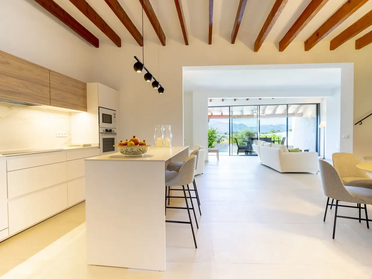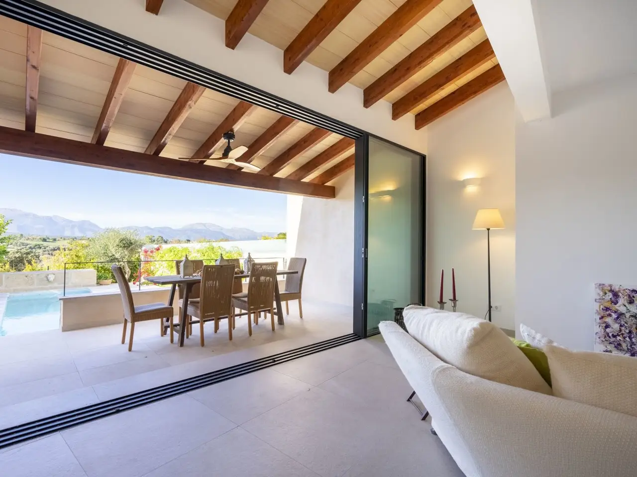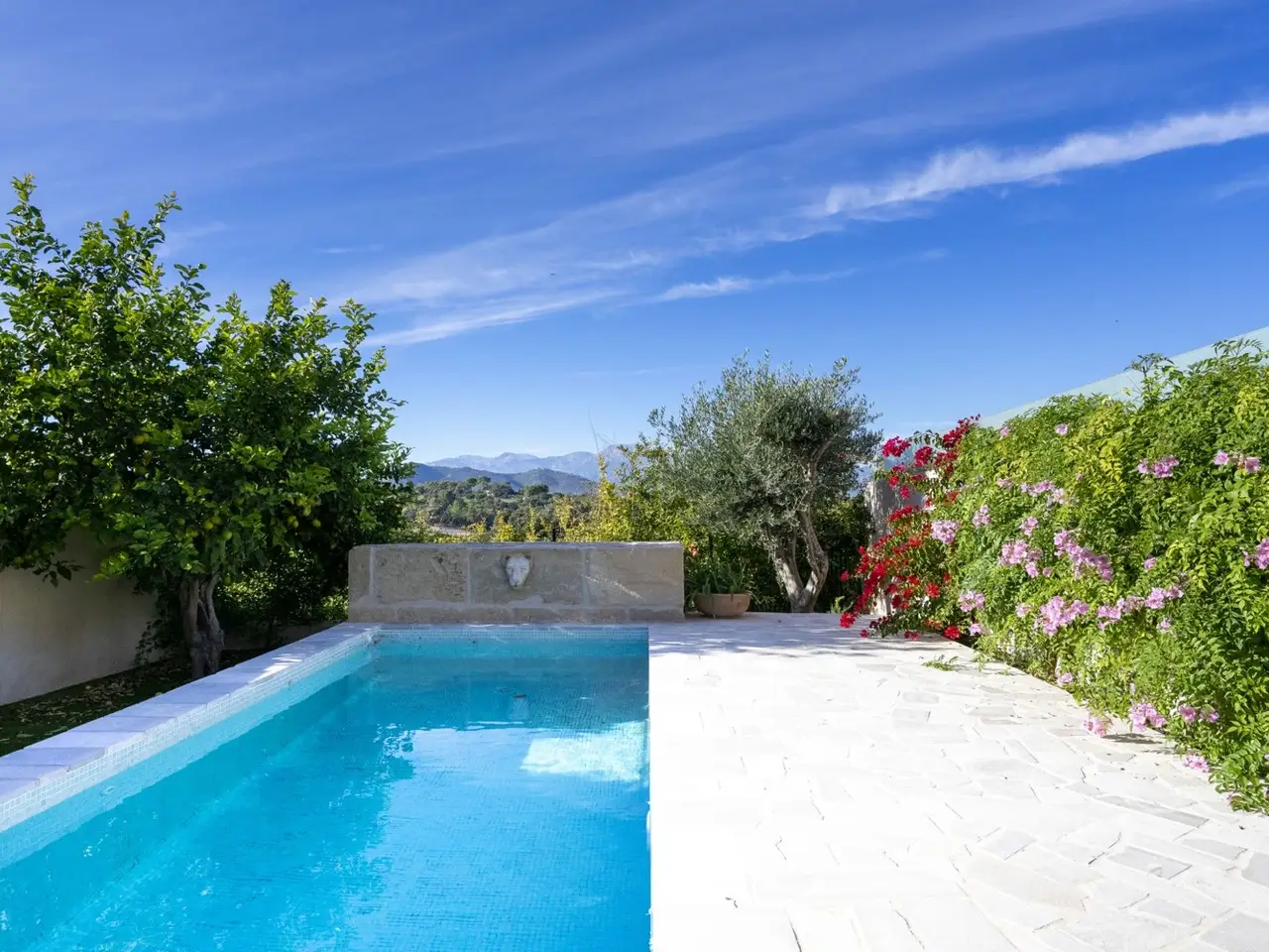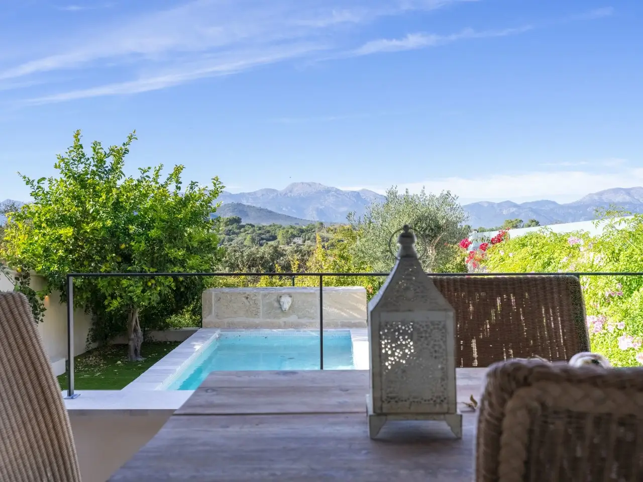 The lively village of Llubí is characterized by a lively village square, diverse shops and gourmet restaurants. Palma can be reached in thirty minutes, the beaches in the north, such as Can Picafort, are only twenty minutes away. The place also offers a train connection to Palma. The property impresses with spectacular views of the Tramuntana Mountains. The complex, complete renovation included careful insulation, the use of high-quality materials and extremely comprehensive equipment, which has just been completed. The open living area flows seamlessly into the covered terrace (11m²) with the pool in front of it (7 x 2.5 m) and the garden. From the upper bedroom at the rear there is another terrace (21m²). The distribution of the house with approx. 207m² of area, of which 11m² is garage, includes on the ground floor a living/dining area with an open kitchen, a side room, a double bedroom with its own bathroom, another bathroom, a storage room (with preparation for a sauna) and a garage for one car. On the upper floor there are two double bedrooms with en suite bathrooms. The facilities include partially furnished rooms, ceramic tiles and parquet, a fireplace, fitted wardrobes, showers and bathtub, double glazing, smart home technology, underfloor heating, air conditioning (hot/cold), heat pump, photovoltaics, water softener, satellite TV, an outdoor shower and automatic garden irrigation.