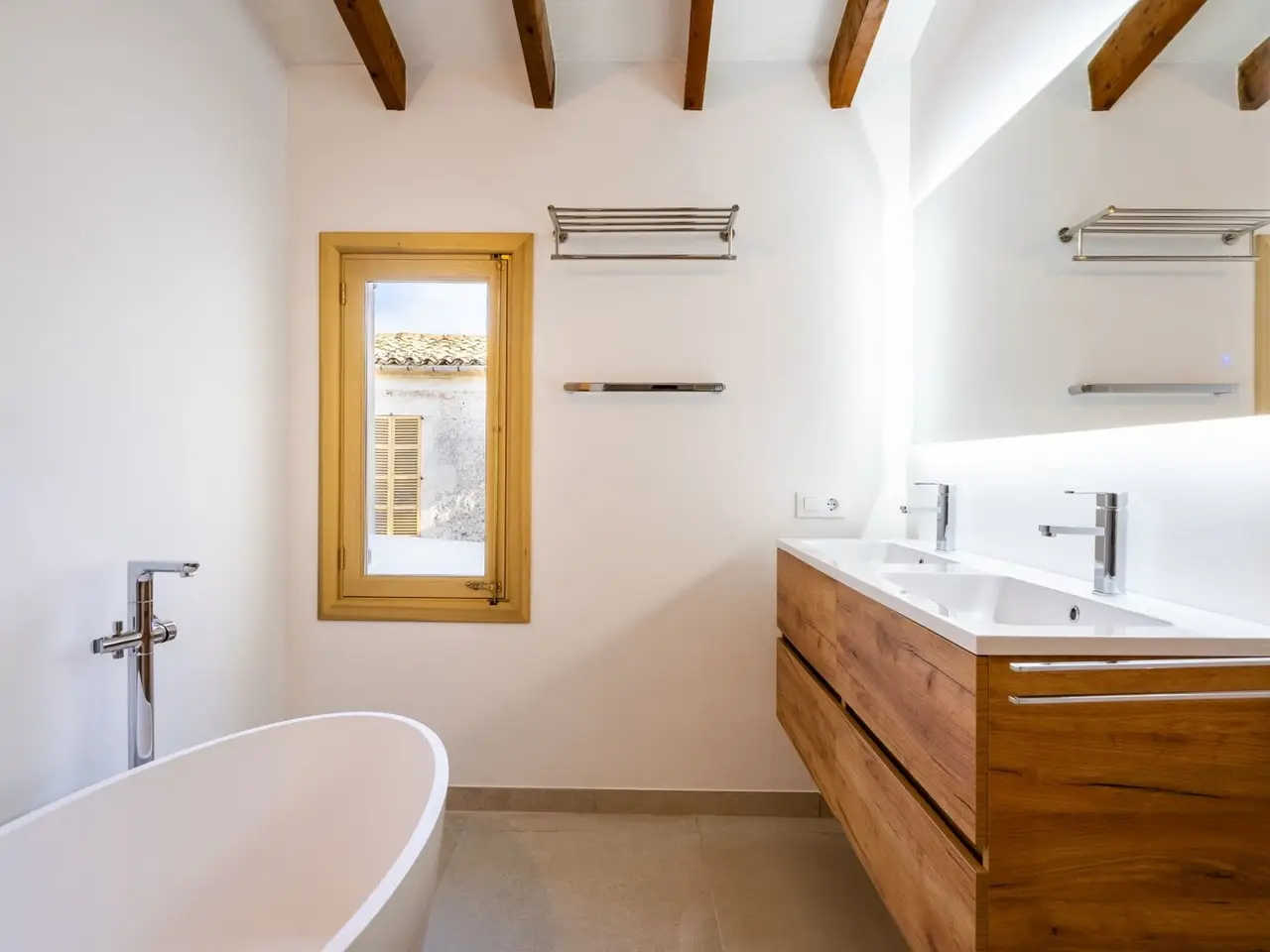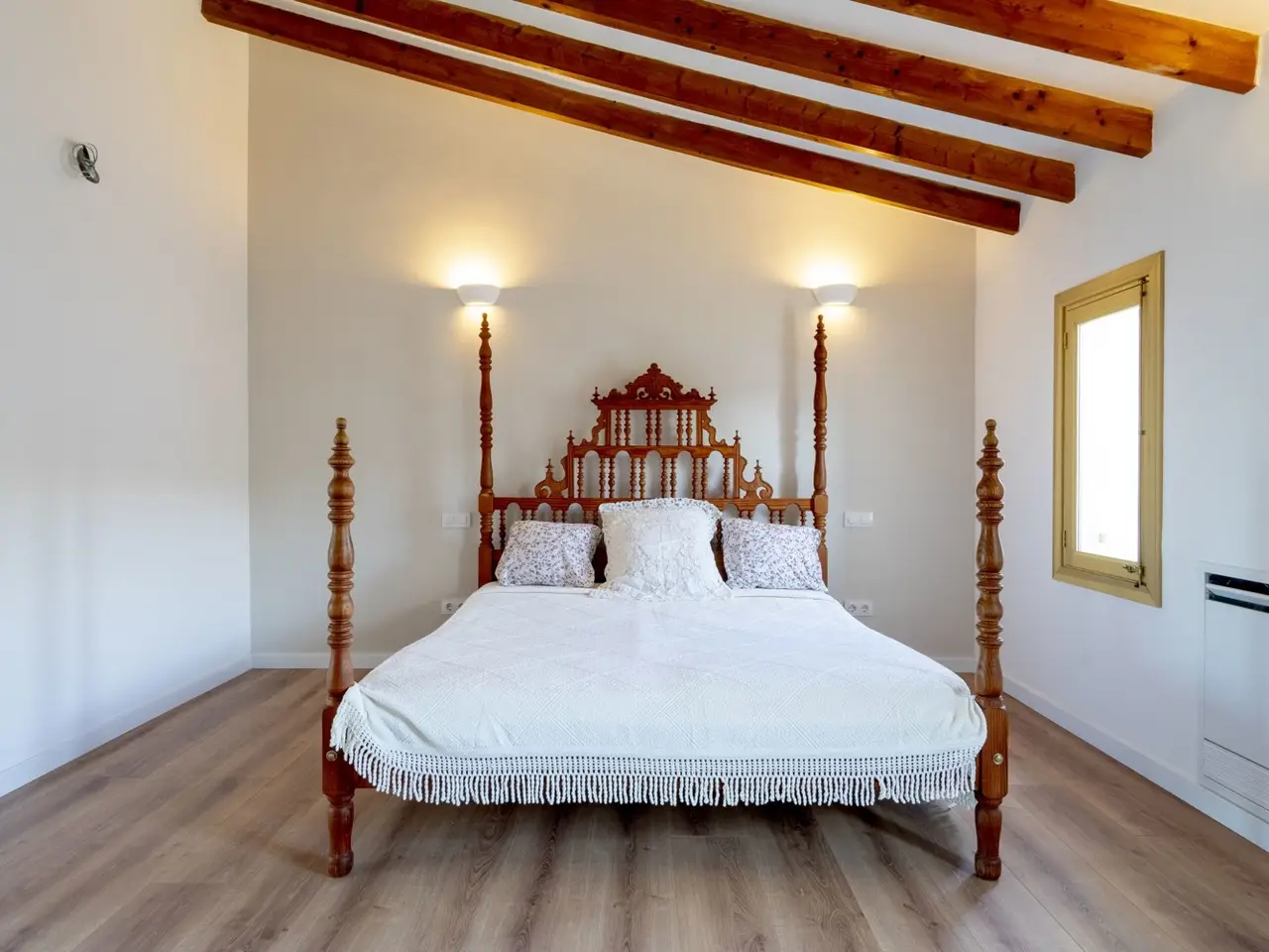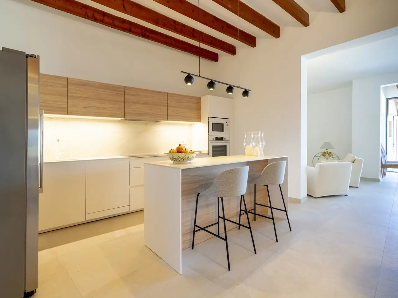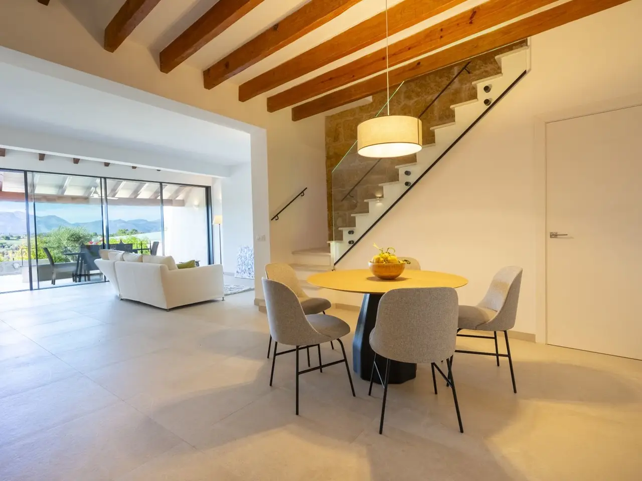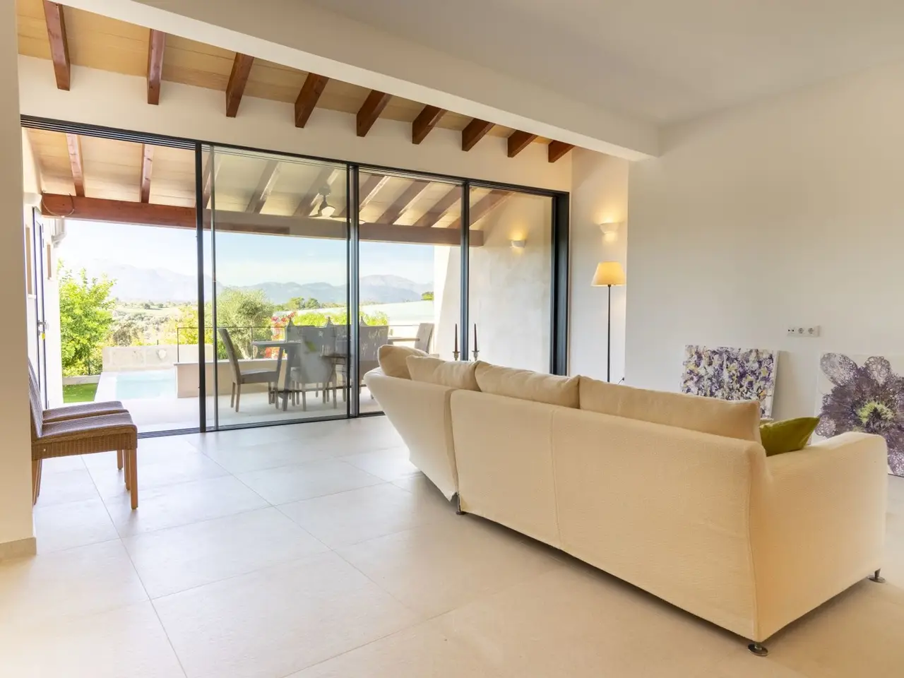 The lively village of Llubí is characterized by a lively village square, diverse shops and gourmet restaurants. Palma can be reached in thirty minutes, the beaches in the north, such as Can Picafort, are only twenty minutes away. The place also offers a train connection to Palma. The property impresses with spectacular views of the Tramuntana Mountains. The complex, complete renovation included careful insulation, the use of high-quality materials and extremely comprehensive equipment, which has just been completed. The open living area flows seamlessly into the covered terrace (11m²) with the pool in front of it (7 x 2.5 m) and the garden. From the upper bedroom at the rear there is another terrace (21m²). The distribution of the house with approx. 207m² of area, of which 11m² is garage, includes on the ground floor a living/dining area with an open kitchen, a side room, a double bedroom with its own bathroom, another bathroom, a storage room (with preparation for a sauna) and a garage for one car. On the upper floor there are two double bedrooms with en suite bathrooms. The facilities include partially furnished rooms, ceramic tiles and parquet, a fireplace, fitted wardrobes, showers and bathtub, double glazing, smart home technology, underfloor heating, air conditioning (hot/cold), heat pump, photovoltaics, water softener, satellite TV, an outdoor shower and automatic garden irrigation.