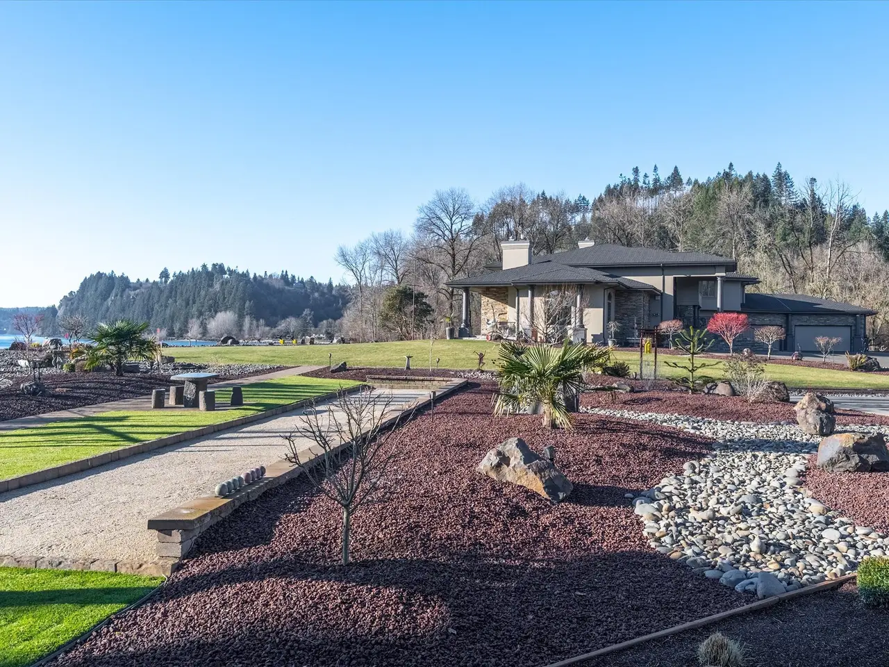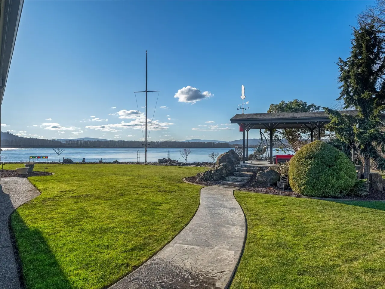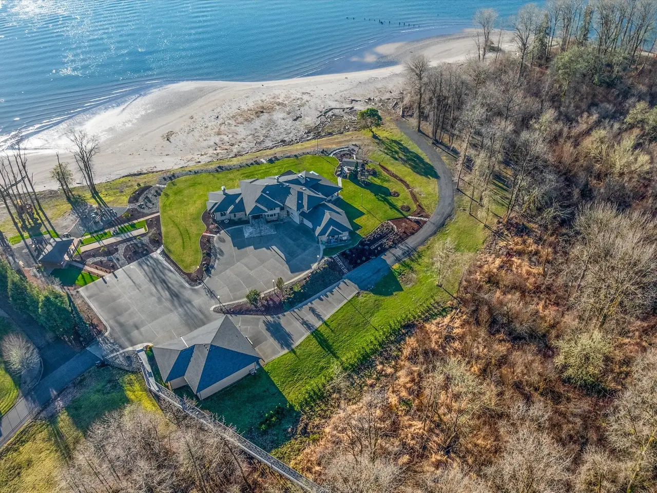 Stunning waterfront estate offers an unparalleled lifestyle, with 16 acres of privacy surrounded by water on three sides. Over 1,000 feet of sandy Columbia River beach and breathtaking views from nearly every room in the 7,280 sq ft home. Picturesque boardwalk leads to the 80-ft long boat dock, ideal for water adventures. Completely remodeled open kitchen is a chef’s dream with 3 ovens, quartz counters, and so much more. River front gazebo is perfect for hosting large gatherings with a full kitchen and the option to enclose-complete with playground, gas fire pit and more. 4 bedrooms, office, 2 versatile flex rooms and 5 bathrooms. Primary suite is an oasis of comfort you'll never want to leave. Garage parking for at least 10 cars and an RV.