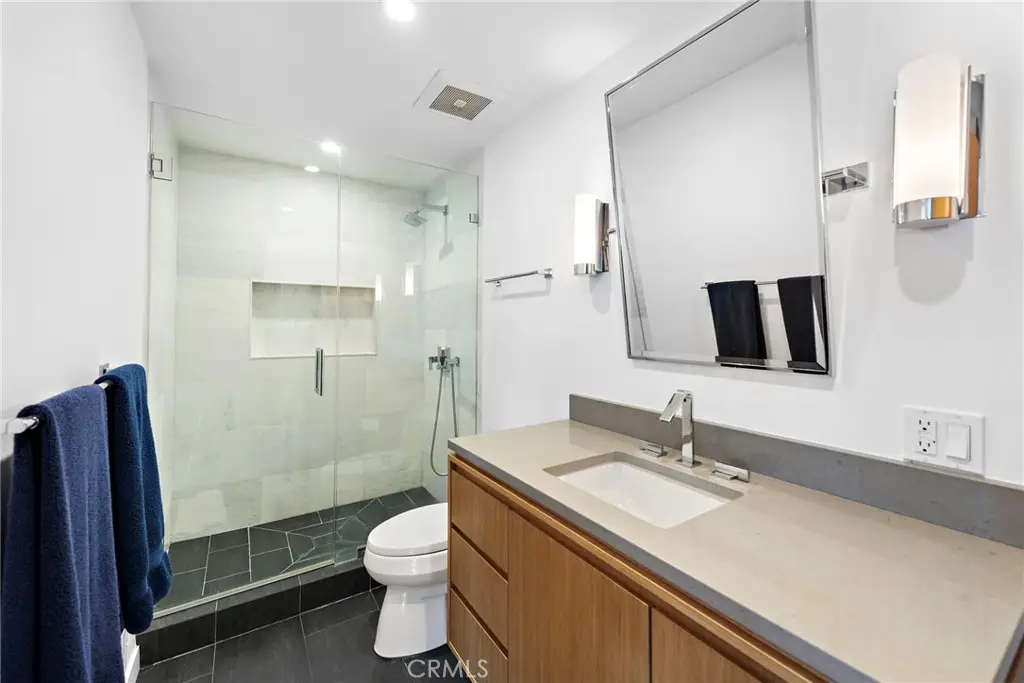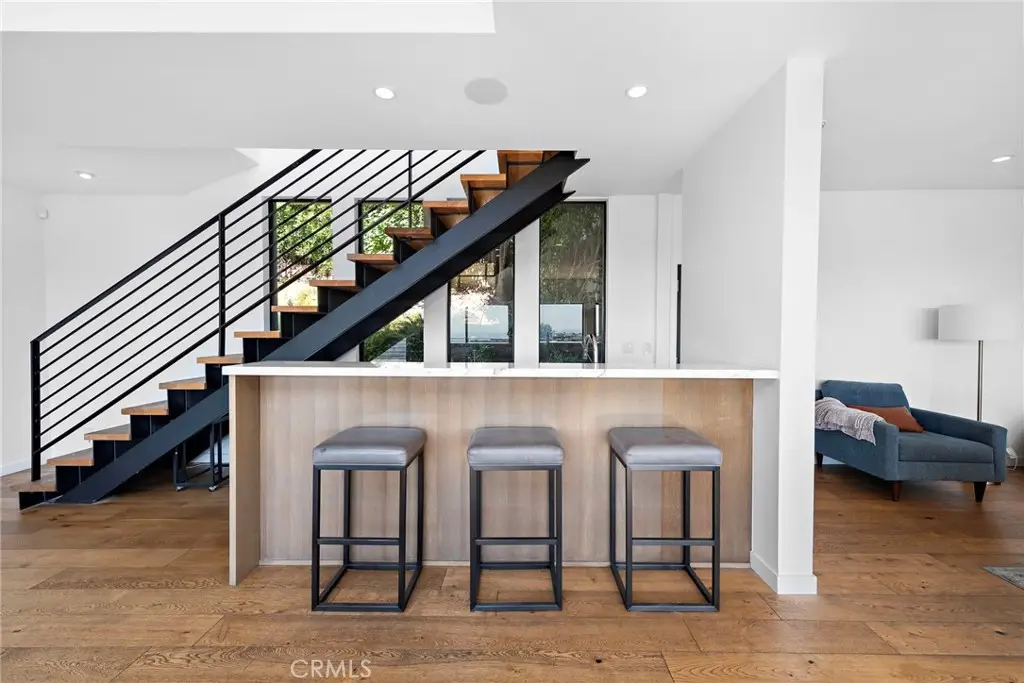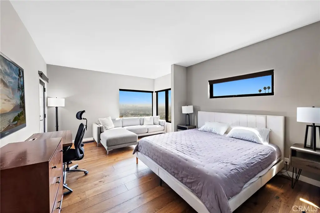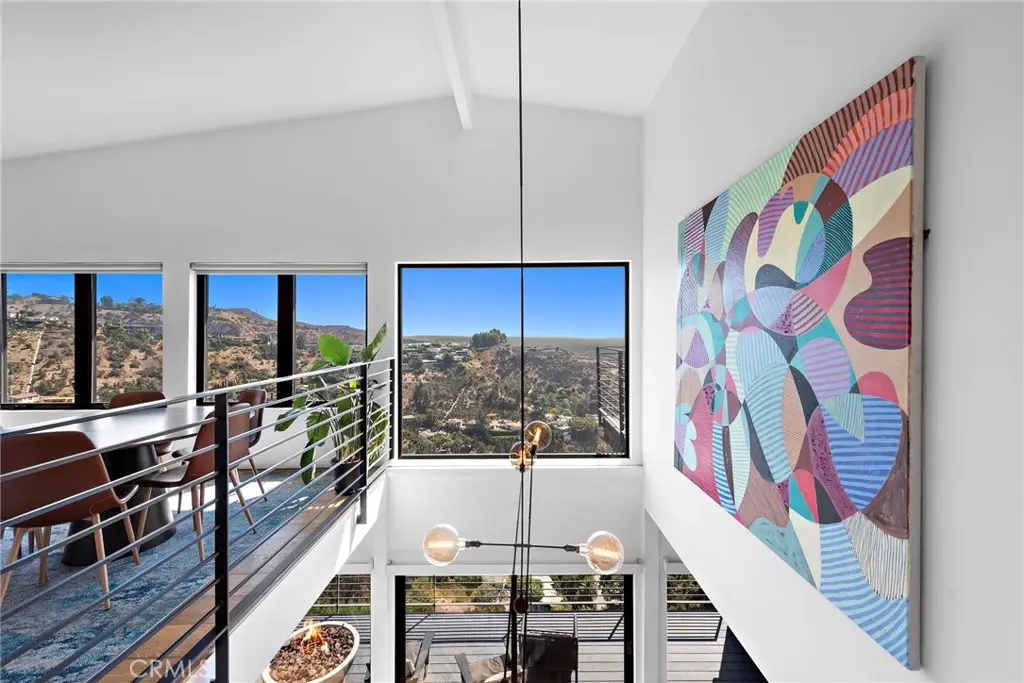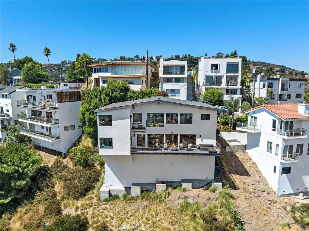 Nestled in the Hollywood Hills, sits this beautifully designed home with breathtaking views of the city below. Despite its secluded and private setting, this is just moments away from the vibrant energy the city has to offer. Having the perfect balance between tranquility and urban convenience, the home allows you to retreat into your own world while still being minutes from the heart of LA's most iconic destinations. The open-concept design invites seamless entertaining with its wet bar, fireplace, and soaring ceilings. The interiors feature oak floors and Caesarstone countertops adding warmth and texture, while panoramic views provide a stunning backdrop. With Viking appliances, a spacious island with seating, and a charming dining nook, this kitchen is perfect for the gourmet chef or casual cook. The primary suite features a corner window framing spectacular views, a walk-in closet, private balcony, and a bathroom with both a soaking tub and a walk-in shower. The front deck, complete with a fire pit, offers the perfect perch to enjoy the glittering LA skyline.