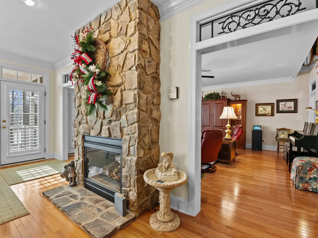 Discover the perfect blend of elegance, functionality, and unparalleled main water views in this meticulously maintained Multigenerational Waterfront home. Designed for luxurious lakeside living, this exceptional property offers lush landscaping and an enchanting rolling water Koi Pond, all set within a serene and private setting. Enjoy a relaxing ride on your boat or jet ski right from your own dock! The main level features the Primary Suite, a gorgeous Kitchen and separate Breakfast area, there's a formal Dining Room, a Parlor, and a stunning center room Fireplace open to both the Kitchen and Living Room! The Second level offers two additional bedrooms, a full bathroom, a home office, and a massive Bonus/Flex/Playroom! The finished Daylight Walk-out Basement boasts a 2nd Full Kitchen, a Living Room w/ Fireplace, a Flex Room that can be used as a 4th Bedroom, a Full Bathroom, and two unfinished areas for Workshop/Hobby Rooms! All of this in a gated lake community with a private police department, community amenities include boating, fishing, beaches, and two free memberships to The River 18-hole professional Golf Course.