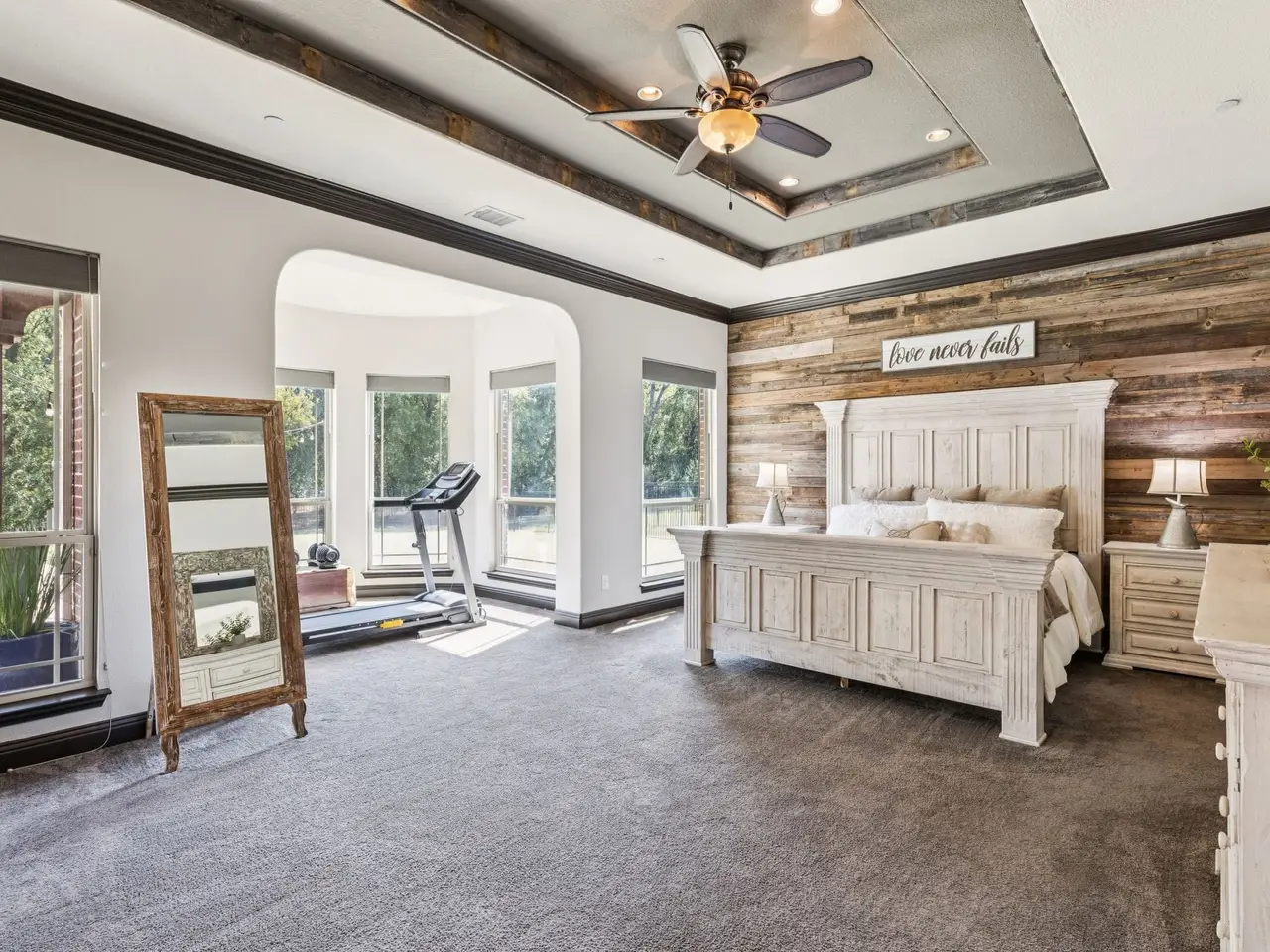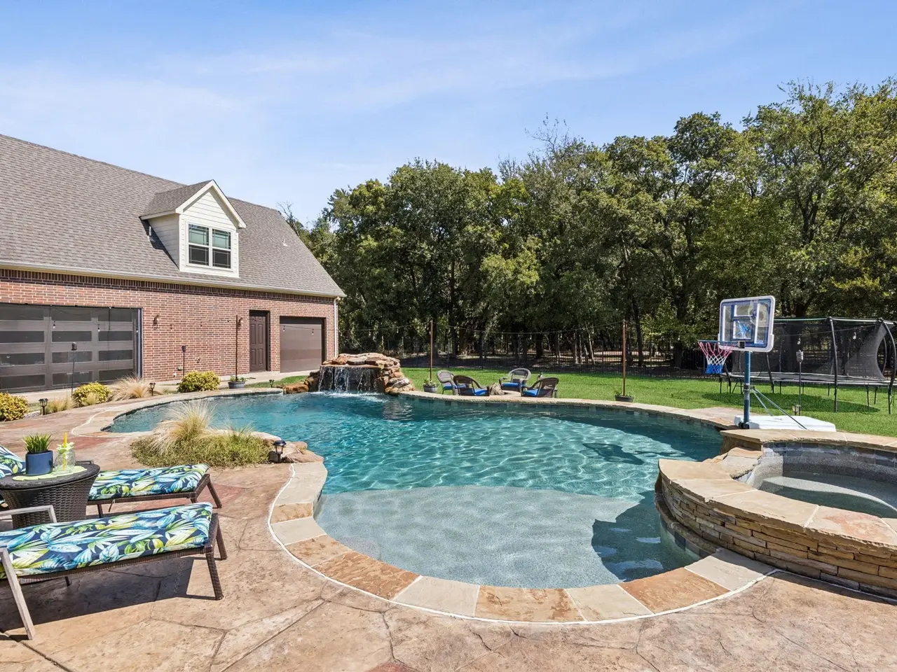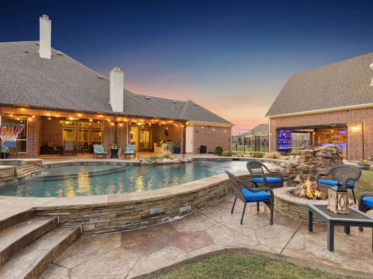 Welcome to your private retreat - an EXTRAORDINARY FAMILY ESTATE OFFERING NEARLY 8000sqft OF COMBINED LIVING SPACE which incl the primary residence plus GUEST HOUSE & ULTIMATE MAN CAVE all nestled on 2.65 acres backing to a serene wooded creek. From the moment you arrive, the striking brick and stone architecture, turret detail, and expansive landscaping set the tone for something truly special. Step inside to soaring vaulted ceilings with wood beams, warm wood floors and brick wall accents. The chef's kitchen is a dream with Electrolux appliances, dbl ovens, granite counters, prep sink, RO water system and abundant cabinetry. Entertain with ease in the oversized living areas, game room & media room with Sony projector, speakers, wet bar and wine fridge. Every detail has been carefully planned from the whole-home water softener and filtration system to the thoughtful layout. Downstairs, the luxurious primary suite awaitsfeaturing a sitting area, spa-inspired bath with stone walls, earthy textures and a multi-head rain shower. The private downstairs in-law suite with full bath is perfect for guests. Upstairs the secondary bedrooms are generously sized. Don't miss the closets that can double as study or hang out spaces! Outdoor resort-style living can be enjoyed year-round amidst twinkling Edison lights. The covered patio and pergola feature a built-in kitchen and FP with plenty of room for dining and lounging. The sparkling pool incl a spa and waterfalls with firepit nearby for cool evenings. The separate guest house not only features a fitness and sports enthusiasts ideal man cave complete with industrial finishes, but also a home office and private guest suite. Amenities include a bar, island, home gym, hardwiring for media and CAT7 for hi-speed network. Parking is abundant with two 2-car garages and porte cochere. This property blends comfort, sophistication, and functionality in a way that's rare to find. Don't miss the chance to experience all it has to offer.