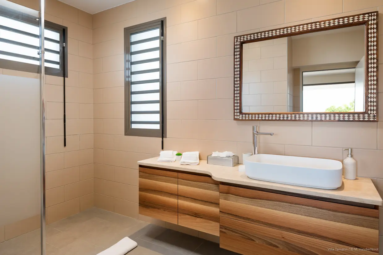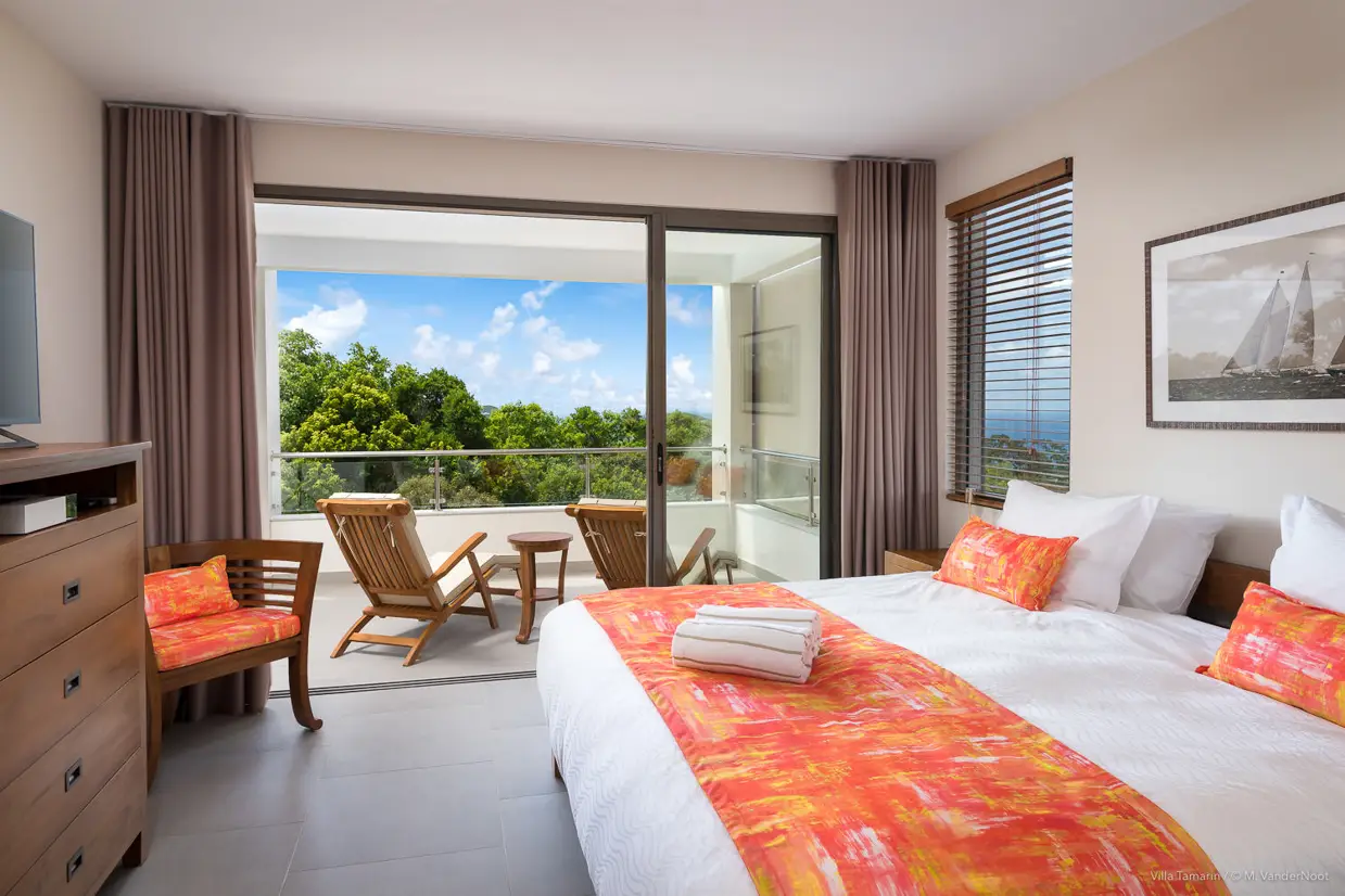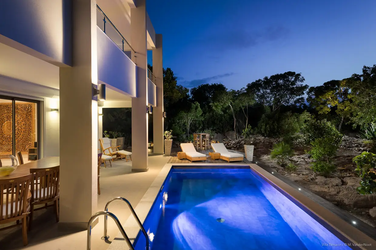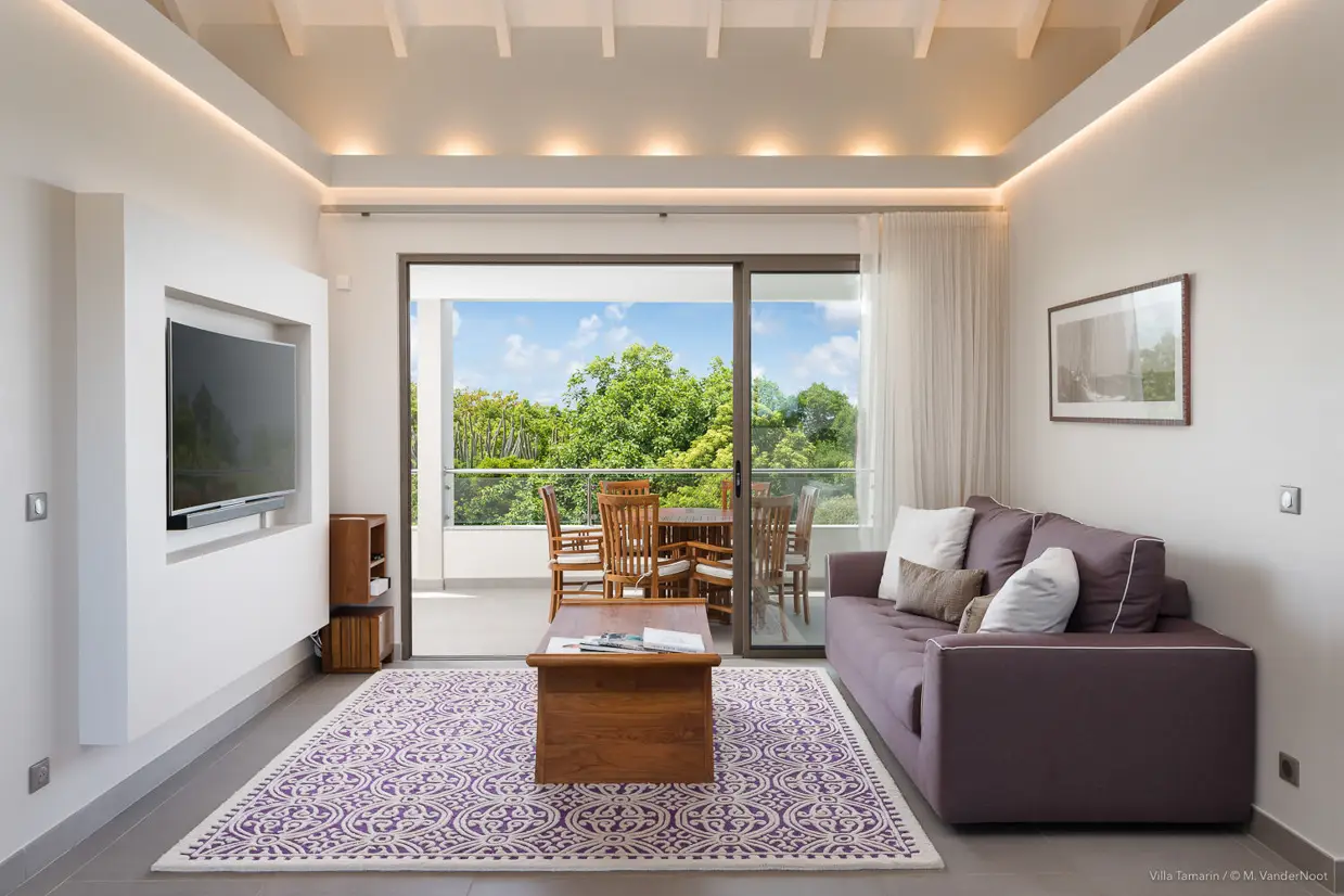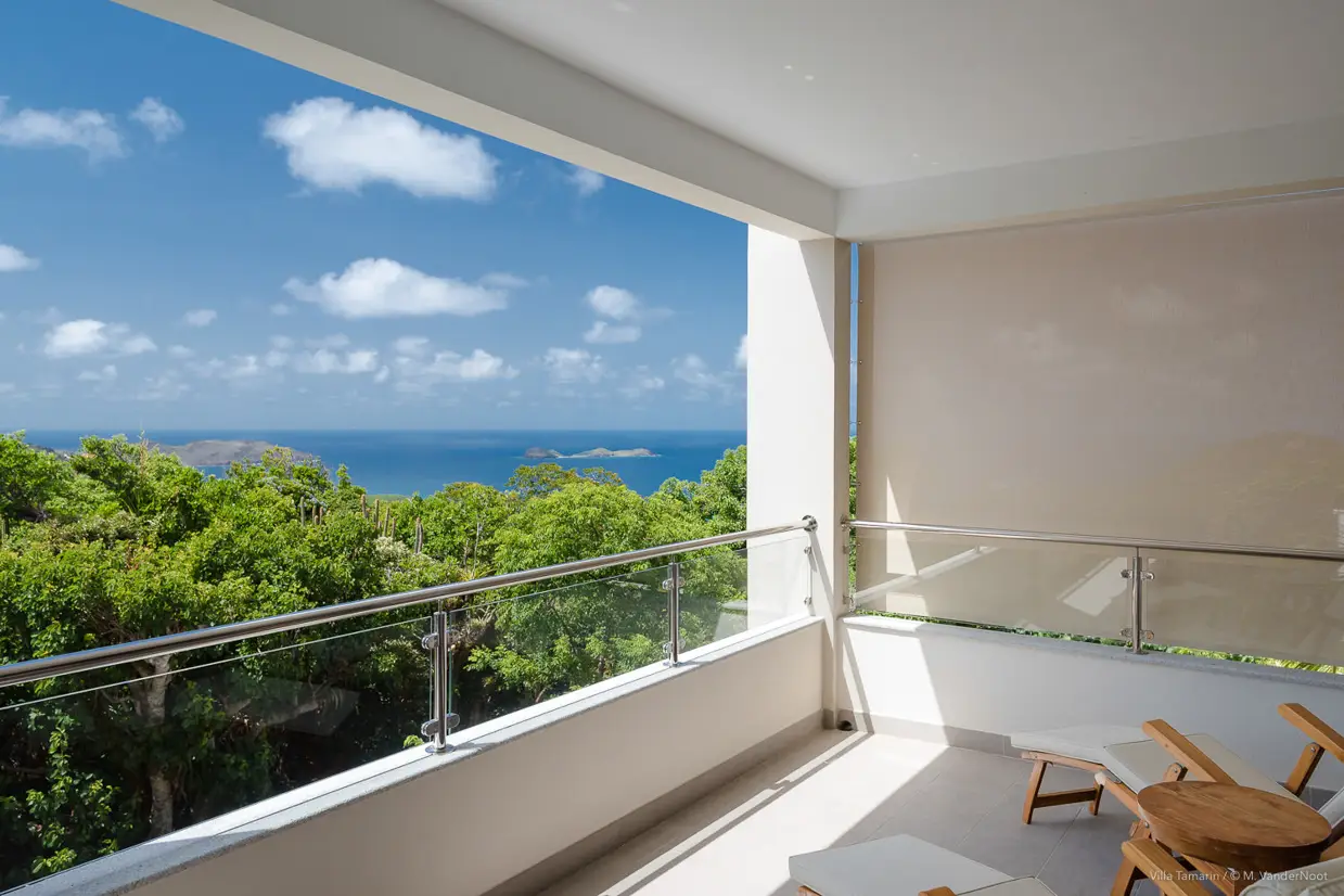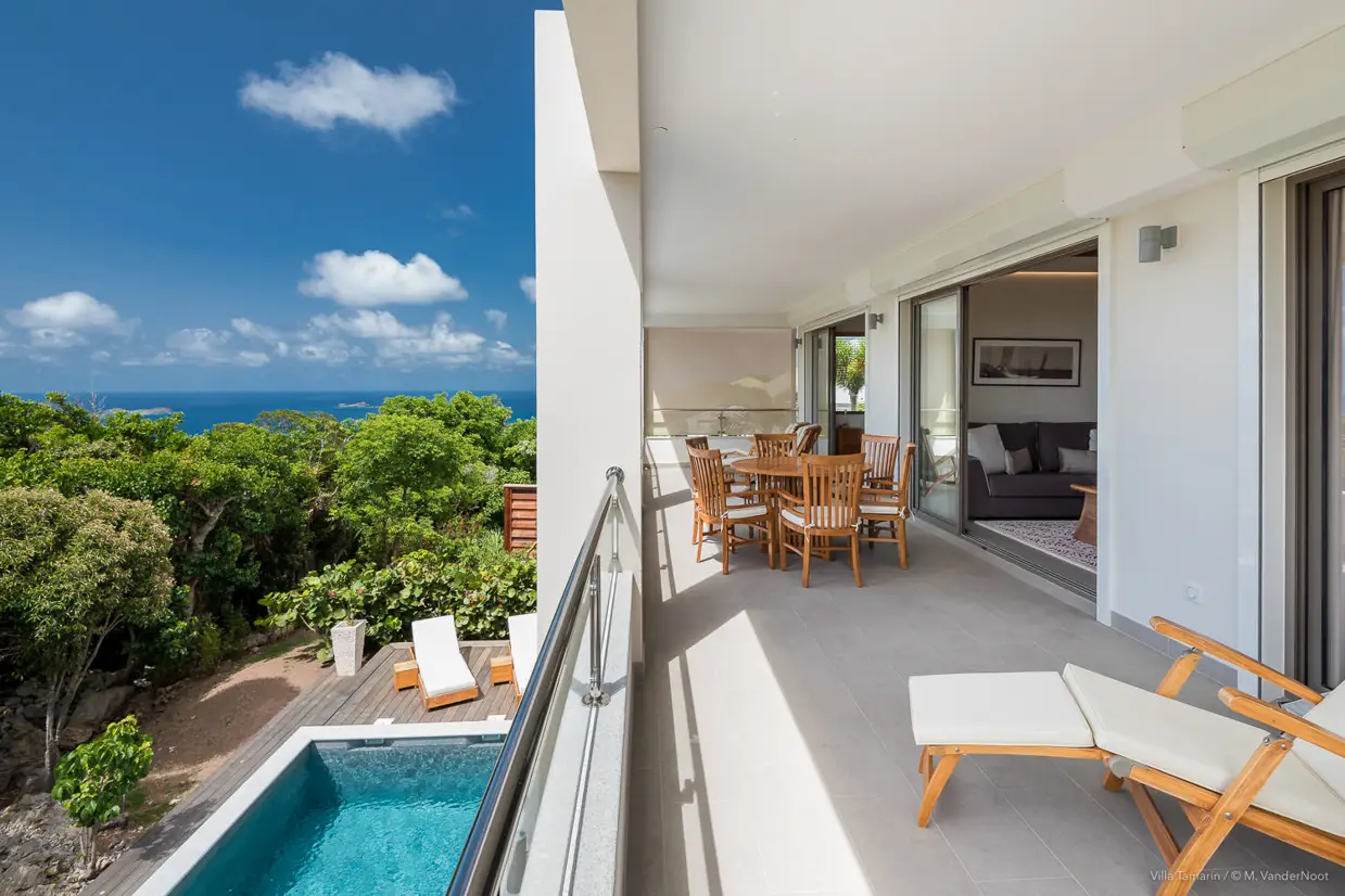Villa Tamarin is a contemporary-style property located in the hills of Lurin, just a few minutes’ drive from the shops of Gustavia and the beaches of Gouverneur and Saint-Jean. Spread over two levels, the villa offers a warm and welcoming atmosphere, with a décor that combines wood elements with vibrant touches of color. The bright living room opens onto a fully equipped open-plan kitchen. This space leads out to a large terrace with a heated pool and sun loungers. A covered section of the terrace allows for outdoor dining at any time of day, in a peaceful setting surrounded by lush vegetation. The primary bedroom is just a few steps from the pool. An exterior staircase leads to the upper level, which features two comfortable bedrooms separated by a second living area with a kitchen corner. Each room opens onto a covered terrace with nice views of the sea and the surrounding islets.