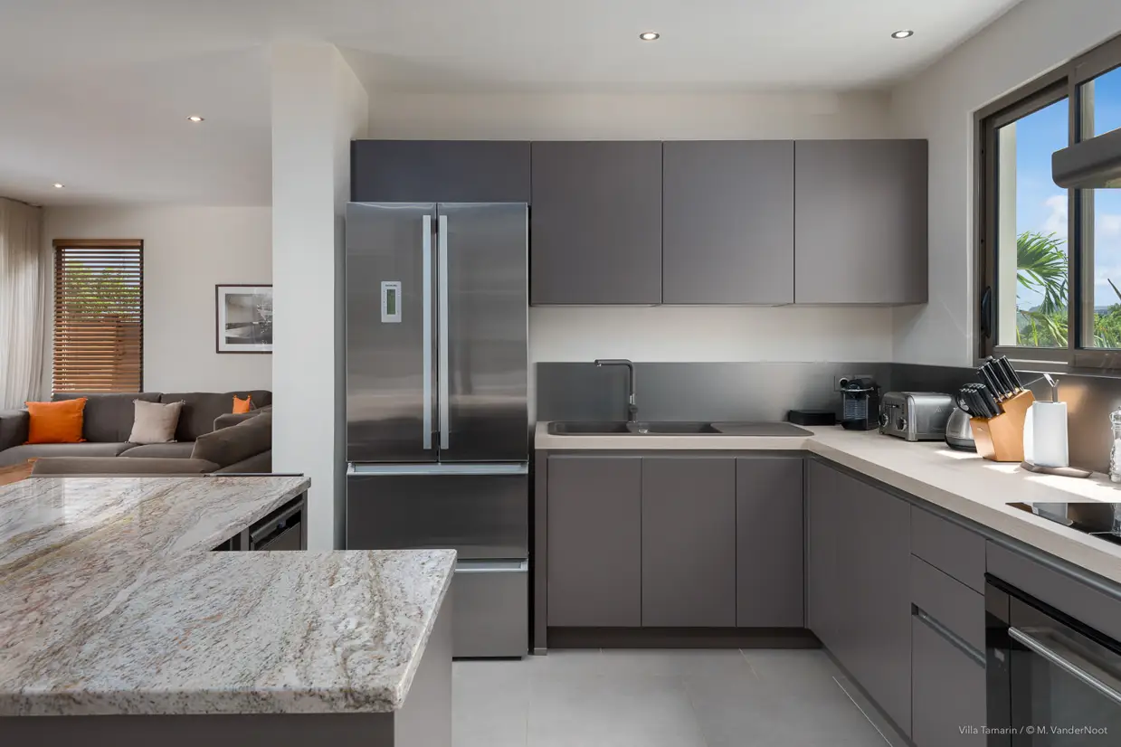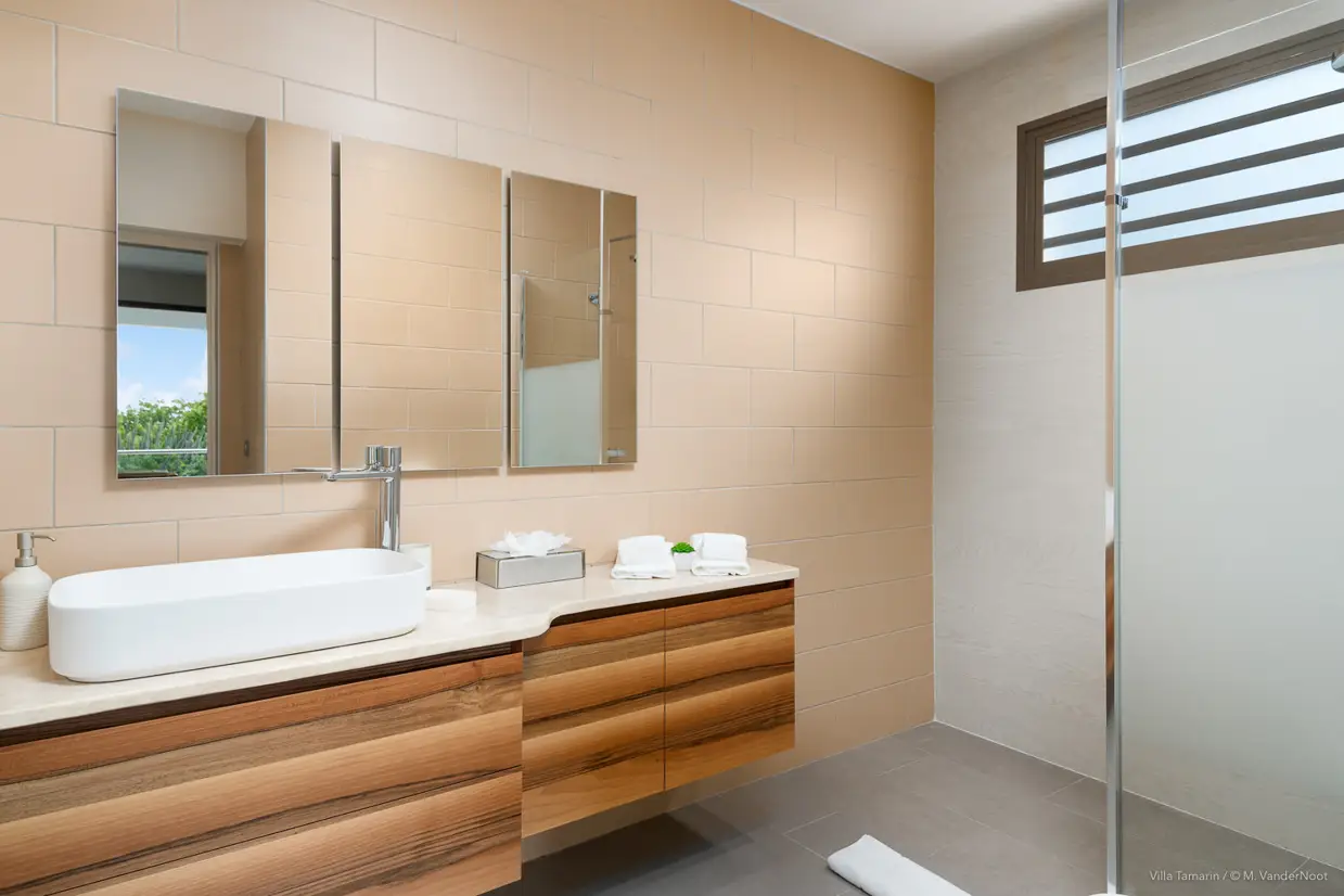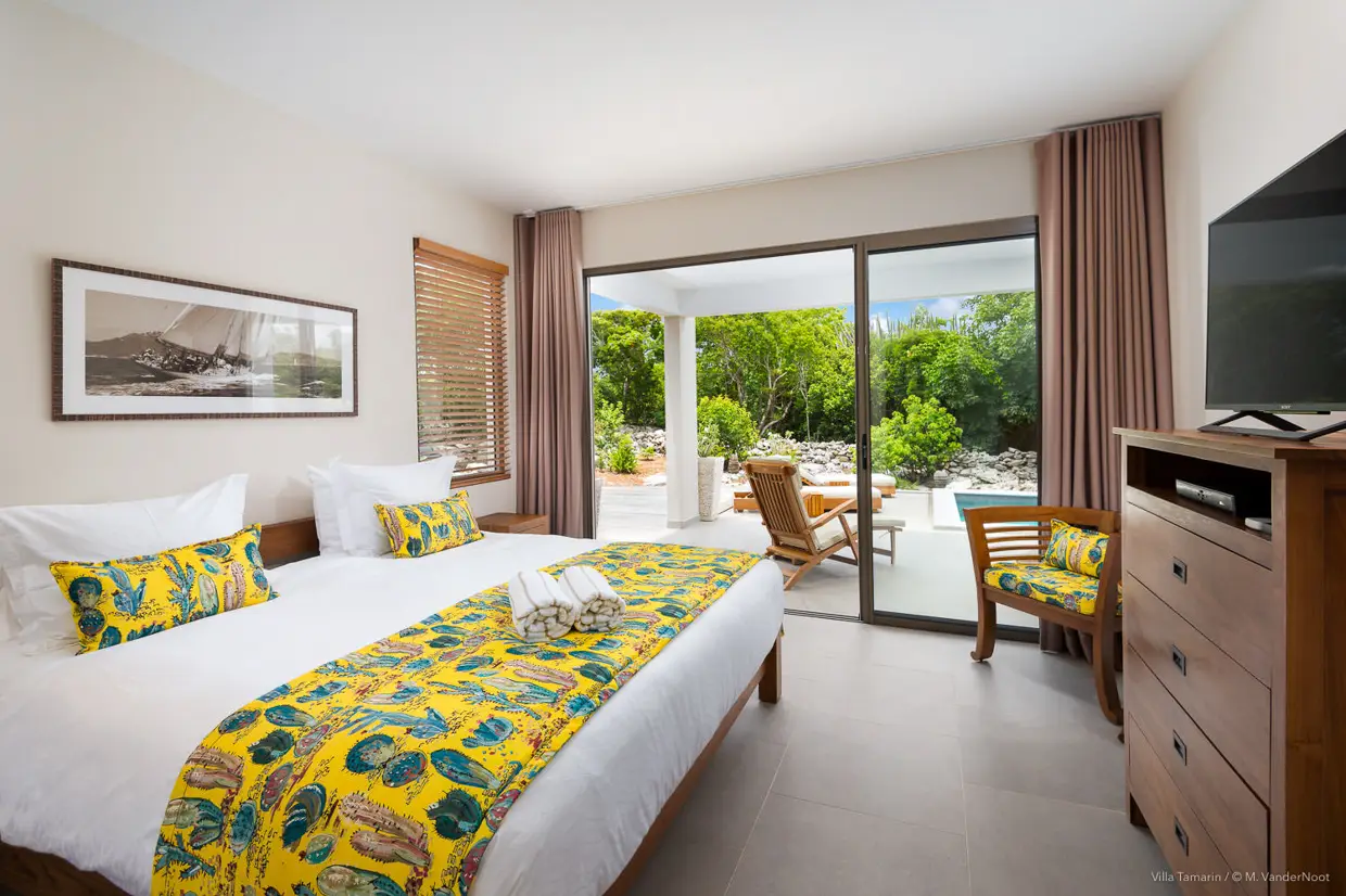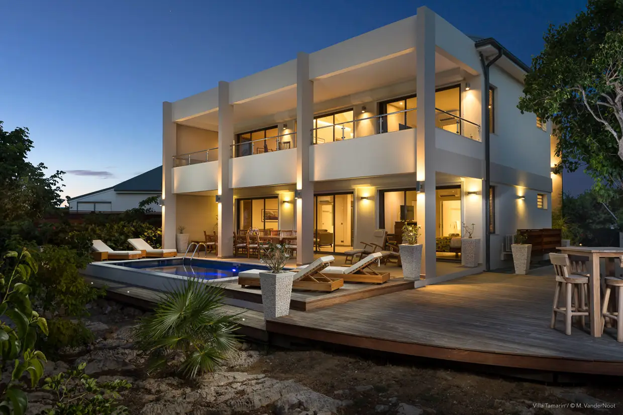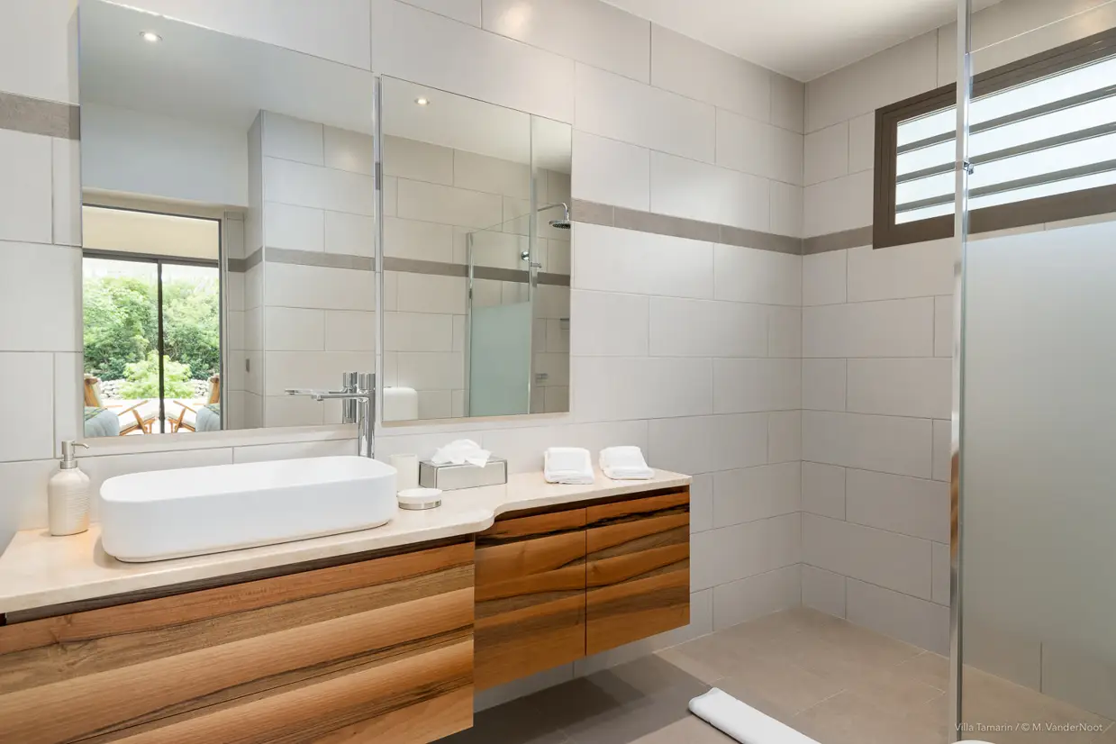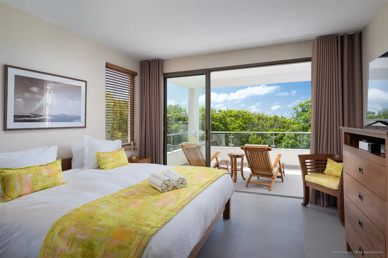 Villa Tamarin is a contemporary-style property located in the hills of Lurin, just a few minutes’ drive from the shops of Gustavia and the beaches of Gouverneur and Saint-Jean. Spread over two levels, the villa offers a warm and welcoming atmosphere, with a décor that combines wood elements with vibrant touches of color. The bright living room opens onto a fully equipped open-plan kitchen. This space leads out to a large terrace with a heated pool and sun loungers. A covered section of the terrace allows for outdoor dining at any time of day, in a peaceful setting surrounded by lush vegetation. The primary bedroom is just a few steps from the pool. An exterior staircase leads to the upper level, which features two comfortable bedrooms separated by a second living area with a kitchen corner. Each room opens onto a covered terrace with nice views of the sea and the surrounding islets.