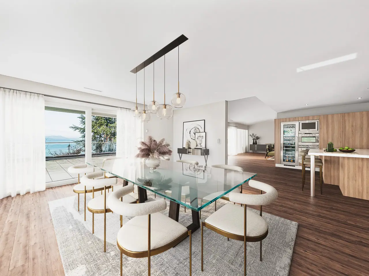 Discover this duplex penthouse apartment, located in a prestigious residence composed of two apartments. This exceptional property, spread over two floors, offers breathtaking views of Lake Geneva, blending modernity and elegance in an idyllic setting. The first level, spanning 136 sqm, opens onto a vast 180-sqm terrace, perfect for enjoying the stunning lake & Alps panorama. This level features four bedrooms, including two en-suites. The master suite is a true invitation to relaxation, with an open bathroom equipped with a shower and hammam, separate toilets, and a spacious walk-in closet. The second suite also has its own shower room and WC. Two additional bedrooms, an extra dressing room, and a bathroom with a shower and separate WC complete this floor. The second level, covering 160 sqm, is distinguished by its vast, light-filled living room, extended by a winter garden with direct access to a 107 sqm terrace wrapping around the floor. An elegant and functional open-plan kitchen seamlessly integrates with the dining area in this convivial living space. This floor also includes an en-suite bedroom with a shower room and separate WC, a guest WC, and an entrance with a cloakroom. The apartment benefits from four indoor parking spaces and a private garage (in addition), and two 12.5-square-meter cellars, providing generous storage space. A bright and elegant entry hall leads to the lift from the garage. The apartment benefits from Minergie-certified construction, ensuring high energy performance and a healthy living environment. For added convenience, central vacuuming is installed throughout the entire space. Additionally, the geocooling system provides natural and eco-friendly cooling during summer.
