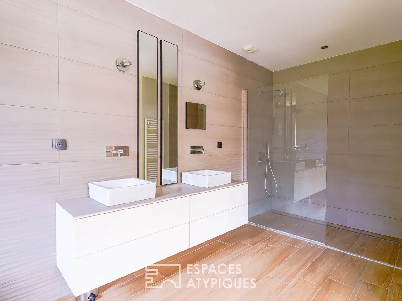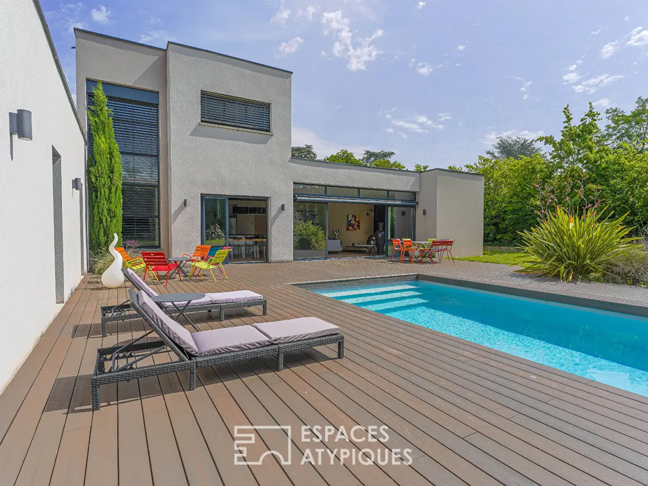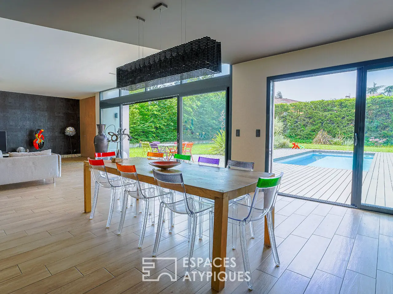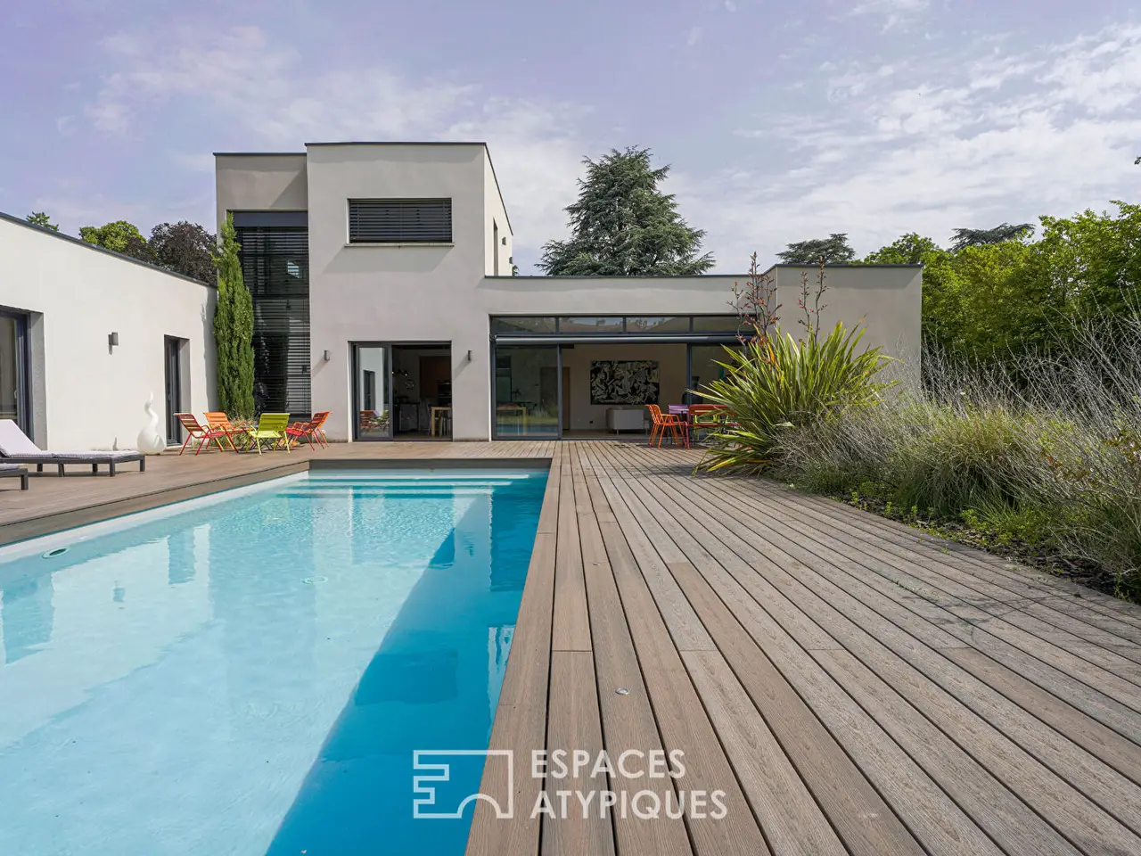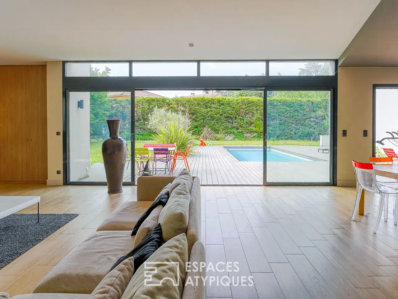 Located in the 5th arrondissement of Lyon, less than 10 minutes walk from Place Benedict Teissier, this magnificent architect-designed house of 346m2 is located on a tree-lined garden of 2040m2 in absolute calm. A perfect harmony emerges between its contemporary style and its quality services. The living rooms coexist in a vast volume, without doors, where circulation is free. Living room, living room and kitchen are cradled by generous openings, giving a glimpse of the garden and the swimming pool. Still on the ground floor, the sleeping area consists of two children's bedrooms sharing a bathroom and a master suite with a bathroom and dressing room. As if suspended, a flight of steps leads to the upper floor. A huge 25m2 office overlooks the garden. The lower level, also benefiting from independent access, is made up of three bedrooms, an office/dressing room, a games room and the machine room. Favorite a few minutes walk from the Point du Jour shops, this house will delight customers looking for modernity. Double garage and additional parking. Air/air heat pump: Underfloor heating Bose VMC double flow system Alarm ENERGY CLASS: B / CLIMATE CLASS: A Estimated average amount of annual energy expenditure for standard use, established from energy prices of the year 2023: between EUR1760 and EUR2430. REF. 4217EL Additional information * 8 rooms * 6 bedrooms * 2 bathrooms * 1 bathroom * Floor : 1 * Outdoor space : 2040 SQM * Property tax : 2 500 €