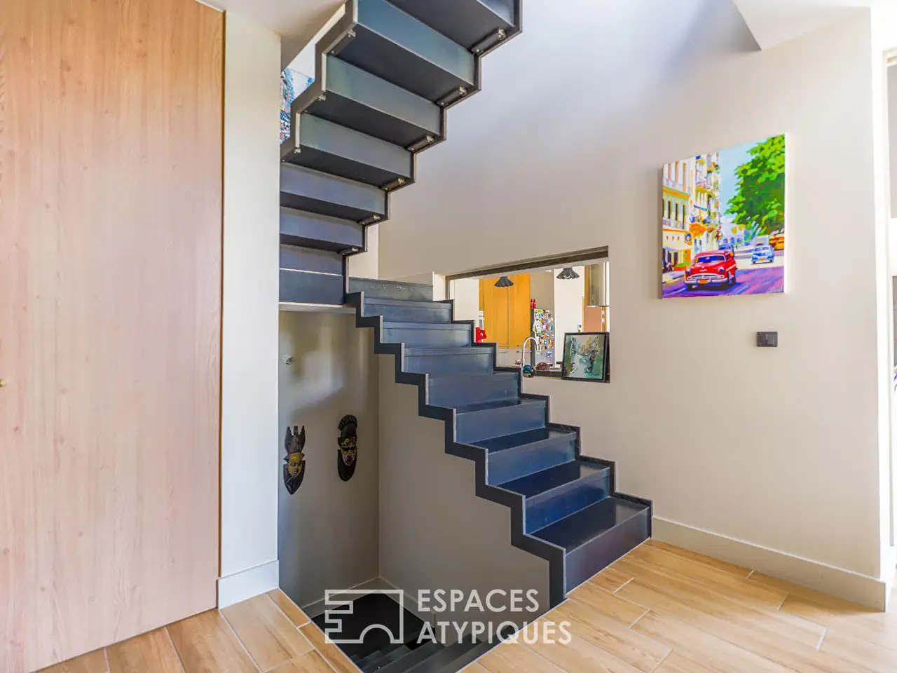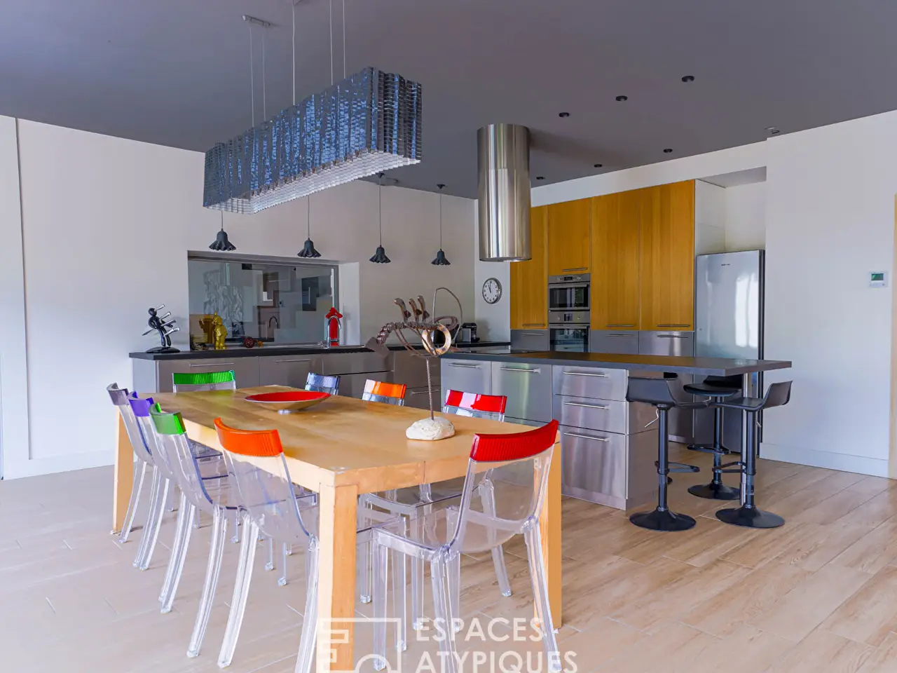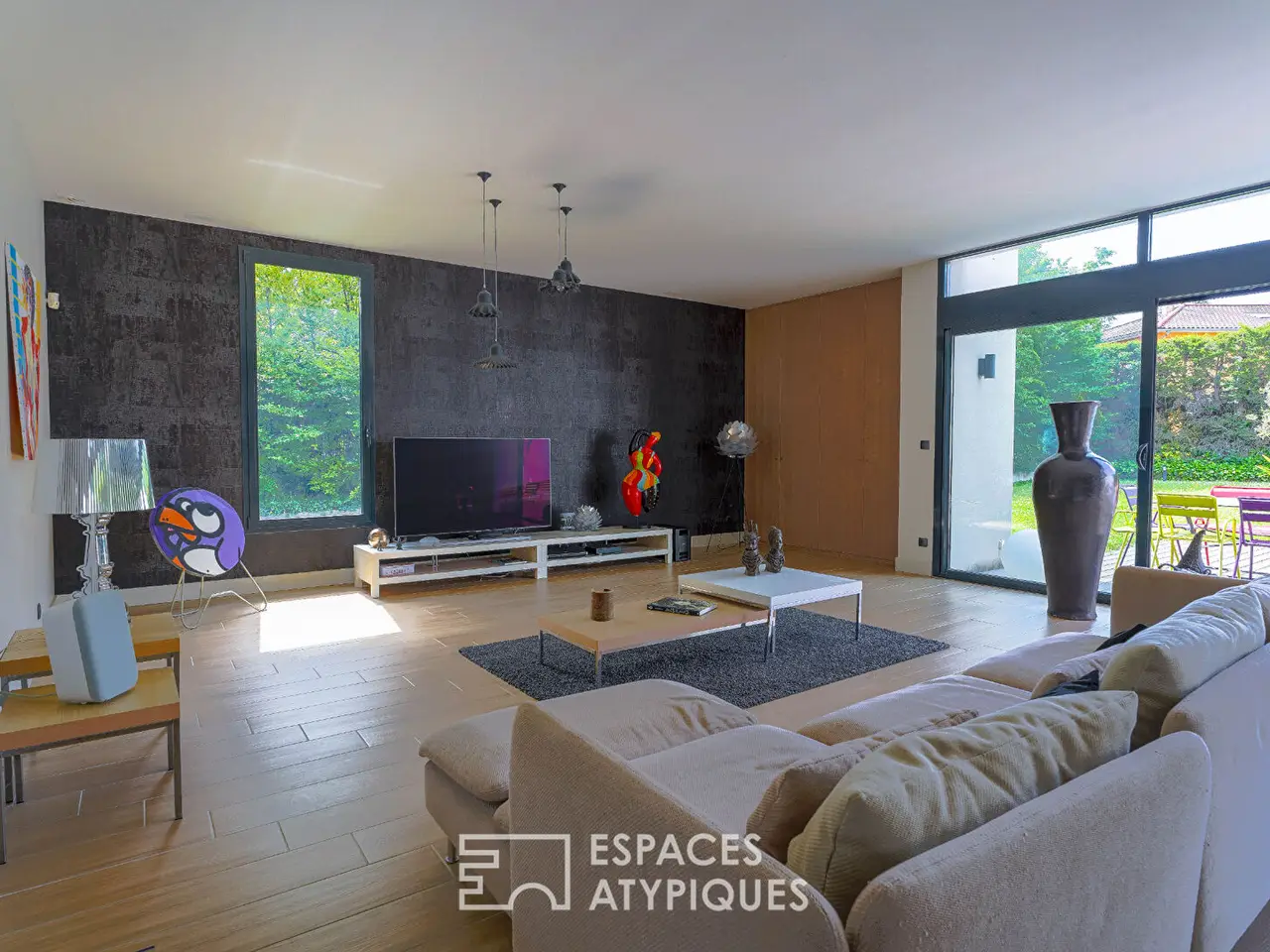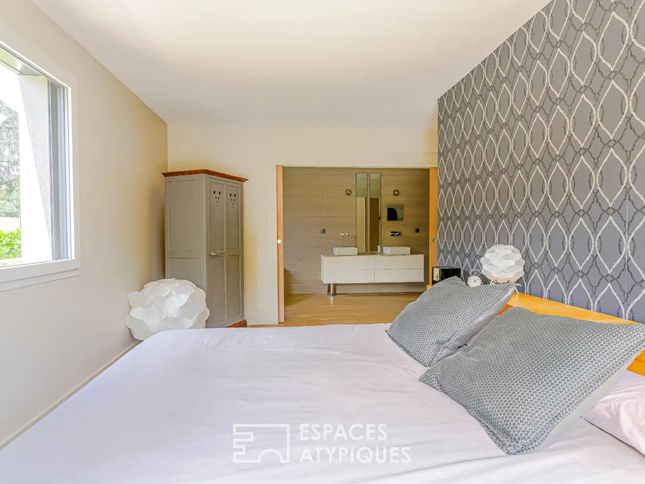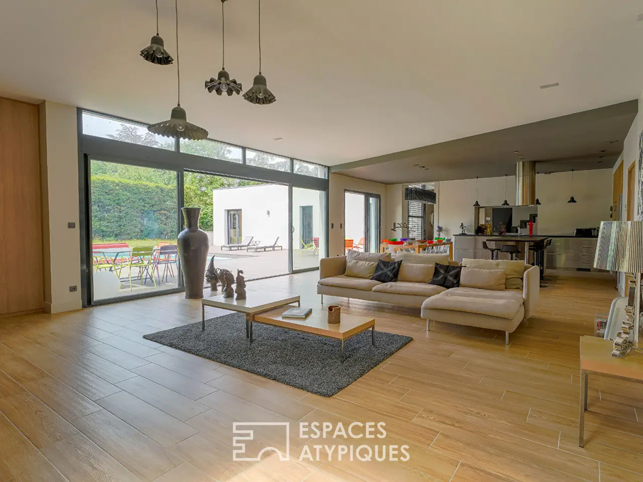 Located in the 5th arrondissement of Lyon, less than 10 minutes walk from Place Benedict Teissier, this magnificent architect-designed house of 346m2 is located on a tree-lined garden of 2040m2 in absolute calm. A perfect harmony emerges between its contemporary style and its quality services. The living rooms coexist in a vast volume, without doors, where circulation is free. Living room, living room and kitchen are cradled by generous openings, giving a glimpse of the garden and the swimming pool. Still on the ground floor, the sleeping area consists of two children's bedrooms sharing a bathroom and a master suite with a bathroom and dressing room. As if suspended, a flight of steps leads to the upper floor. A huge 25m2 office overlooks the garden. The lower level, also benefiting from independent access, is made up of three bedrooms, an office/dressing room, a games room and the machine room. Favorite a few minutes walk from the Point du Jour shops, this house will delight customers looking for modernity. Double garage and additional parking. Air/air heat pump: Underfloor heating Bose VMC double flow system Alarm ENERGY CLASS: B / CLIMATE CLASS: A Estimated average amount of annual energy expenditure for standard use, established from energy prices of the year 2023: between EUR1760 and EUR2430. REF. 4217EL Additional information * 8 rooms * 6 bedrooms * 2 bathrooms * 1 bathroom * Floor : 1 * Outdoor space : 2040 SQM * Property tax : 2 500 €