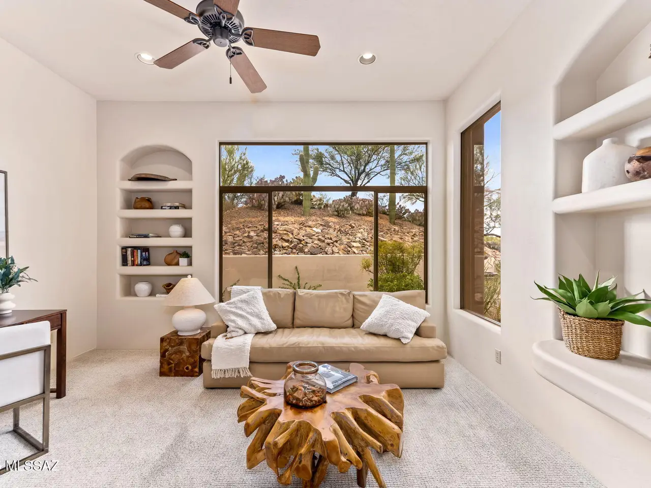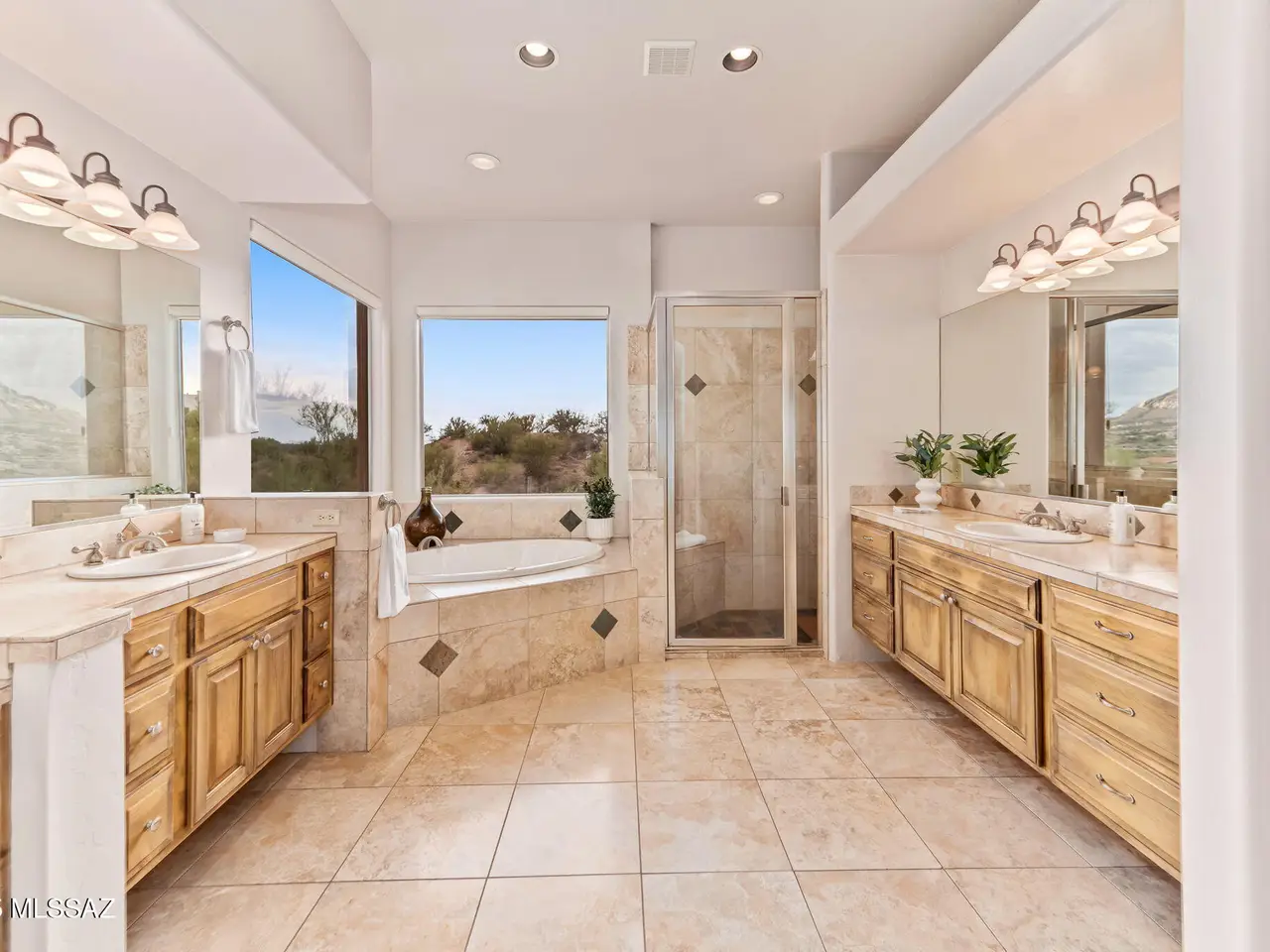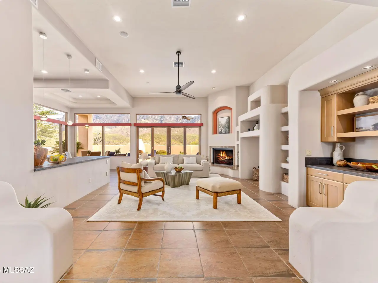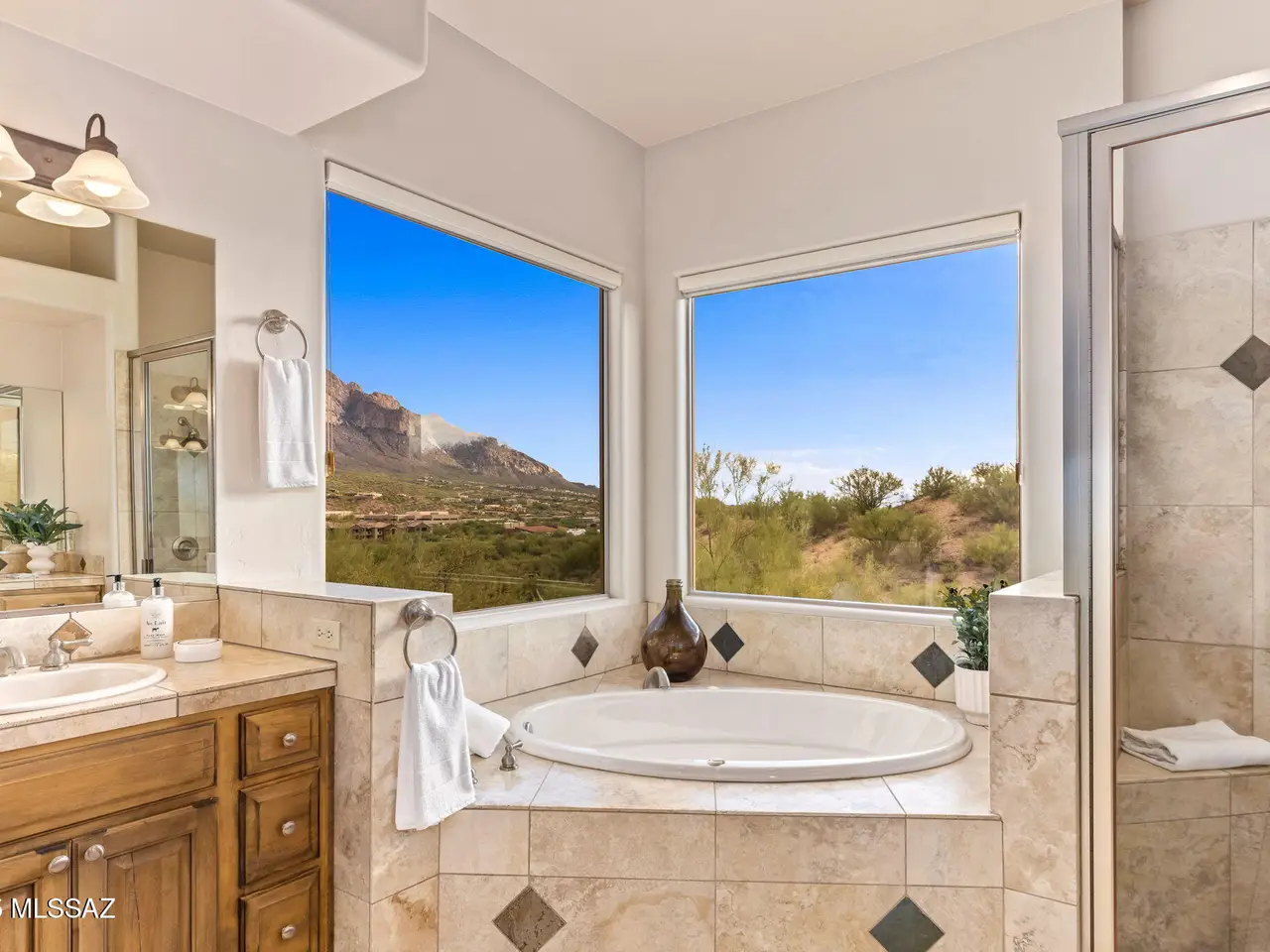 Welcome to your desert sanctuary! This 4-bed, 3-bath custom estate spans 3,282 sq ft on 2.68 private acres in a premier gated community and offers luxury, privacy, and sweeping Pusch Mountain views. The redesigned chef's kitchen with SS slate appliances, custom Alder cabinetry, and Dekton countertops flows into indoor/outdoor living spaces designed for entertaining. The large primary suite boasts soaring ceilings, a kiva fireplace, and spa-like bath. Outside, enjoy a heated resort-style pool and spa framed by desert beauty. There's plenty of seating areas to enjoy the view from both under the patio cover or on a turf area. Enjoy the outdoor Kiva fireplace on cool evenings. The vacant lot next door is also for sale, creating a retreat of more than 5 acres in the heart of Oro Valley.