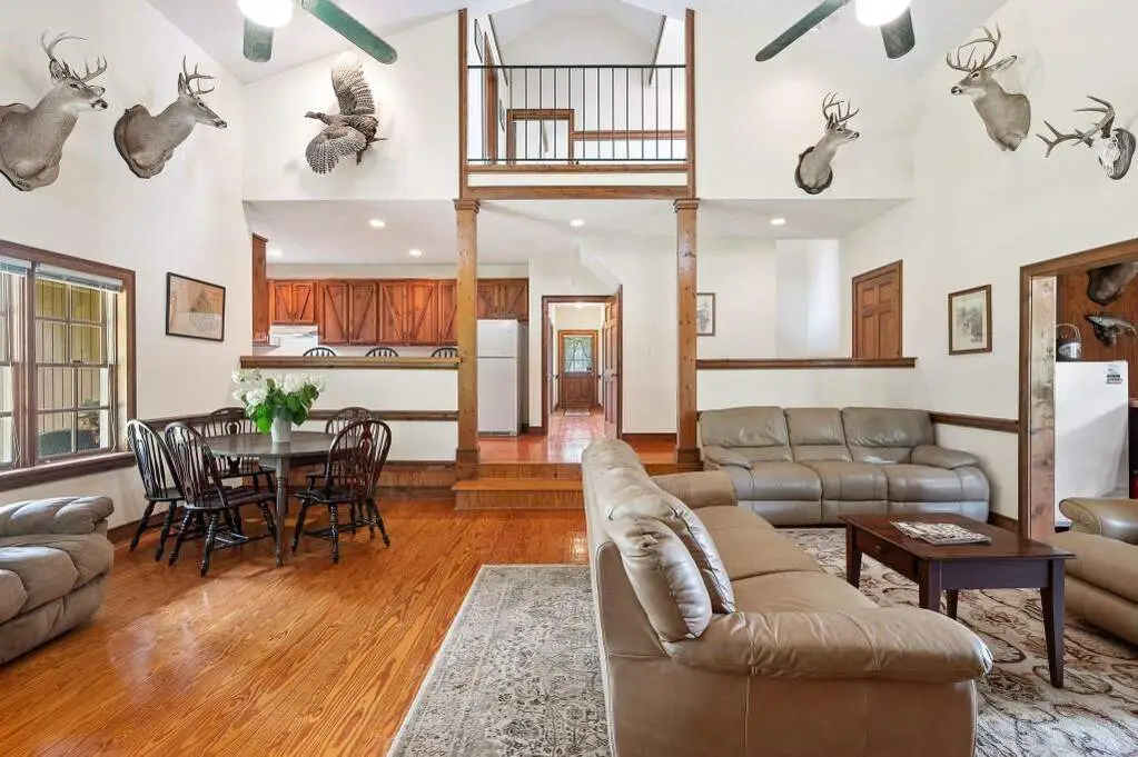 An idyllic lodge with over 82.59 heavily wooded acres of abundant deer hunting and timbering opportunities. Enter the gated property onto a well-maintained grassy lawn with ample parking space among mature, leafy trees. Take a few steps up to the home's wrap-around back porch where an outdoor grill and porch swing have been the popular spaces for overlooking family fun, country weddings, and after-the-hunt dinners on the giant lawn. From the porch, enter the great room with gleaming hardwood floors, high-beamed, two-story ceilings, a huge brick fireplace, a dining area, a wet bar, and game table area. Take one step up to the nearby kitchen which overlooks the great room and has a breakfast counter, stained cabinets, highly-shellacked wooden countertops, and open shelving. Additional rooms on the main level are three spacious bedrooms and one full bath located off a long hall directed toward the property's front door on one end and the kitchen and great room on the other. There is an additional half bath and laundry room off the kitchen and in close proximity to the great room. Upstairs is the billiard room with an open space large enough to accommodate at least four double beds and a few sleeping bags. Perfect for gathering a casual crowd of hunters on the night before the outing. A full bath and two doors leading to two separate outdoor balconies complete the casual camp-style ambiance. The property is the perfect hunting lodge, as the current owners have used it. Or, take advantage of the wide-open outdoor camping spaces for making many childhood family memories. There is even a stand of pecan trees left from the original homeplace for anyone interested in pecan harvesting. Located near the beautiful and historic downtown Madison, it's a great place for all to enjoy.