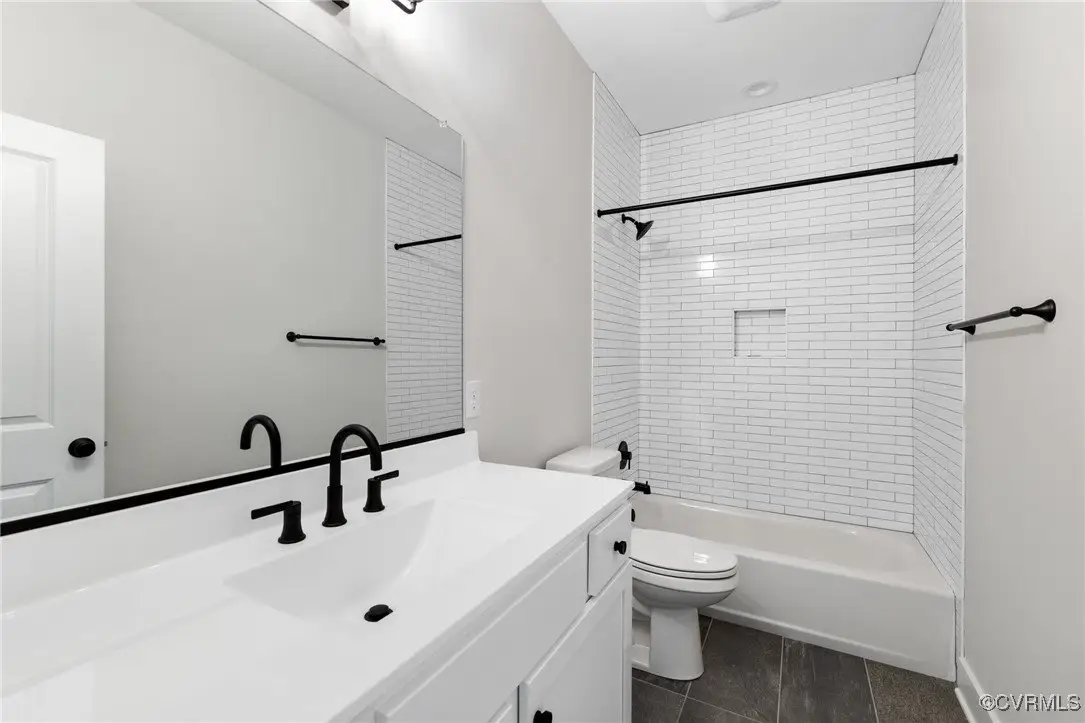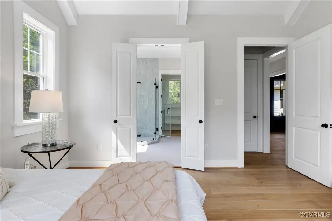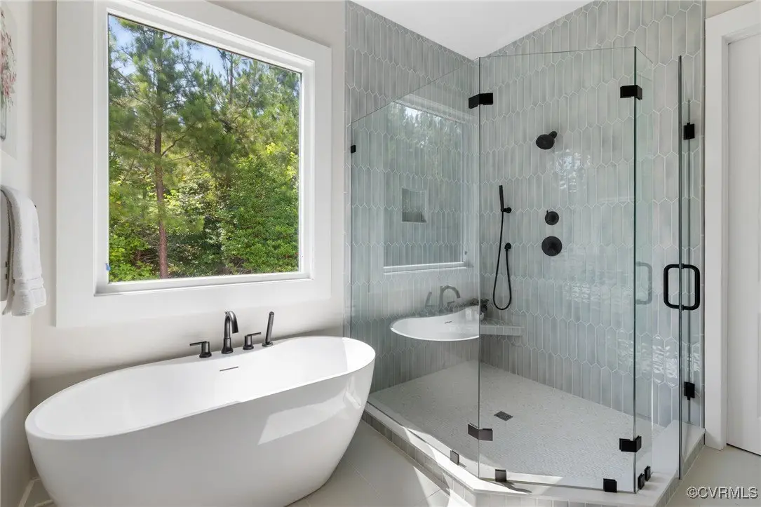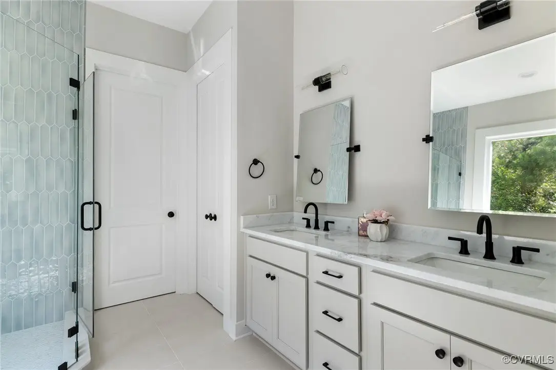 Spa-like ensuite bath with tile floors and walk-in shower.