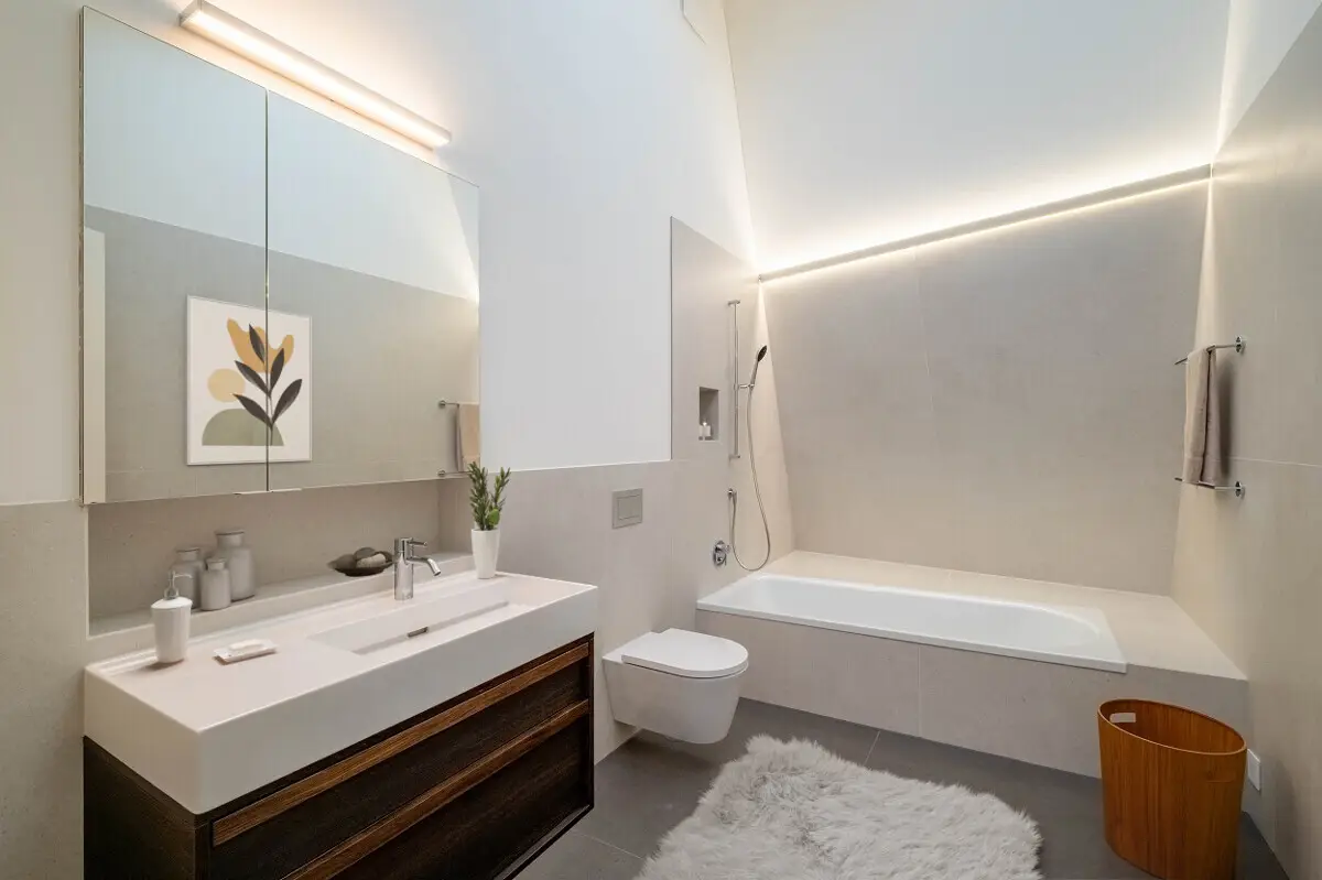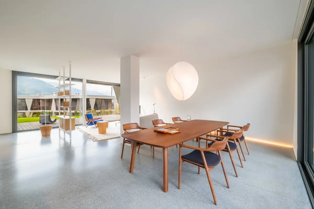 A home that blends harmoniously into the surrounding mountain landscape, combining modern design with a natural aesthetic in a decidedly appealing way. This contemporary detached house in Maienfeld unites high-quality architecture with state-of-the-art comfort, offering space for a variety of lifestyles. Completed in 2023 and now ready for first occupancy, it radiates understated elegance. Generous window fronts allow daylight to flood the interiors, imbuing the place with a bright and open atmosphere. The living and dining area opens out onto two outdoor spaces – a sheltered inner courtyard and a paved garden seating area. The kitchen, with wooden fronts, natural stone worktops and the latest appliances, forms the functional hub and effective centrepiece of the ground floor. There is also a separate guest WC at your disposal. The upper level houses two bright bedrooms and a spacious master arrangement with dressing area and direct access to an elegant en-suite bathroom with walk-in shower. This private suite offers a tranquil retreat to withdraw to and feel at ease. An additional bathroom with bathtub completes the layout. The well-configured floor plan provides ideal conditions for family life or for living and working under one roof. The property enjoys a peaceful, yet convenient location surrounded by open views, unspoiled landscape, and a well-kept neighbourhood affording a high quality of life. Three underground parking spaces, a technical maintenance room and a dedicated laundry / utility room make day-to-day living hassle-free. Sustainable energy efficiency is ensured by the combination of a geothermal heat pump and photovoltaic system – a forward-looking solution for modern living. The property - 4.5-room detached house - Approx. 198m² of living space - Two outdoor areas: courtyard and garden - Quiet yet central location - First occupancy following new build completion in 2023 - Ultra-modern, high-quality finishes - Sun throughout the day - Photovoltaic system and groundwater heat pump - 3 underground parking spaces