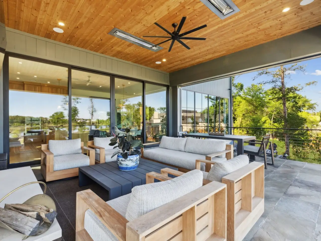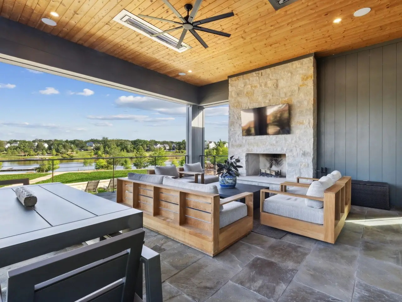 Tucked beneath a canopy of trees on a premium oversized lakefront lot in Long Cove, 13160 Woodsy Way blends luxury, comfort, and privacy in a beautifully designed retreat. With over 4800 square feet, plus additional bonus space above the garage, this custom oasis offers stunning lake views and direct access to the shoreline trail, perfect for long walks or golf cart rides. The open-concept layout connects expansive indoor and outdoor living spaces. A premium sound system runs throughout the home, including the large upstairs game room and covered outdoor porch with motorized screens, outdoor wood-burning fireplace, and built-in patio heaters, perfect for year-round entertaining. Gather around the outdoor fire pit or soak in the views from the sunning deck, all framed by a professionally designed landscape. Inside, the chef's kitchen features Taj Mahal quartzite countertops, premium appliances, custom cabinetry, a spacious walk-in pantry, and a large island ideal for entertaining. A marble-clad primary bathroom, Providence Lane custom drapery and window shades, Visual Comfort lighting, and a two-office setup, including one with incredible lake views, elevate the lifestyle even further. Each of the additional four large bedrooms features its own en-suite bathroom, with one bedroom designed as a bunk room accommodating two California King beds and two twin beds. Practical elegance continues with a spacious mudroom, custom cubbies, and herringbone brick flooring. An outdoor breezeway is designed to hold two golf carts and connects the home to a two-car garage and carport, and turfed dog yard for furry friends. Peace of mind comes built-in with full exterior video monitoring, lightning rods, a whole-house water filtration system, and a backup generator. Whether you're looking for the perfect weekend escape or a forever home, 13160 Woodsy Way delivers resort-style living in a private, wooded setting just steps from the lake.