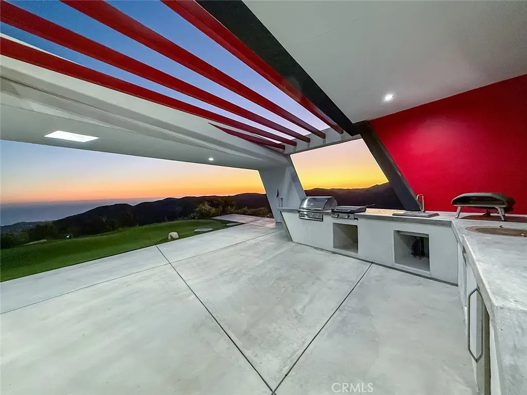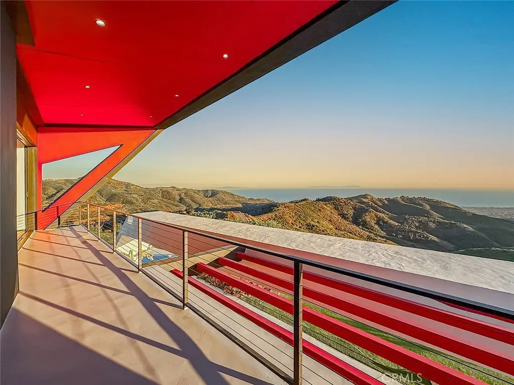 Soaring jetliners & sweeping views spanning Catalina to Santa Monica set the stage at The Aviator—a striking, architecturally significant Malibu escape by renowned designer Amit Apel. Perched at the end of a private road at the top of the world, this bold, modern sanctuary draws inspiration from the grace and precision of flight. A sculptural interplay of steel, crisp architectural lines, and signature circular windows create a sense of movement and lift, giving the residence its unmistakable presence. This one-of-a-kind retreat is equipped with a state-of-the-art Smart Home system that controls lighting, security, pool, and solar system—all automated & effortlessly accessible. Through the glass entry, the home unfolds into a dramatic open-concept living space defined by custom art, rich textures, & dynamic architectural forms. Floor-to-ceiling retractable walls vanish to frame endless ocean, canyon, and skyline views, blurring the line between indoors & out. The sleek European-inspired kitchen features premium stainless steel appliances, a six-burner gas cooktop & spacious center island with a breakfast bar with custom seating. A warm yet sophisticated ambiance flows seamlessly into the dining and family areas, where bold style and comfort unite. The main level also includes a bedroom with and a circular window. Ascending the stairs, 2 luxurious primary suites await. The first boasts sweeping ocean & Malibu city vistas and an Art Deco–inspired bath with stunning glass-enclosed shower, soaking tub, dual sinks, & mountain views. The second primary suite mirrors the home’s refined design language, showcasing bold lines and vibrant accents, with panoramic views of Santa Monica and the Pacific. Its spa-like bath offers a deep soaking tub, dual sinks, and custom shower. A third “hidden” room serves perfectly as an office, lounge, or creative studio. The outdoor living spaces are a world unto themselves. A dramatic triangular zero-edge pool and spa appear to float above the horizon. The fully outfitted outdoor kitchen—complete with BBQ, grill, refrigerator & pizza oven—invites unforgettable alfresco dining. Additional highlights include a private putting green, oversized fire pit with flame wall, and an open-air movie screening area for evenings under the stars. Designed for both spectacular entertaining and self-sustaining independence, The Aviator offers the rare ability to live comfortably “off the grid.” This is more than a home—it is a statement of vision.