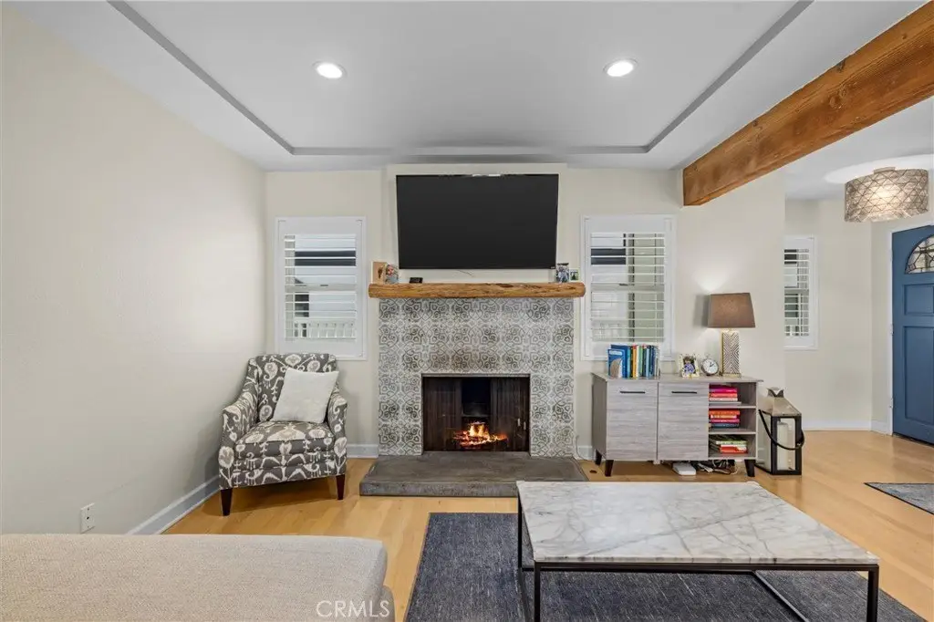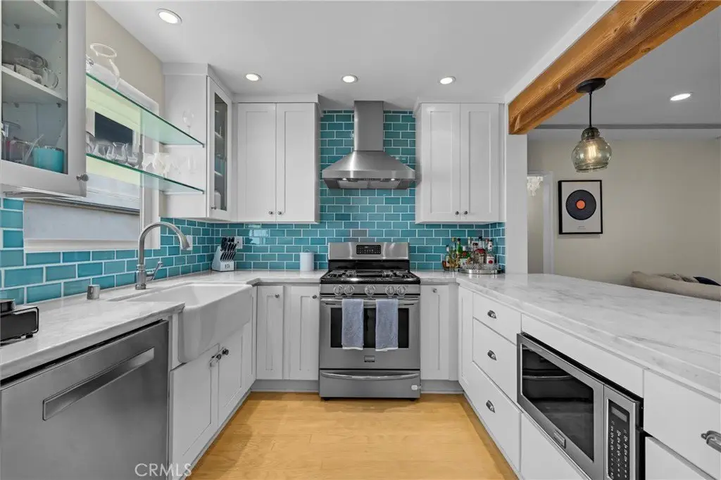Coastal charm meets modern comfort in this light-filled 3 bed, 2.5 bath home nestled in the heart of the Tree Section of Manhattan Beach. Thoughtfully designed for both everyday living and relaxed entertaining, this home welcomes you with an airy living room featuring vaulted wood-beamed ceilings, rich hardwood floors, and a cozy wood burning fireplace, perfect for cool coastal evenings. The open-concept kitchen is a showstopper, bathed in natural light and accented by marble countertops, bar seating, a farmhouse sink, stainless steel appliances, a wine fridge, and a bold teal tile backsplash. A side door offers easy access to the private backyard, seamlessly connecting indoor and outdoor living. To the right, two generously sized bedrooms share a beautifully renovated full bathroom. To the left, you’ll find a convenient powder room, a dedicated laundry area with hookups, and the spacious primary suite. French doors open to the side patio, while the spa-like en-suite features a dual sink vanity, stylish tile flooring, and ample closet space. The backyard is an entertainer’s dream, complete with a custom putting green and room for al fresco dining or weekend BBQs. The home also includes an oversized 2-car garage, offering plenty of storage and space for beach gear, bikes, or a home gym setup. Located moments from award-winning schools, downtown shops and restaurants, and world-class surf, this home offers the best of beachside living.