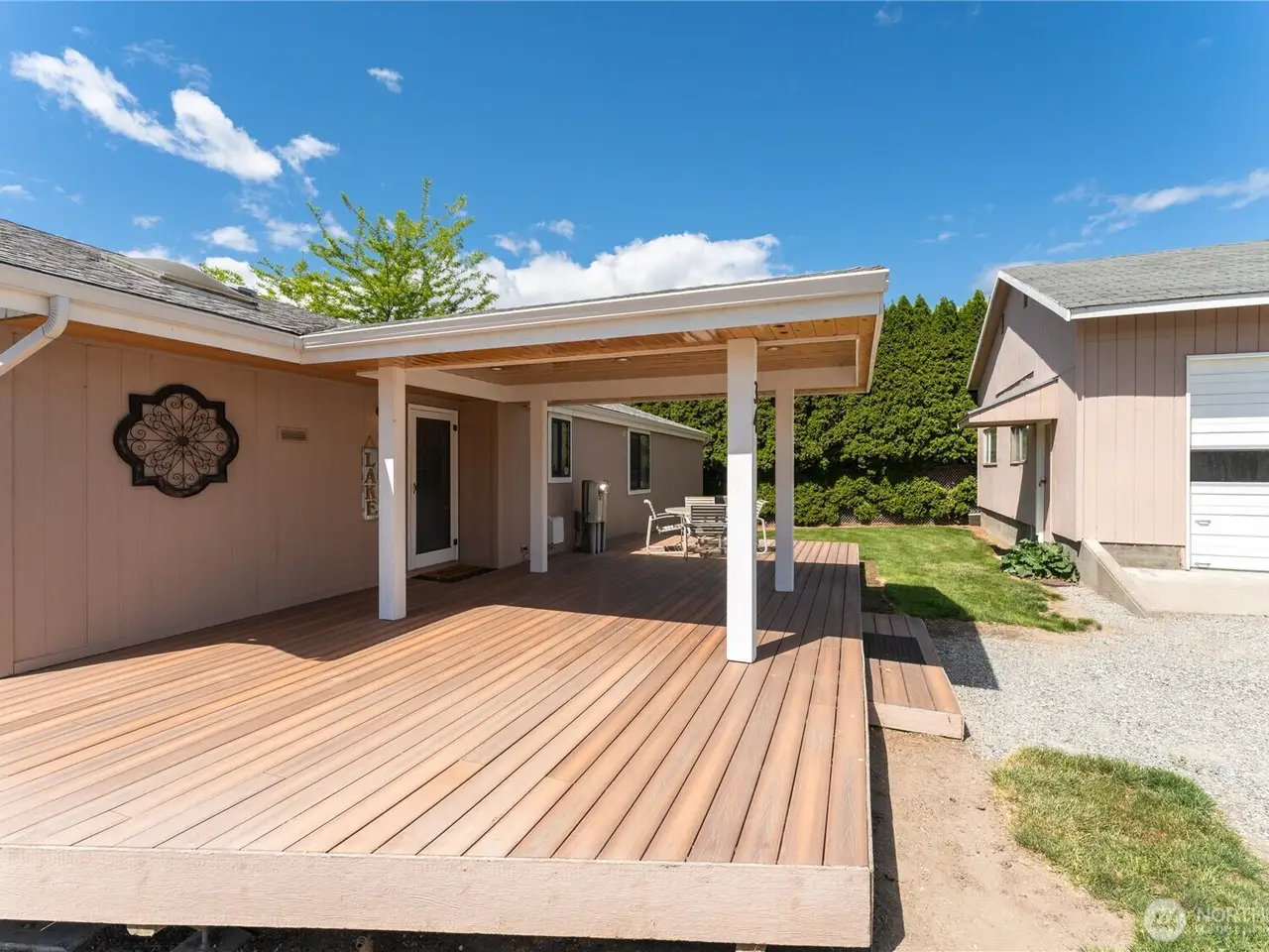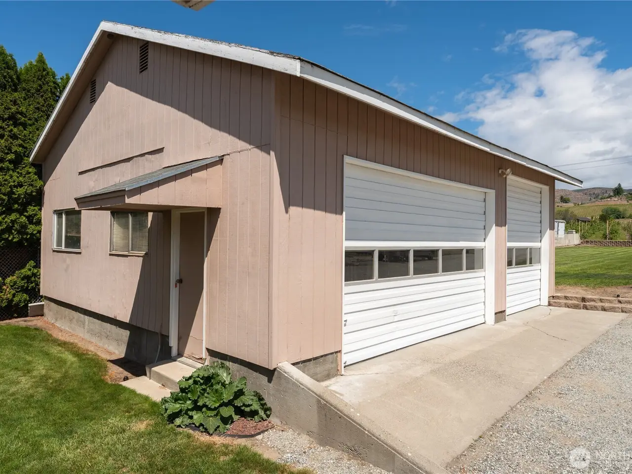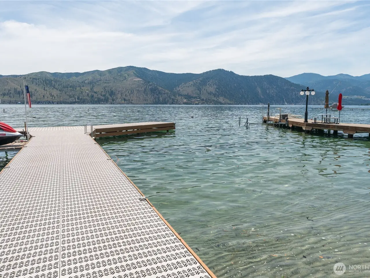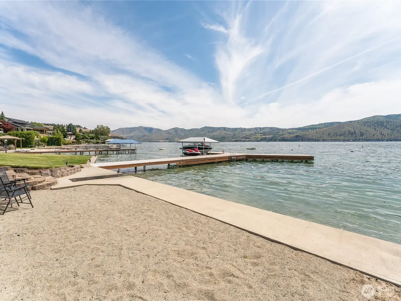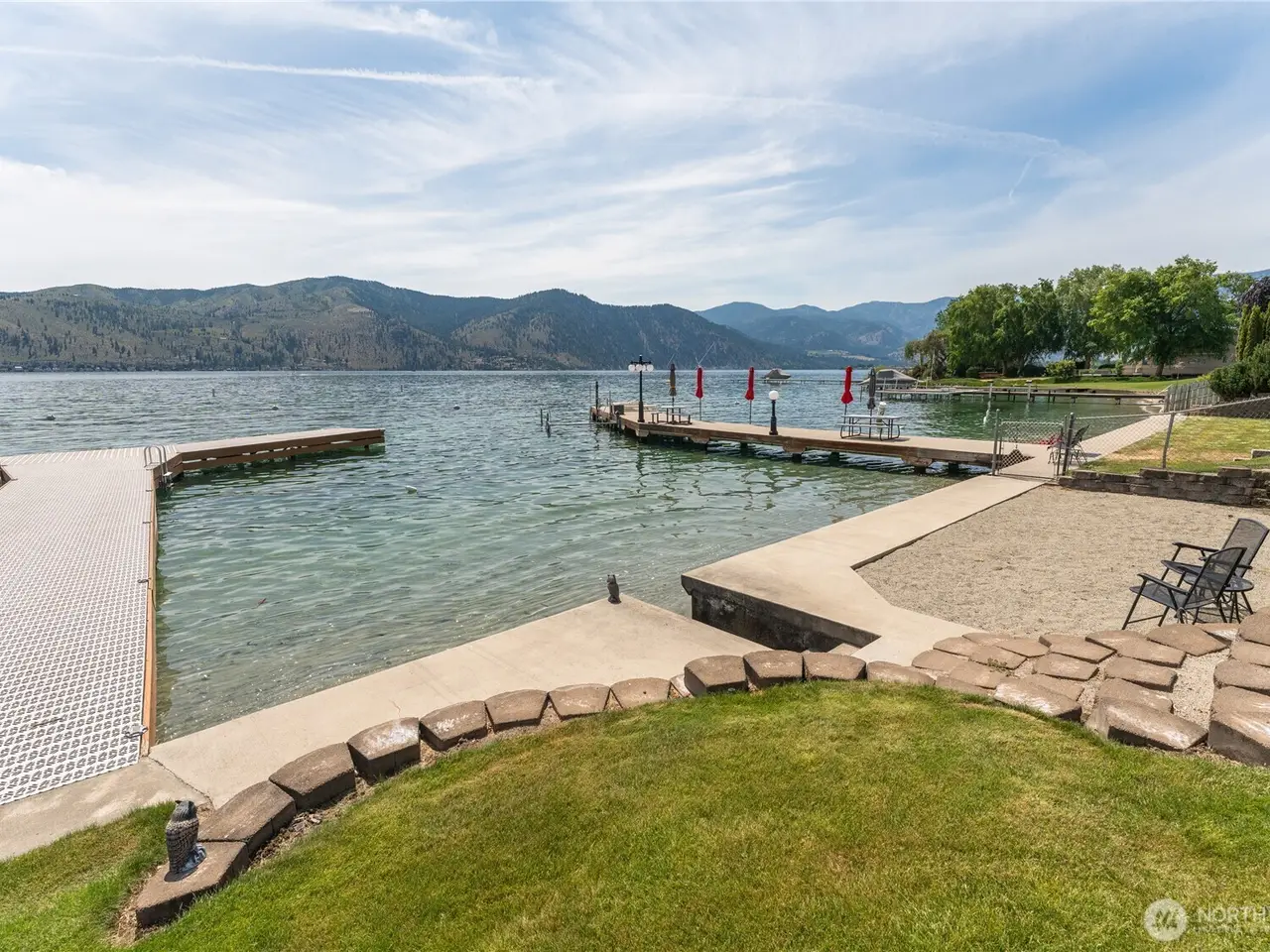 Welcome to 34 Leisure Lane! This rare .9-acre property boasts 56 feet of low bank waterfront with a concrete bulkhead and stairs to a sandy beach. Enjoy a resurfaced shared dock and a stunning, newer lake-facing deck off a charming three bed, two bath, 1,300 square foot home. Two lots (front and back) offer exceptional flexibility and space, including a three-bay shop, four RV hookups, and tons of parking. Mostly flat with a gentle slope - perfect for outdoor living and future development/building. Prime location with easy, level access off a paved road. On sewer, with LCRD domestic water and irrigation. One of the nicest stretches of real estate on Lake Chelan & amongst some incredible new homes and remodels. House plans by Complete Design can be included!