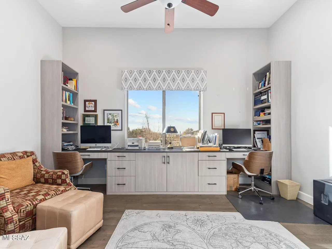Assumable VA loan 2.25% Beautifully Remodeled Home with Stunning Mountain Views in Dos Lagos at Dove Mountain. Welcome to this gorgeous 3-bedroom, 4-bathroom home in the gated community of Dos Lagos at Dove Mountain. Thoughtfully remodeled with modern touches and timeless elegance, this home offers the perfect blend of style, comfort, and privacy. Step inside and immediately feel at home with new engineered wood flooring and a beautifully updated kitchen featuring sleek cabinetry and plenty of space to cook and entertain. The great room and living room have been redesigned with custom shelving, adding warmth and character to the space. A dedicated office space features new custom cabinets and shelving, creating a stylish and functional workspace. The primary suite is a true retreat complete with his and hers walk-in closets and a spa-like bathroom. Outside, your own private oasis awaits. Take in the breathtaking mountain views while relaxing in the pool and spa, the perfect spot for unwinding or entertaining guests. This home is all about comfort, beauty, and tranquility!