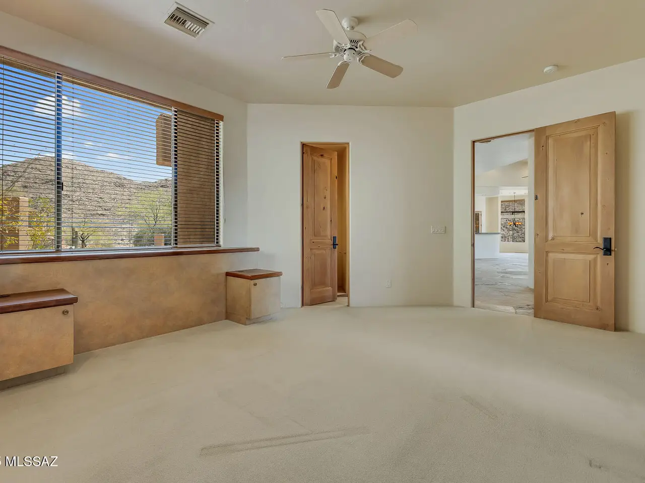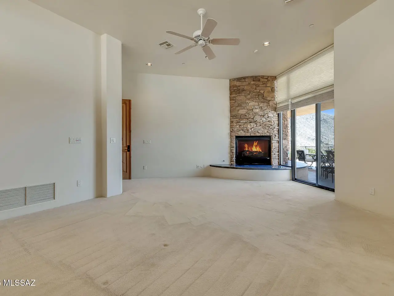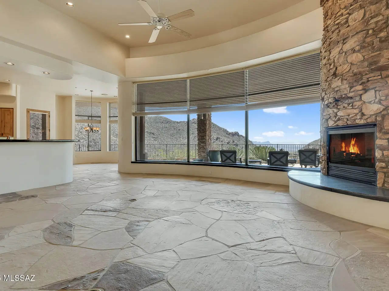 LUXURIOUS CUSTOM ESTATE sits high nestled against the Tortolita Mountains in the premier, guard gated community of Canyon Pass at Dove Mountain. Enjoy breathtaking panoramic views of the canyon, valley and mountains beyond... plus a sparkling, heated pool. Gated drive winds to a flagstone patio entrance with orbital water fountain. This 3, 665 sq ft residence affords 4 bedrooms and 4 full baths plus den/office. Large gathering room greets you with soaring ceilings, wall-to-wall view windows, corner stacked stone fireplace and custom art/media center. Formal dining area with views lies off a gourmet kitchen offering large island with prep sink, granite slab countertops, stainless/black appliances, built-in workstation and pantry, plus wood paneled Sub-Zero refrigerator/freezer, Dacor microwave and Asko dishwasher. Elegant Owner's suite accesses rear patio and hosts a stacked stone fireplace and luxury bath with granite covered vanity, jetted tub, circular tiled walk-in shower plus dual walk-in closets. Bedrooms 2 & 3 offer luxury en suite baths. Bedroom 4 lies off hall bath. Other luxury amenities include flagstone flooring, alderwood cabinets, curved walls & windows, stacked stone outdoor columns & interior accents, custom closets, skylights, art niches, recessed ceilings & clerestory windows. Extended laundry with sink, zoned heating/cooling and water heaters, plus 3-car extended garage with customized storage room. Security features include gated driveway, alarm and fire suppression. Retreat to a spectacular rear oasis with flagstone patio accents, wrought iron view fence, heated pool with rock waterfall plus breathtaking panoramic views. Dove Mountain is home to the Ritz-Carlton Resort & Spa, Gallery Golf & Sports Club, Golf Club at Dove Mountain, plus sport parks and hiking/biking trails.