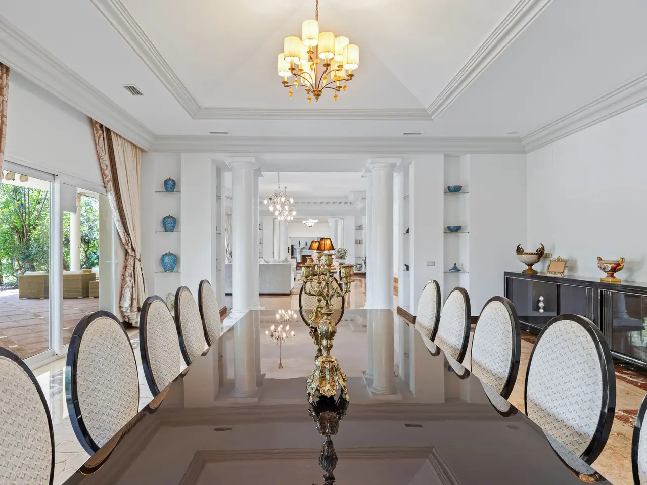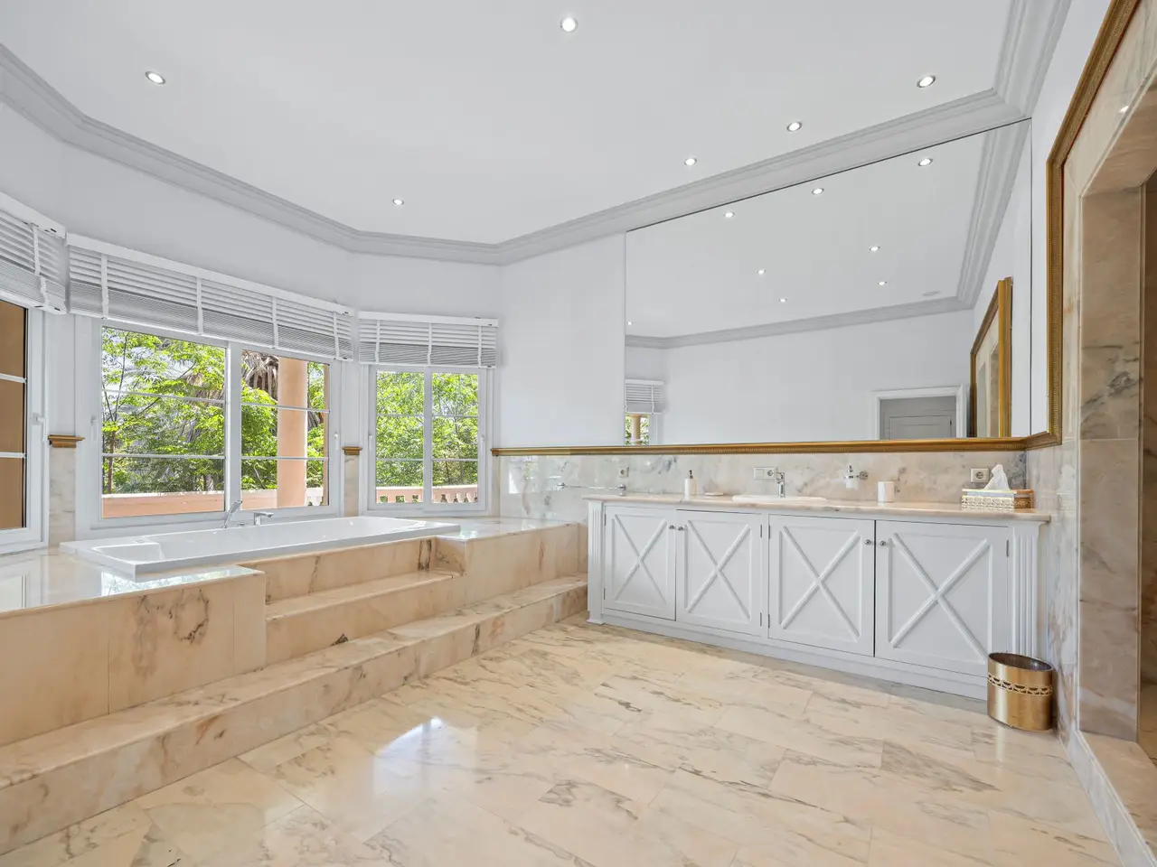 Tucked away in one of Marbella’s most discreet and sought-after residential areas, this timeless estate blends classical European elegance with the calm of lush, mature gardens. Just a few minutes from the heart of town and landmarks like Puente Romano Resort and the Marbella Club Hotel, it offers a rare mix of seclusion and convenience. From the moment you arrive, the home makes a statement. Grand Doric columns frame the entrance, and ivy-covered walls soften the architecture, giving it a quiet, almost cinematic beauty. The double-height entryway, with its sweeping twin staircases and patterned marble floor, sets the tone: formal but warm, impressive yet inviting. The estate sits on over 4,000 square meters of private grounds, and offers more than 1.500 square meters of interior space laid out across three levels. The main floor is designed for entertaining, with generous reception rooms, elegant ceilings, and natural light pouring in through large windows that open to the terraces and garden beyond. Upstairs, the primary suite spans more than 200 square meters and includes two separate bathrooms and dressing rooms, as well as a private terrace. Four additional bedroom suites are arranged symmetrically along the upper floor, each with their own bathroom, dressing area, and outdoor space. On the lower level, there’s a full wellness area with a gym, yoga room, sauna, steam bath, and massage room, a quiet retreat at the heart of the home, and a separate staff quarters with four bedrooms. It’s rare to find a place that feels both grand and grounded. But this one does. A home built with care, set in nature, and made to last.
