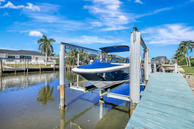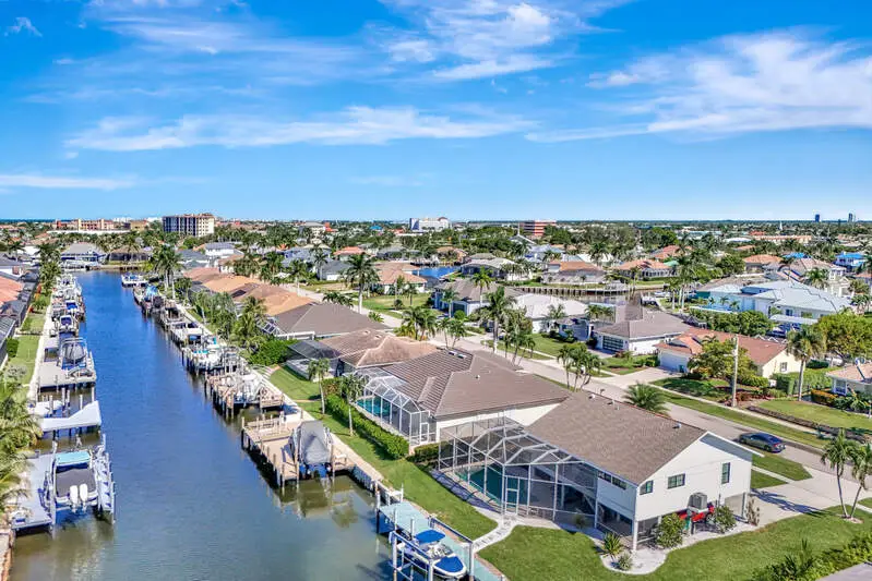 Enjoy waterfront living in this beautifully updated 2-bedroom plus den, 2-bath home on Marco Island. Located on an indirect Gulf-access canal with 100' on the water, the property features a private dock with boat lift, perfect for boating and fishing. Relax by the screened-in pool or take in the water views from the upper-level lanai. The light and airy interior offers an open floor plan with coastal-inspired finishes. The updated kitchen includes shaker cabinetry, solid surface counters, tile backsplash, farmhouse sink, and modern appliances. The den provides flexible space for a home office or guest room, while the primary suite offers comfort and style. Designed for the Florida lifestyle, this home offers multiple outdoor living spaces, impact windows, and a beautifully landscaped yard. Ideally located near Marco Island's beaches, shopping, and dining.