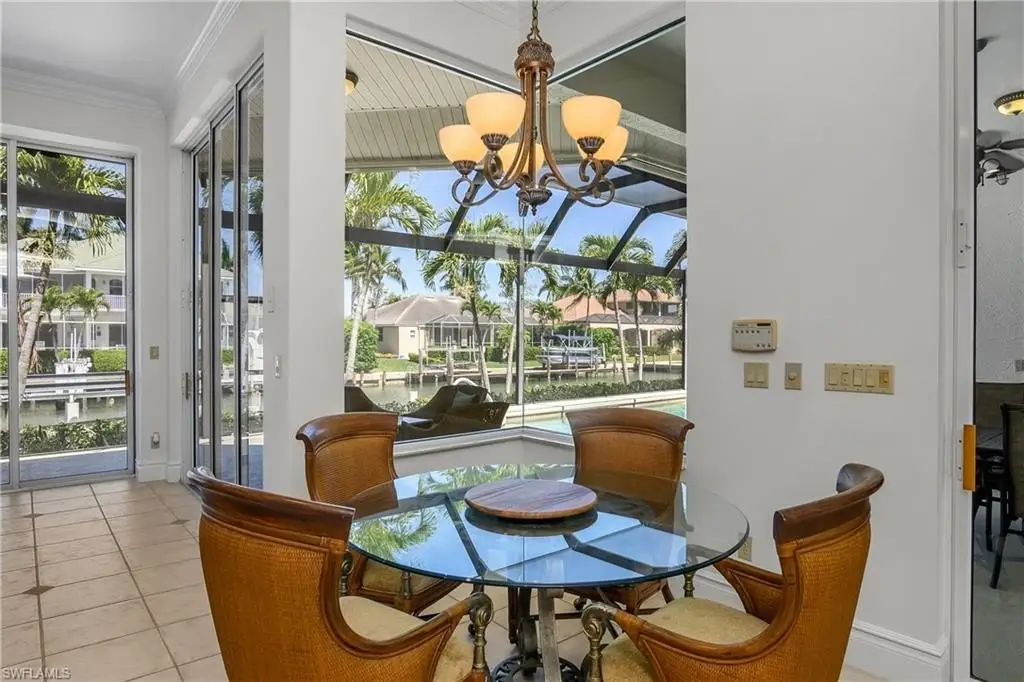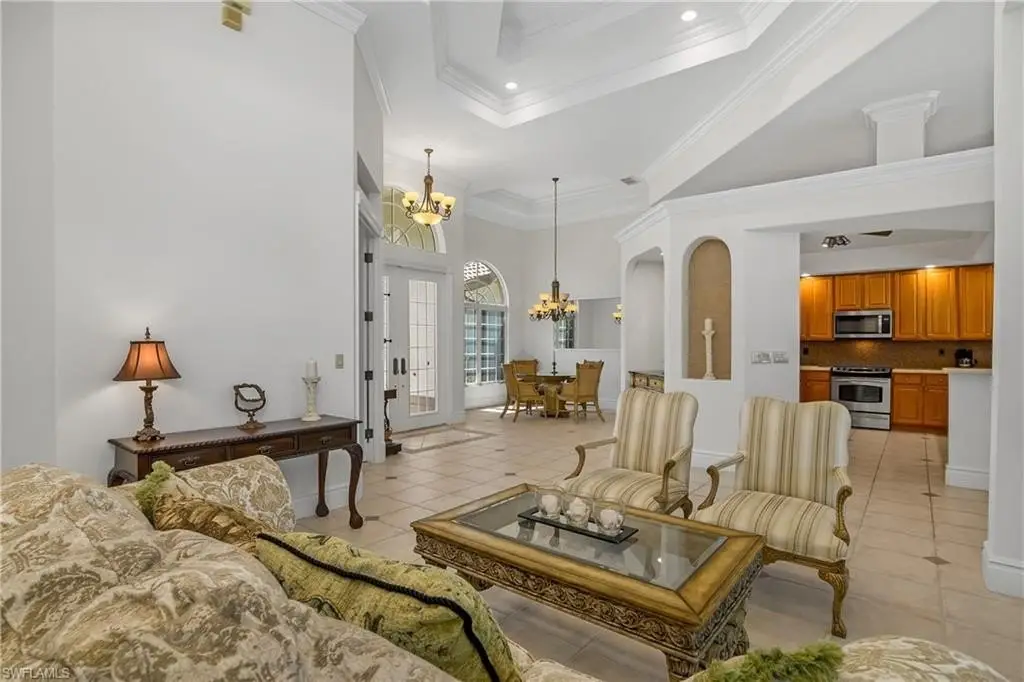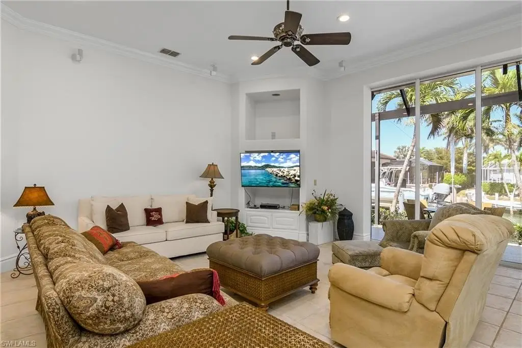 Exceptional waterfront home for those who seek both comfort and beauty in a natural setting. This elegant custom-built residence features three bedrooms, two bathrooms, and an office, offering an impressive and spacious layout. Nestled in a quiet residential neighborhood, the home boasts large rooms, high ceilings, and an open floor plan, making it ideal for entertaining. Highlights include a separate dining room, a formal living room, and a family room that seamlessly flows together. The home is adorned with Andersen windows, maple cabinetry, crown molding, and 10-foot sliding doors that enhance the overall ambiance. The split floor plan provides privacy, and you will be greeted by magnificent 10-foot solid wood double doors leading into the expansive master bedroom suite. Outside, the lanai features a grill and prep station, while the lap pool and spa overlook the private dock with a lift—perfect for boating enthusiasts who will appreciate the direct access to open waters within minutes. Offered fully furnished, this home is the ultimate complete package.