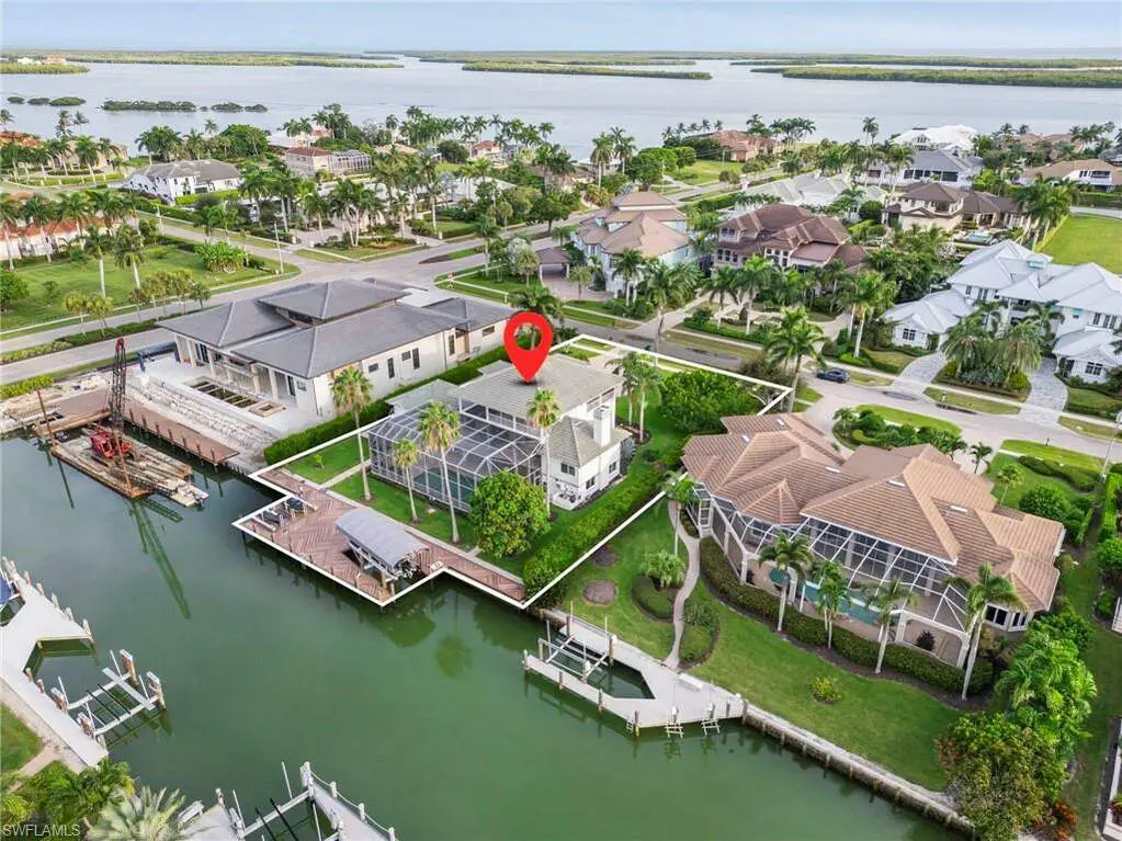 Located in the exclusive Marco Island Estates, this stunning four bedroom/4.5 bath two-story home situated less than 800 feet to open water, providing direct deep-water access to the Gulf of Mexico and the 10,000 Islands fishing paradise. Each of the four spacious bedrooms features an ensuite bathroom, while a private elevator ensures easy access to all floors. The home's heart is the newly remodeled kitchen, equipped with custom cabinets, a gas stove, and an inviting eat-in area that flows into the family room, where a cozy gas fireplace sets the perfect atmosphere. Step outside to your private backyard oasis, complete with a gas-heated pool and a breathtaking composite dock featuring a 12,000-pound lift, three-jet ski platform, waterway canopy, and a brand new seawall (2021). A pontoon boat and two Sea-Doo jet skis are included, making this the ultimate waterfront lifestyle. Other features include an oversized garage/workshop, a basement with ample storage and a bonus game room, hurricane-impact windows and doors, a hidden safe, drop-down TV in the master suite, Wi-Fi-enabled garage doors, a 1,000-gallon buried LP tank with Wi-Fi monitoring, and a Ring camera system. Turnkey and ready to move in, this property is an incredible investment, surrounded by magnificent homes on one of the best streets in the Estates.