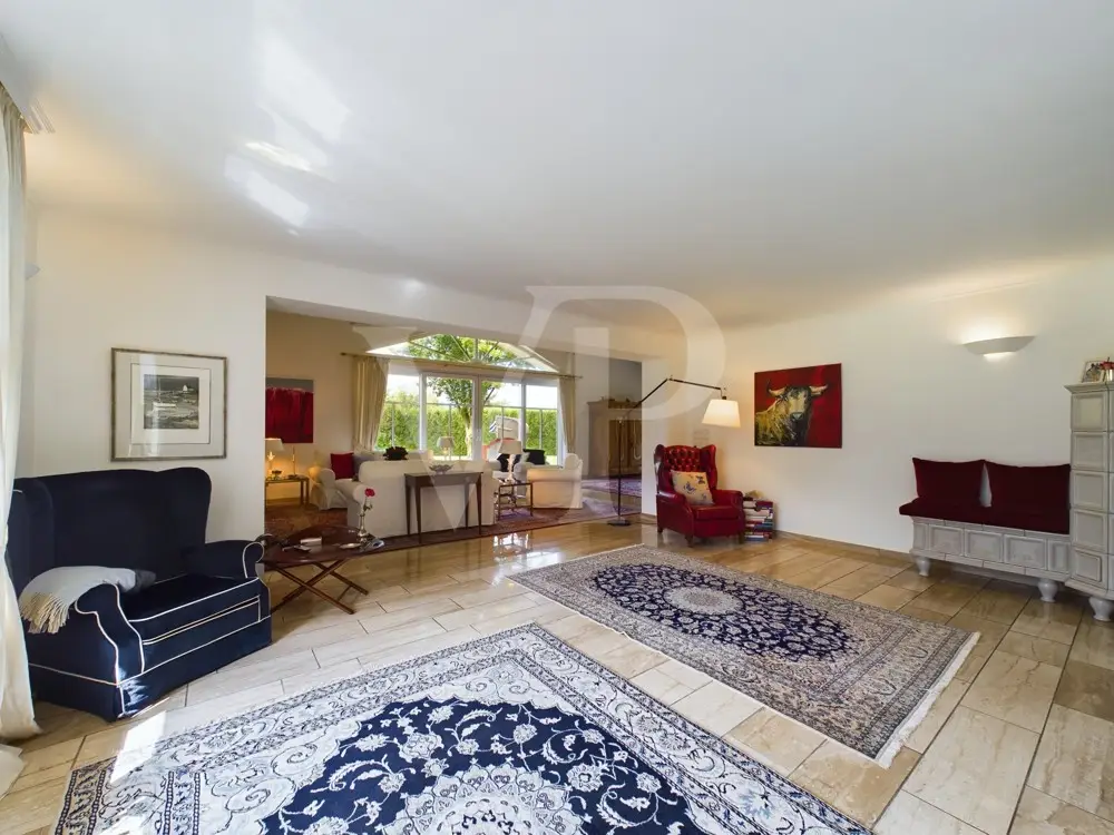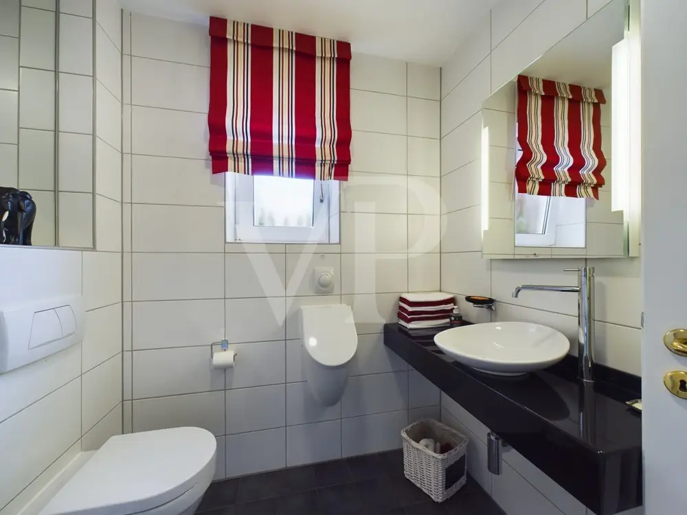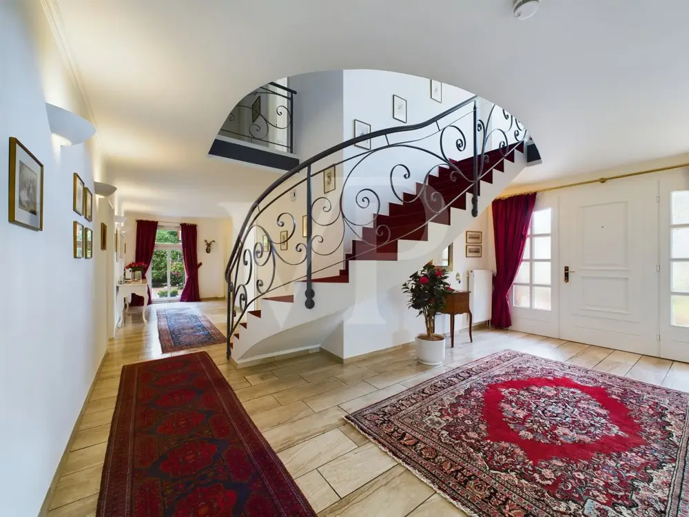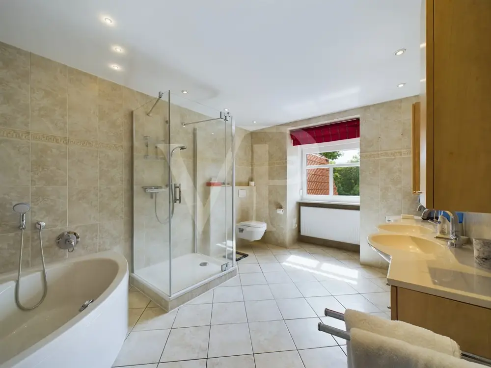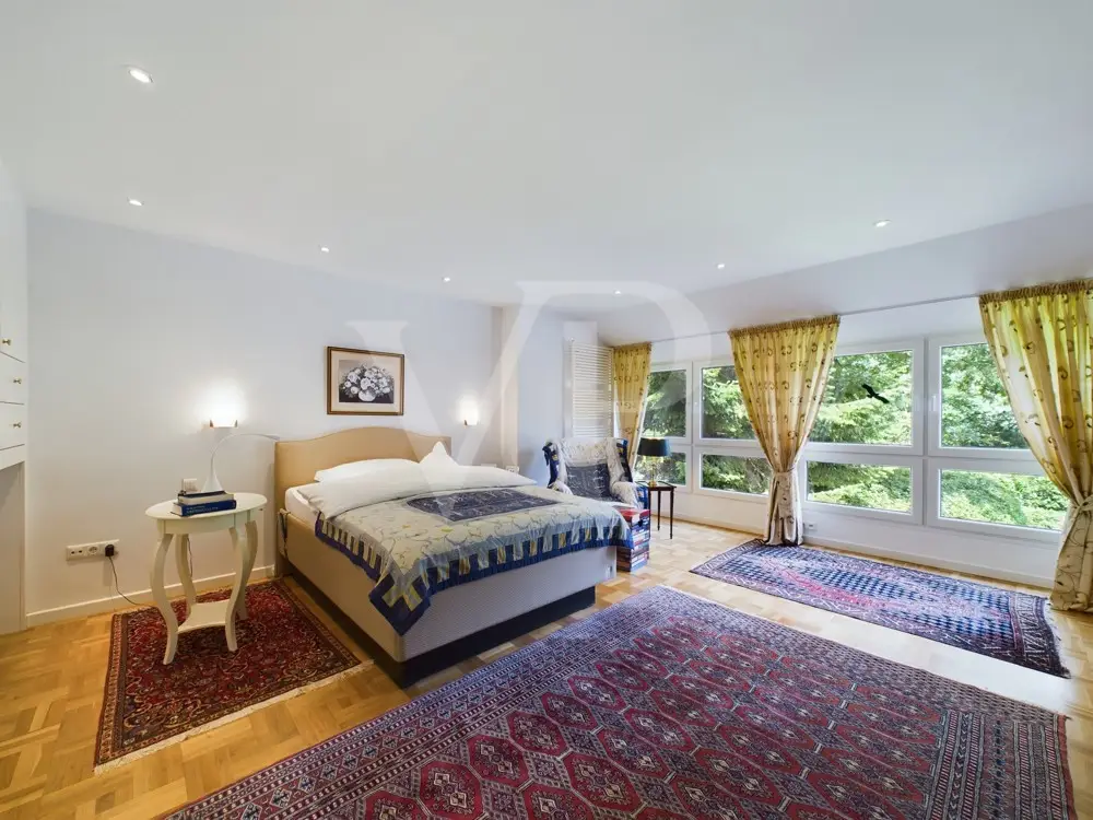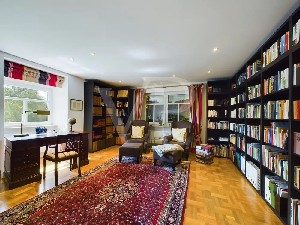 This well-kept property consisting of a main house, a granny apartment and a spacious garden house was built on a plot of approx. 3,840 m². A plot of approx. 1,828 m² directly behind it extends the property. With a living space of approx. 350 m², this property offers enough space for a large family. The villa has a total of 10 rooms, including 6 bedrooms and 3 bathrooms. Your new home impresses with a successful floor plan, generous window fronts and high-quality materials. The furnishings are exclusive and ensure a pleasant living atmosphere. On the first floor, the underfloor heating together with an impressive gas fireplace and a traditional tiled stove create a warm atmosphere The wellness area with swimming pool and sauna, which was added in 1997, invites you to relax intensively. The swimming pool was closed by the current residents, but can be easily reactivated. Here you can relax and unwind after a busy day. A cozy granny apartment with separate access is ideal for guests or as a separate work area in the office or home office. A highlight of the property is the fully fenced garden, which can be described as park-like due to its design. Various terraces and the balcony offer a variety of opportunities for outdoor recreation. The outdoor area also has a workshop, a tool shed, a bicycle garage and a covered wood store. The location of the house is ideal for families looking for peace and nature. A spacious garden shed on the property also offers further possibilities for use. A double garage with a sectional door and five additional parking spaces are available for your vehicles. The villa is accessed via an electric gate, which provides additional security. This villa is suitable for both families and buyers looking for a prestigious yet versatile residence. Thanks to the extensive modernization and high-quality furnishings, this property meets high standards of modern, comfortable living and at the same time offers sufficient space to realize individual living dreams. A viewing is well worthwhile to discover the full potential of this property.