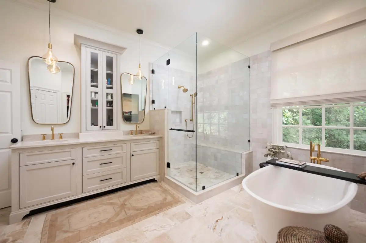 The family room has plenty of space for large gatherings and offers built-in cabinetry on either side of the fireplace. The new sliding doors off the family room open to the newly added covered back porch with Epay wood floors, rock masonry fireplace and built-in firewood storage, plus serving area that includes a built-in grill. Great views from the back porch of the private landscaped lot and stone steps lead down to the gunite saltwater pool with plenty of for guests to enjoy the pool. Primary suite on main level that has been completed renovated with elegant finishes including custom cabinetry and quartzite countertops, soaking tub, and designer tiled shower. Adjoining custom closet with ample space.