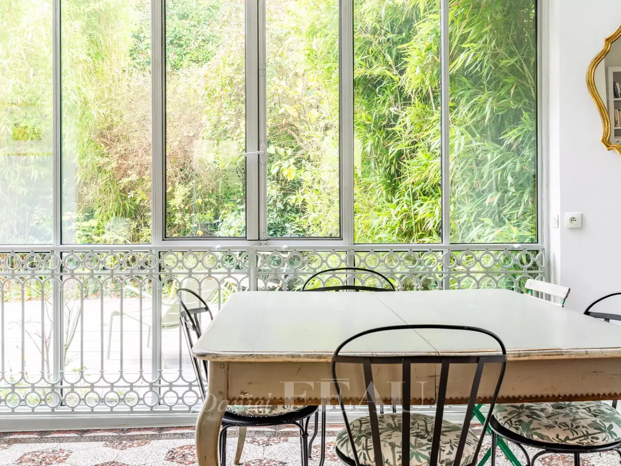 Charming house of the 19th century nestled in the heart of a pretty garden, it offers a total area of 314 m² (218.85 m² Carrez), and consists, on the ground floor of a kitchen (Bulthaup), of a living room with wood stove opening onto a period veranda from which one can enjoy a large sunny terrace, guest toilet. On the first floor a landing distributes three bedrooms, a bathroom with bath and shower, a dressing room, separate toilet. On the second floor, two bedrooms, an office, a bathroom. The third floor offers converted attic with toilets and attic. In the basement three beautiful cellars. Shops and station (Line L) for La Défense and Saint-Lazare 10 minutes on foot. Access to the A13 motorway in 5 minutes.