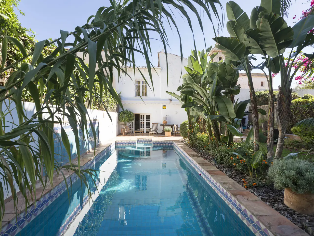 This charming house benefits from a surface of more than 400 square meters where the aim has been to preserve the tradition and originality of its construction including more modern facilities. Details such as the indoor carpentry in Mobila wood, the impressive main door, the exposed wooden beams and the attic area have been kept during the renovation. The main level consists of a living-dining room equipped with a fireplace, kitchen, bathroom and a room that is being used as a library. The first-floor houses two bedrooms and the master bedroom, dressing room and bathroom, as well as a hallway with access to a charming terrace. The most outstanding area is the patio with terracotta flooring, crowned by a beautiful fountain and adorned with plants. From this area there is access to the summer dining-room and a porch with garden and swimming pool. It includes a guest area on the second floor which accommodates a cosy living room, bedroom and bathroom.
