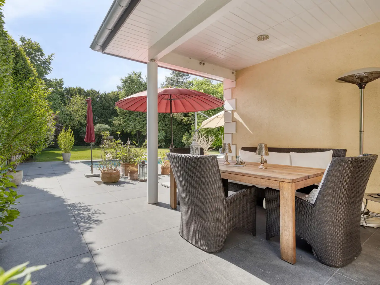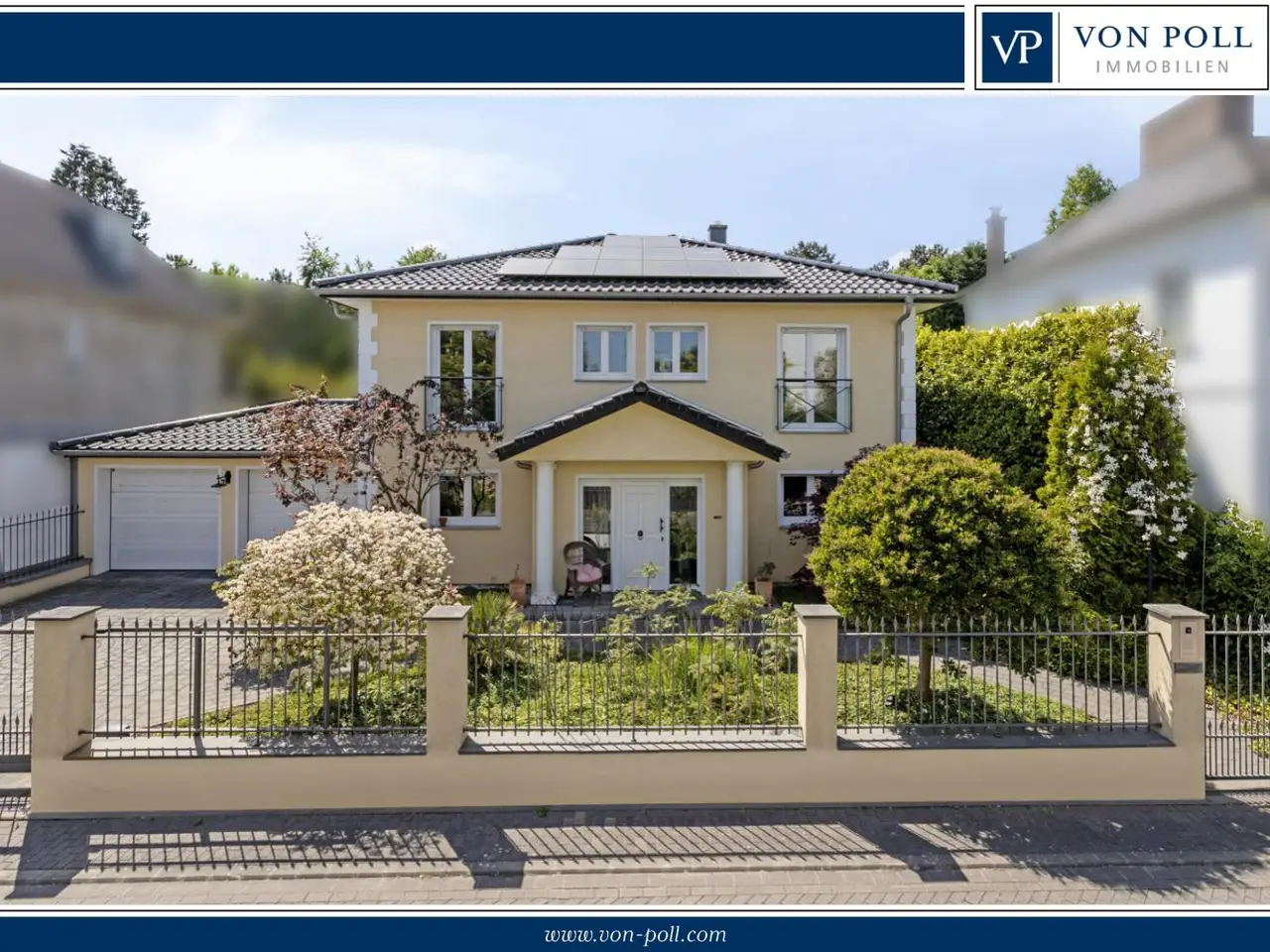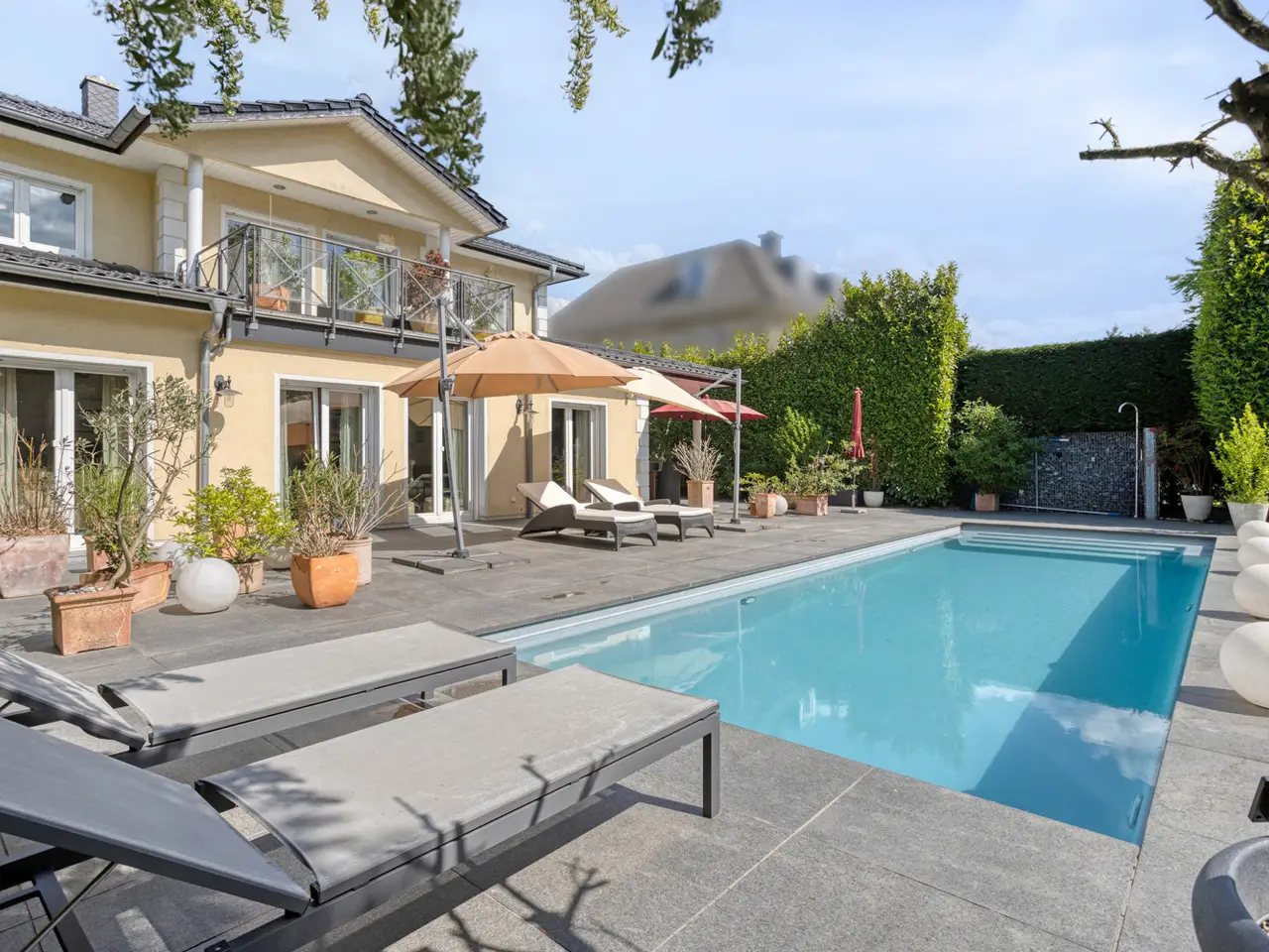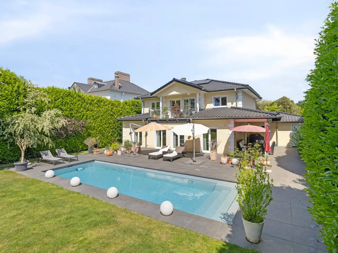 Bring your vacation home, because this villa, built in 2007 on a plot of around 1,175 m², now offers you living at the highest level on approx. 274 m² of living space and a total of 6 rooms, with the heated outdoor pool, the spacious terrace areas and the secluded garden providing a vacation feeling almost all year round. State-of-the-art building technology with fuel cell heating and a photovoltaic system with storage also ensure outstanding energy efficiency. You enter the house via the partially paved front garden, which is enclosed by a fence and wall, through a prestigious reception area into the spacious entrance hall, from where your gaze falls directly onto the high ceilings and the open gallery on the upper floor. From the entrance hall, you enter the kitchen on the left and the guest area with bedroom, small hallway and en-suite shower room on the right. The loft-like living and dining area with around 63 m² of living space is located in front of you. Here, the large marble fireplace creates a cozy atmosphere in winter, while the 5 floor-to-ceiling windows offer a seamless transition to the spacious pool area and garden in summer. This creates interesting axes of light and views, all of which lead through large window fronts into the surrounding garden and pool area. The large terrace by the outdoor pool and a covered outdoor seating area to the side of the house offer plenty of space to enjoy the beautiful days of the year with family and friends. And if you like it sporty, you will find your opponent in the pool's counter-current system. Solar panels in the pool's electric roller cover help to heat the pool in spring. The kitchen is already equipped with a high-quality country-style fitted kitchen and also has a useful storage room and direct access to the double garage. The open-plan staircase leads to the gallery on the upper floor and from there to the four bedrooms on this floor. The air-conditioned master bedroom has a spacious en suite bathroom with shower and bathtub and access to the balcony on this level. All rooms on both the ground and upper floors can be darkened with electric shutters. In the basement, which has a partial cellar, there is a hobby room and the utility room, which also houses the swimming pool equipment. The garden is densely planted and offers plenty of privacy and is barely visible, and is kept wonderfully green with an irrigation system. Next to the pool, an outdoor shower with warm water provides cooling and a small garden shed provides storage space in the outdoor area. The double garage can also be accessed through the garden. This is equipped with an electric door and offers space for further parking spaces in front of it, which are secured from the street by another door. You can also expect high-quality fittings on all levels of the house. Stone and parquet floors, a high-quality fitted kitchen and modern building technology are just a few examples. We cordially invite you to arrange a viewing appointment on site to see the charm and quality of the property for yourself.