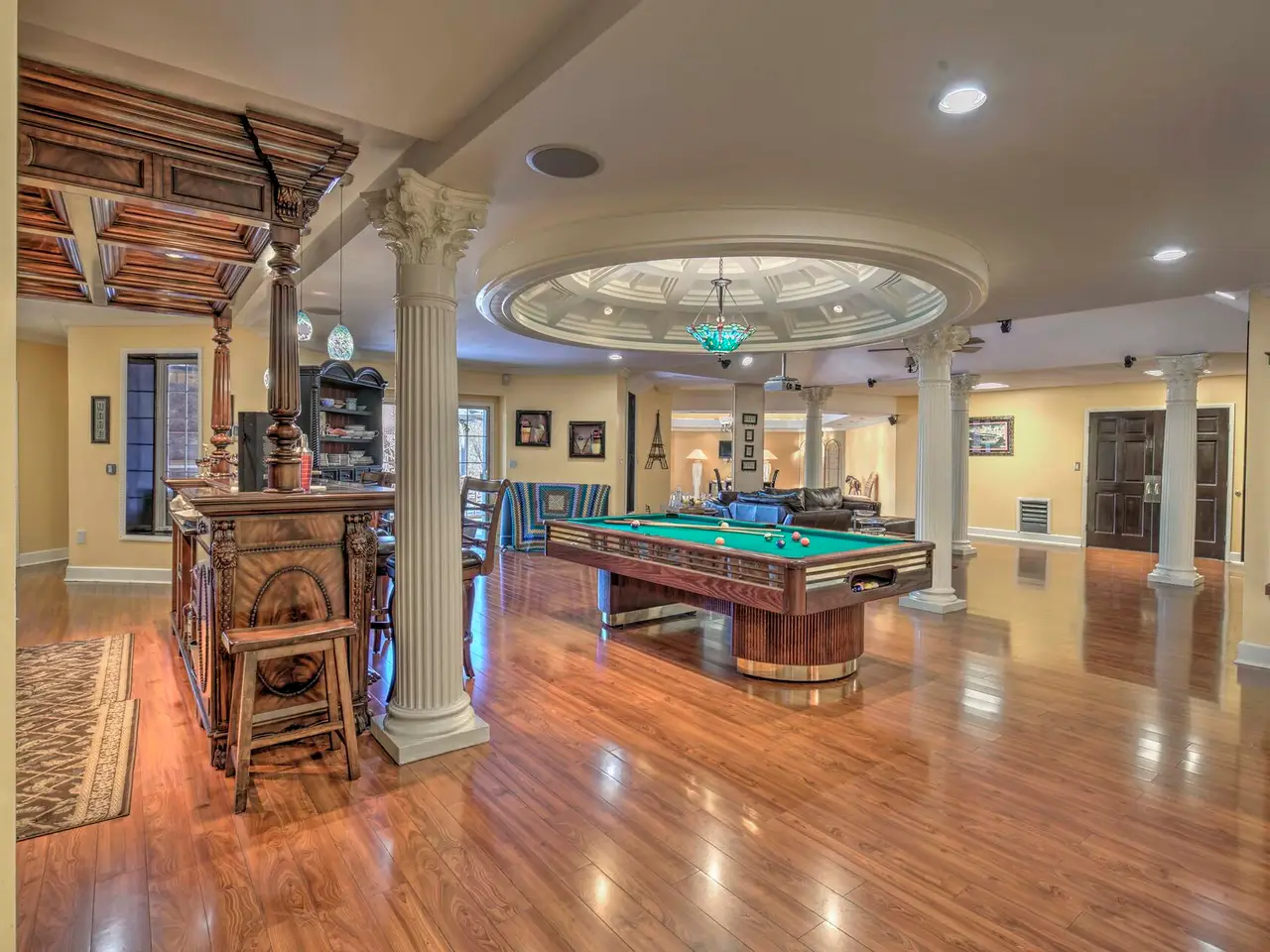 A grandly-designed architectural masterpiece offered by the original owners is surrounded by nearly 17 acres of natural beauty in Mendham Borough. This magical estate home offers a sophisticated 23-room floor plan filled with custom design elements such as artisanal millwork, hand painted murals, four gas fireplaces edged by distinctive mantles, flooring of honed marble and hardwood, stately columns, towering ceilings and an elevator serving all three levels. Stone-accented gates unfold to a long, tree-lined drive revealing this impressive mansion. The graceful layout provides seven bedrooms, two kitchens designed by Clive Christian, seven full baths, two powder rooms, an impeccably finished daylight lower level and an attached four-car garage with EV charging port. European design influences are seen in the stone and stucco exterior, porte-cochere side entry, turreted façade and slate roof of this epic 2005-built estate. Towering window walls and glass doors capture views of colorful gardens, stone patios, a lily pond with waterfall, vine-wrapped shade pergola, open lawns and a paver block front parking court centered by a bubbling water fountain. Situated on a private cul de sac, the scenic location provides ultimate tranquility. Introducing the home is a dramatic two-story foyer which adjoins several main gathering areas. A columned living room, fireside dining room, two-story great room and bright, airy conservatory are ideal for entertaining. In the Clive Christian kitchen, custom cabinetry, upper-end appliances, a center island, windowed dining area and adjacent butler's pantry are notable features. Upstairs, a sun-splashed loft area is perfect for relaxing and taking in the countryside vistas. A magnificent primary suite is arranged with a generous bedroom set under an elevated tray ceiling, a sitting room with a fireplace, dressing room and enormous spa-like bath containing a columned soaking tub, two oversized vanities and a separate shower. Additional bedrooms and baths on this level easily accommodate guests and family members. Graciously appointed rooms on the walkout lower level include an extra-large Clive Christian center island kitchen characterized by the designer's signature detailing, a banquet-sized dining room, entertaining area with a media space, ornately carved wood bar area and billiards space. Glass doors open to a stone patio overlooking bucolic property views. Located in Morris County's charming Mendham Borough, this custom estate is convenient to local shops, restaurants, highly-rated public and private schools, highways and Midtown Direct train service in neighboring Morristown.