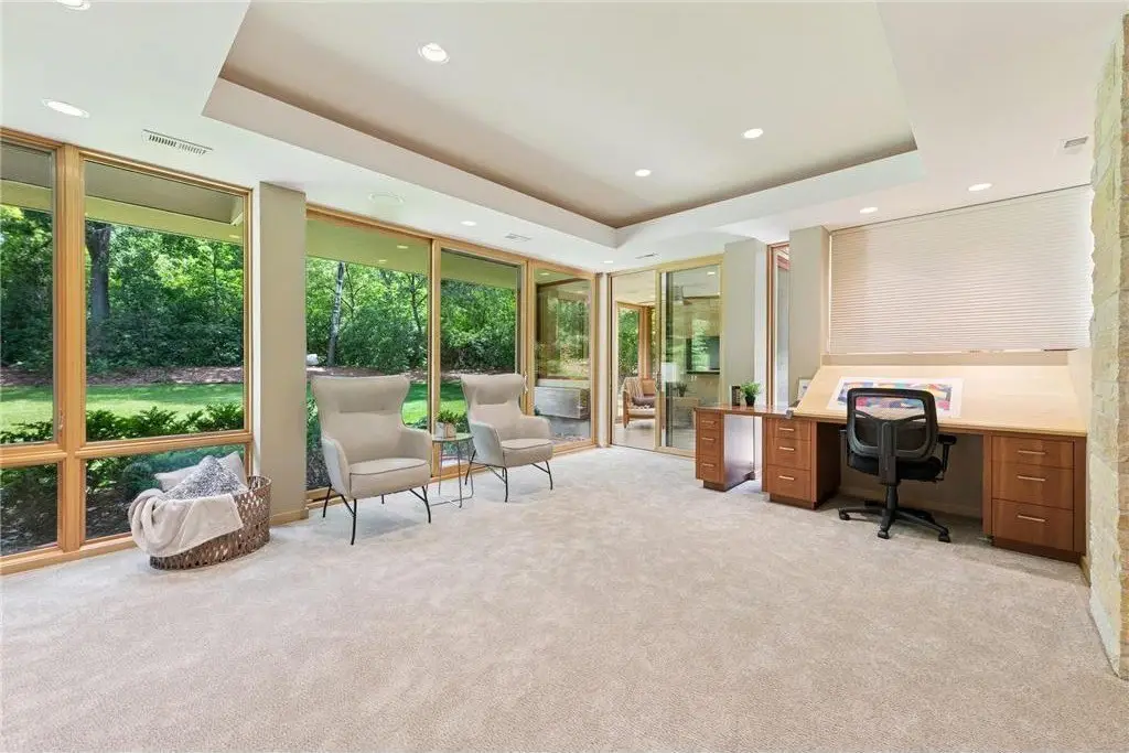 Artful Architecture that truly embraces the ample green spaces of this acreage setting. These are distinguishing aspects of this crowning achievement by an award winning Architect of international acclaim. Privacy without isolation as thoughtful placement of windows & landscape designed to assure great sightlines! Reward yourself in a main floor owner's suite with spa-inspired, dual baths. The clerestory great room is truly awe-inspiring, a daily delight for you & so impressive for guests. Plus, a wealth of natural light is here, even in the lower level with multiple walk-outs. An Oscar worthy theater is here with raked audience seating & grants 18 people a spectacular view of the very large TV screen. Acoustics were professionally designed for great sound throughout the theater. Ideal cinematic experiences start here & they start whenever you wish! A large finished space backstage gives you room to stage live events. Do you want an elevator? Yes, there's a space for that too. In addition to a game room, another space accommodates a pool table & this flows gracefully to a family room with fireplace. Education pursuits have their place in the upstairs study, so your main floor office is just for you. Plus, there is another large room with cabinets & a walk-in closet that is currently seen as an art studio, that could become your 2nd office, a music room and more. The 4 season porch, just off the studio has independent A/c & heating, with sliding patio glass doors on 3 sides. Enjoy the great outdoors, all 4 decks, a pair of patios, a 4 season porch & the sport court all offer amazing functionality & blissful privacy. Daily ease of living & grateful guests looking forward to their next invitation. Your joyful celebrations have ideal spaces here!