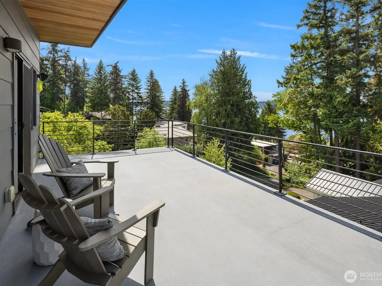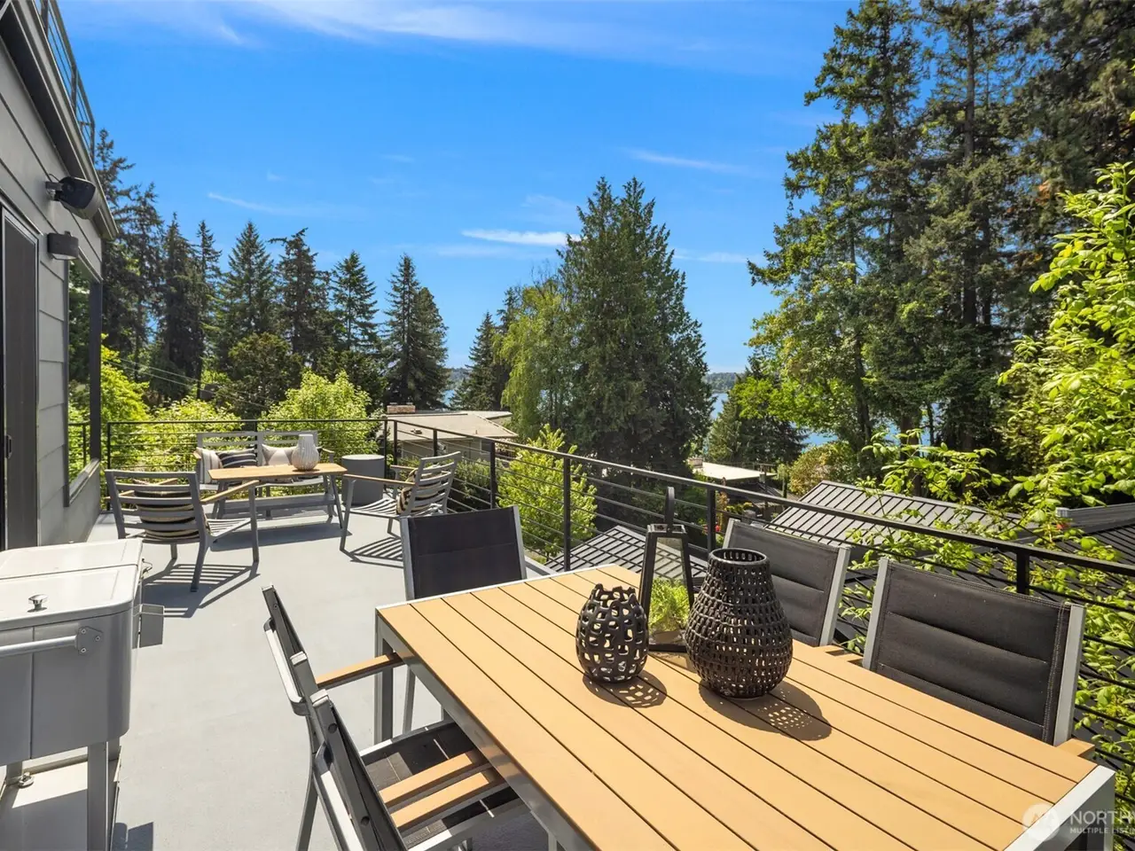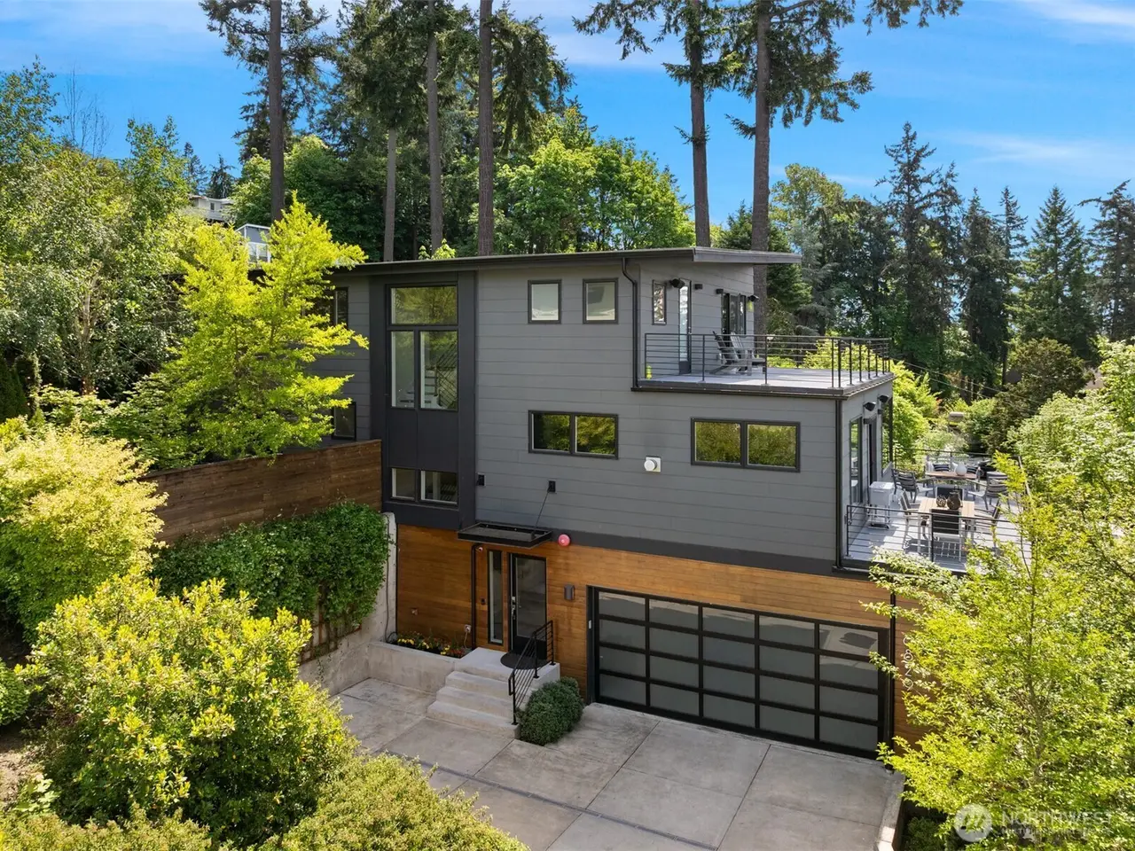 Escape to this modern urban retreat nestled on Mercer Island's North End. Its open interiors live like new with expansive windows framing stunning sunsets & views to the lake, Seattle skyline, & Olympics beyond. Relax or gather in spacious living & dining areas flowing around a grand epicurean's kitchen, chefs will love the Thermador range & massive waterfall island. Step out for alfresco dining on a view deck. Clean lines & high-end finishes continue upstairs in the primary suite escape with its own private balcony. Great flex space with 4 more bedrooms + den & rec room. Certified green built by Build Urban with heating/cooling, radiant heating + EV charger. Stroll to waterfront beaches, or follow nearby path to downtown MI.