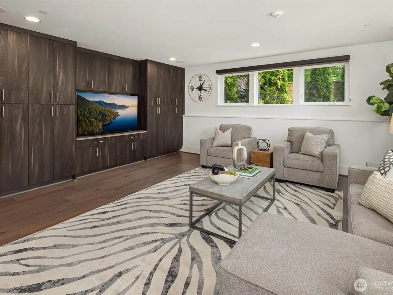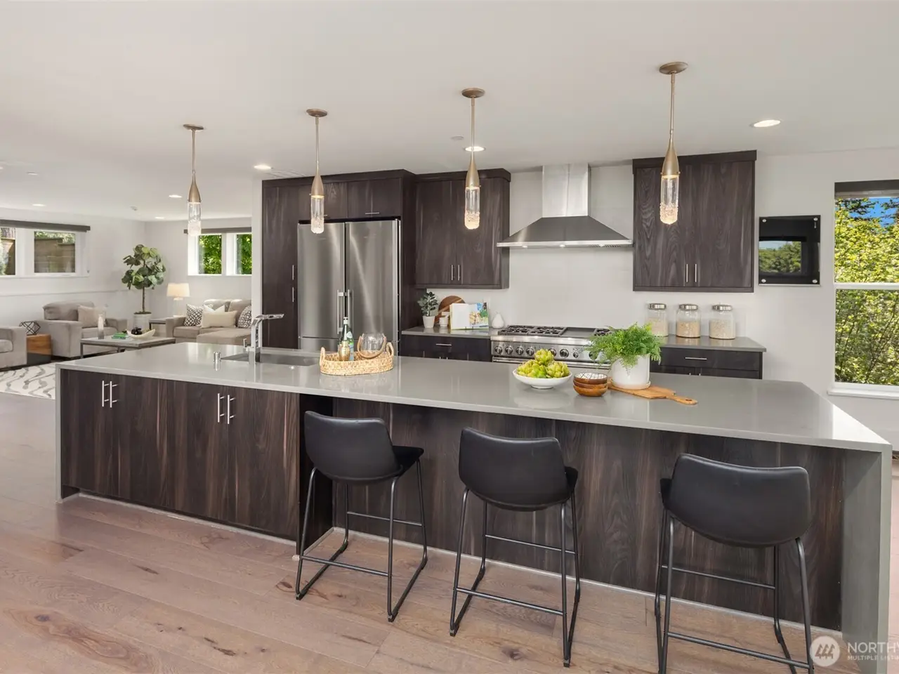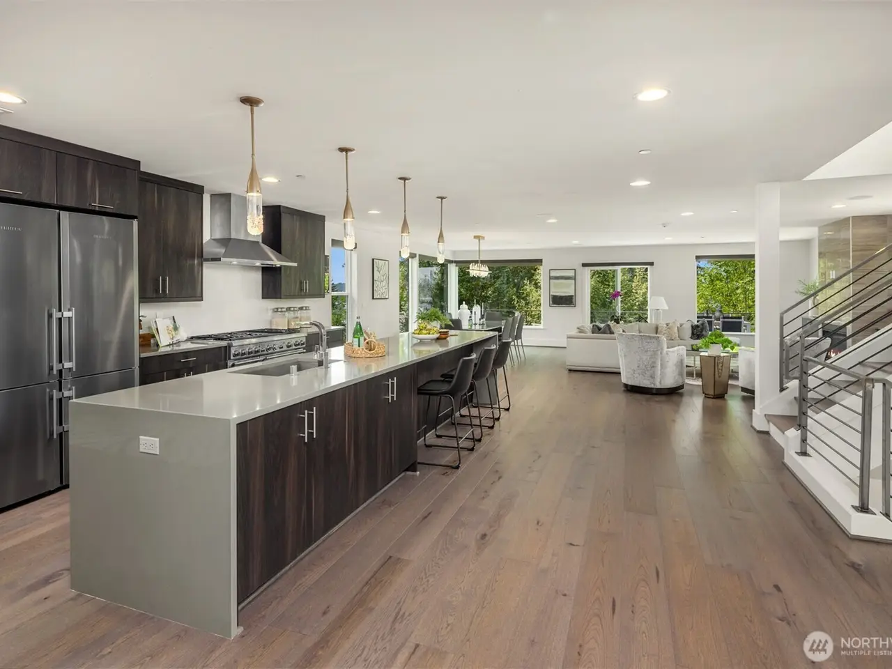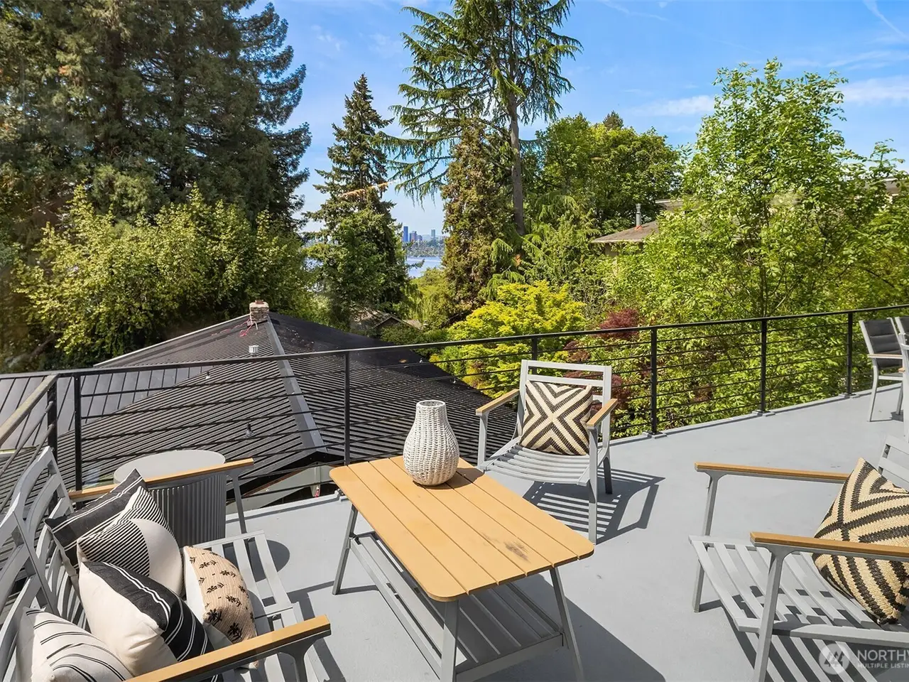 Escape to this modern urban retreat nestled on Mercer Island's North End. Its open interiors live like new with expansive windows framing stunning sunsets & views to the lake, Seattle skyline, & Olympics beyond. Relax or gather in spacious living & dining areas flowing around a grand epicurean's kitchen, chefs will love the Thermador range & massive waterfall island. Step out for alfresco dining on a view deck. Clean lines & high-end finishes continue upstairs in the primary suite escape with its own private balcony. Great flex space with 4 more bedrooms + den & rec room. Certified green built by Build Urban with heating/cooling, radiant heating + EV charger. Stroll to waterfront beaches, or follow nearby path to downtown MI.