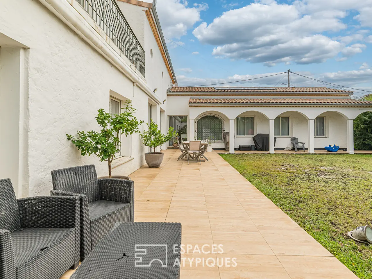 RARE in the heart of downtown Merignac, a 2-minute walk from the church and the tram, this spacious, fully renovated Hacienda-style family home seduces with its spaciousness and calm.The entrance leads to a large, semi-open fitted kitchen leading to a spacious cathedral-style living room of over 50m2. To complete the ground floor, the master suite offers a surface area of 45m2 with its dressing room and bathroom. A staircase mixing wood and glass leads to four bedrooms, one of which has a shower room, a bathroom and a separate toilet.On the garden side, the 1080 m2 plot is divided between a planted area and a heated swimming pool area (9×4) hidden from view. Part of the 60m2 wing of the house is now converted into a waiting room and two rooms which currently serve as offices, perfect for a liberal profession or a project of guest rooms/short-term rentals.A pantry, a large cellar and an adjoining garage will delight a family looking for space and peace and quiet just a few steps from all amenities.ENERGY CLASS: B / CLIMATE CLASS: A. Estimated average annual energy expenditure for standard use, based on 2024 energy prices: between 2120 and 2940 euros.Tommy Bertrand (EI) Sales Agent: 06 13 39 29 78 / RSAC number: 952 660 272 Bordeaux.REF. BORDEAUX-2148EABXAdditional information* 9 rooms* 6 bedrooms* Outdoor space : 1080 SQM* Property tax : 5 366 €Energy Performance CertificatePrimary energy consumptionb : 109 kWh/m2.yearHigh performance housing*A*109kWh/m2.year3*kg CO2/m2.yearB*C*D*E*F*GExtremely poor housing performance* Of which greenhouse gas emissionsa : 3 kg CO2/m2.yearLow CO2 emissions*3kg CO2/m2.yearA*B*C*D*E*F*GVery high CO2 emissionsEstimated average annual energy costs for standard use, indexed to specific years 2021, 2022, 2023 : between 2120 € and 2940 € Subscription IncludedAgency feesThe fees include VAT and are payable by the vendorMediatorMediation Franchise-Consommateurswww.mediation-franchise.com29 Boulevard de Courcelles 75008 ParisInformation on the risks to which this property is exposed is available on the Geohazards website : www.georisques.gouv.fr