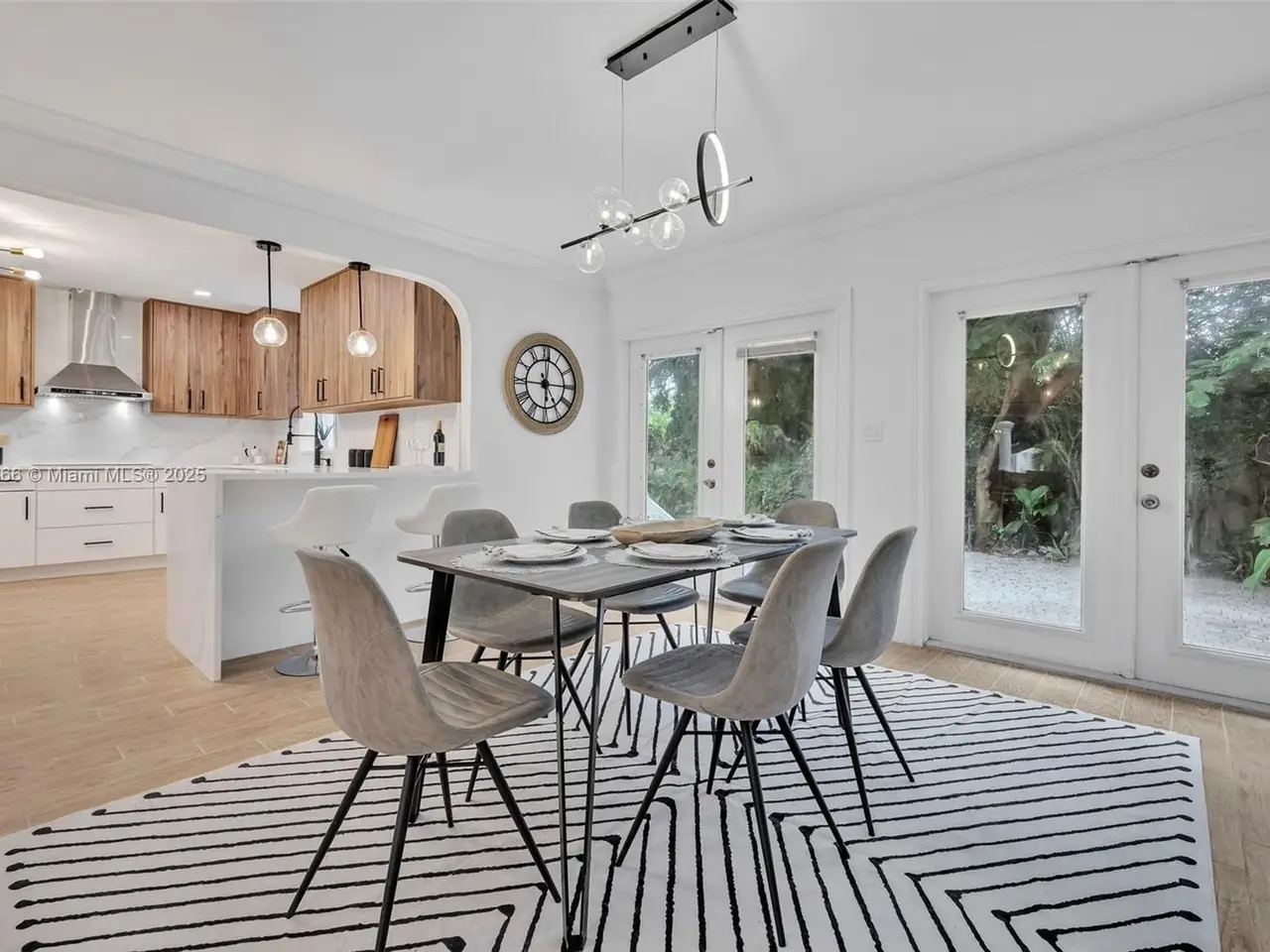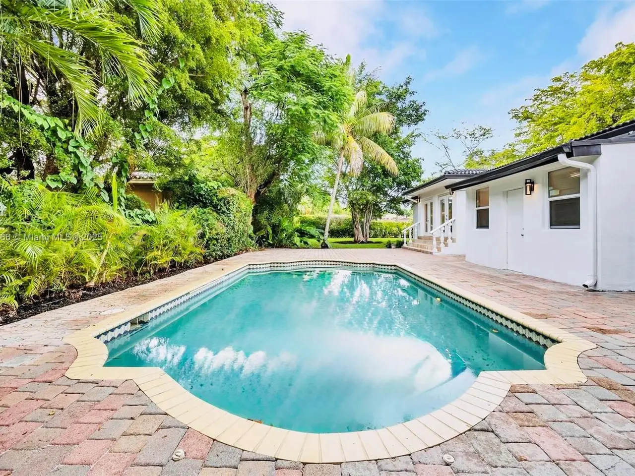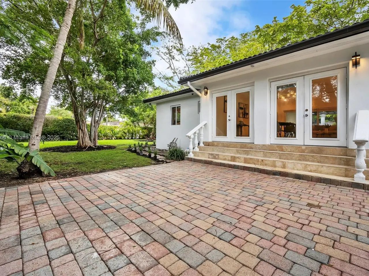 • French doors leading to tropical backyard oasis