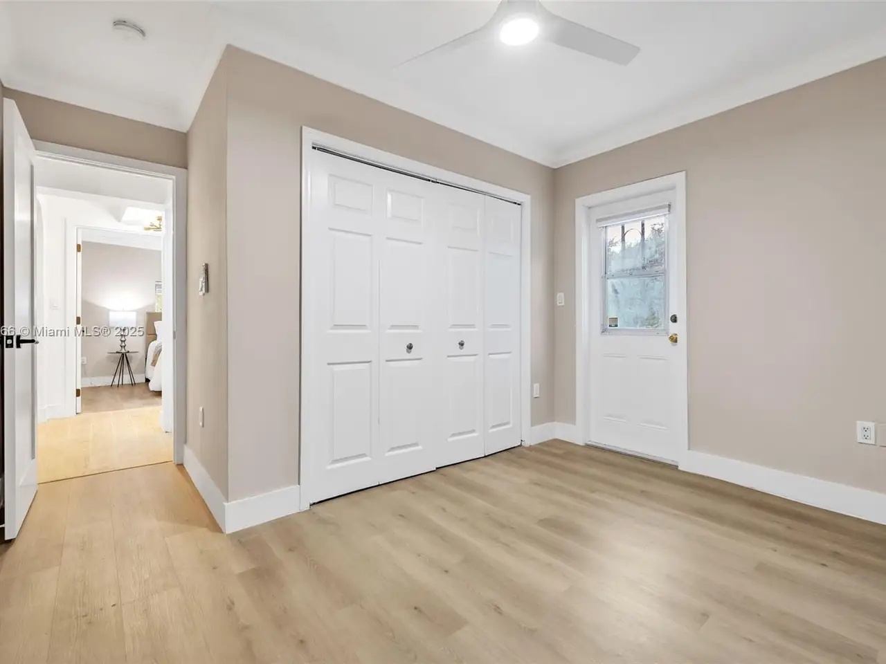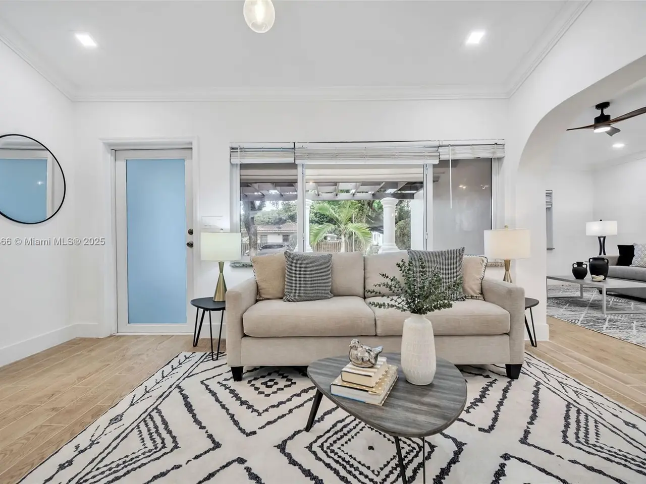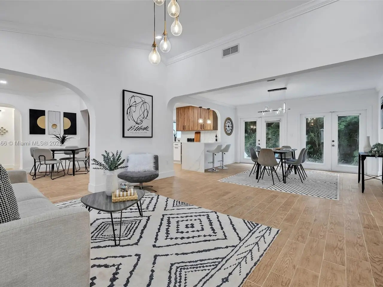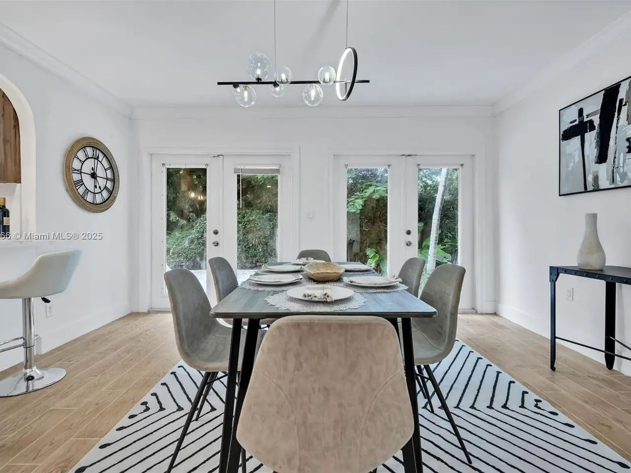 • French doors leading to tropical backyard oasis