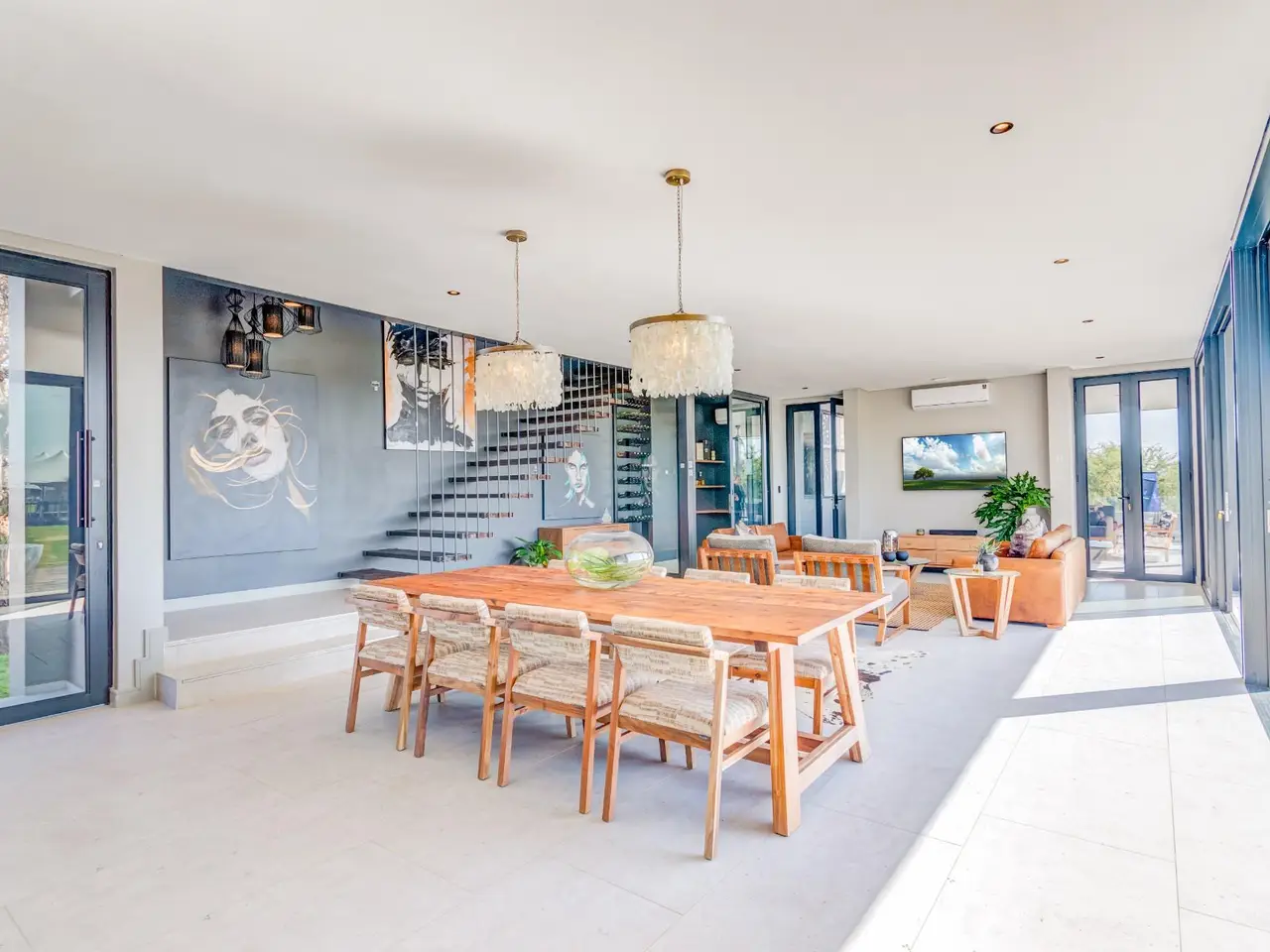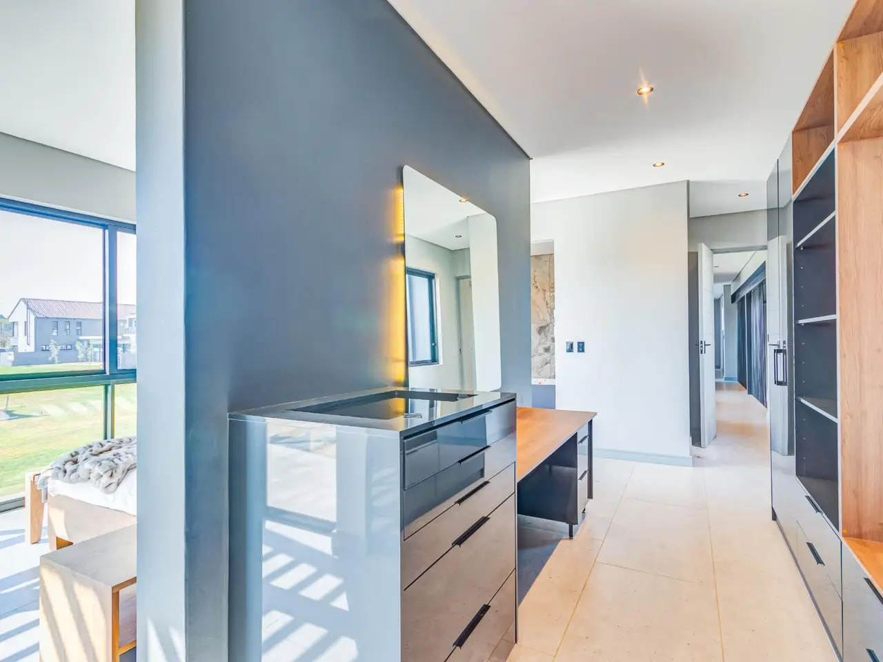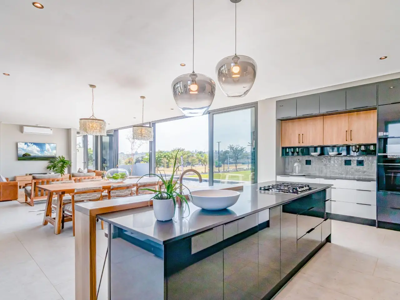 Welcome to this exquisite 5-bedroom home nestled in the sought-after estate of Helderfontein. This luxurious residence boasts a modern open-plan kitchen equipped with a built-in oven and microwave, a gas stove, and abundant cupboard space. The kitchen seamlessly connects to the pantry and scullery, which accommodates three appliances, making daily chores a breeze. The kitchen overlooks the elegant dining and lounge area, highlighted by a stunning statement chandelier and staircase. These living spaces extend to a patio equipped with a gas braai and extractor, perfect for entertaining. Outside, you'll find a spacious boma and a sparkling pool, ideal for relaxation and outdoor gatherings. Each of the five bedrooms in this home is en-suite, offering privacy and unique designs. The guest bedroom, conveniently located on the ground floor, provides easy access for visitors. Upstairs, the four additional bedrooms include the master suite, which features a beautiful view, a walk-in closet, and a luxurious bathroom with a double basin, dual shower heads, a unique modern bath, and a private toilet. The upper level also hosts a sizable pajama lounge, offering a cozy retreat for family time or relaxation and a kitchen net with an extended desk for your convenience. Completing this impressive property is a triple garage with direct access to the kitchen and a staff room at the back, ensuring convenience and functionality. The home is equipped with solar power and a heating pump, providing energy efficiency and sustainability. This residence in Helderfontein Estate is the epitome of luxury living, combining elegant design, practical amenities, and a prime location for an exceptional lifestyle. Don't miss out on this beautiful home, contact us for a viewing!!