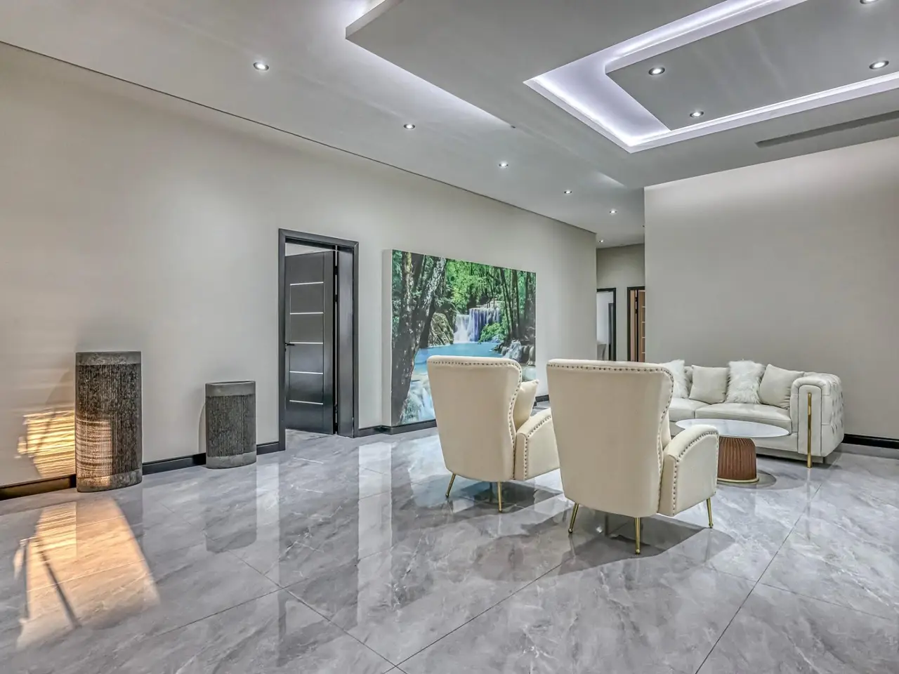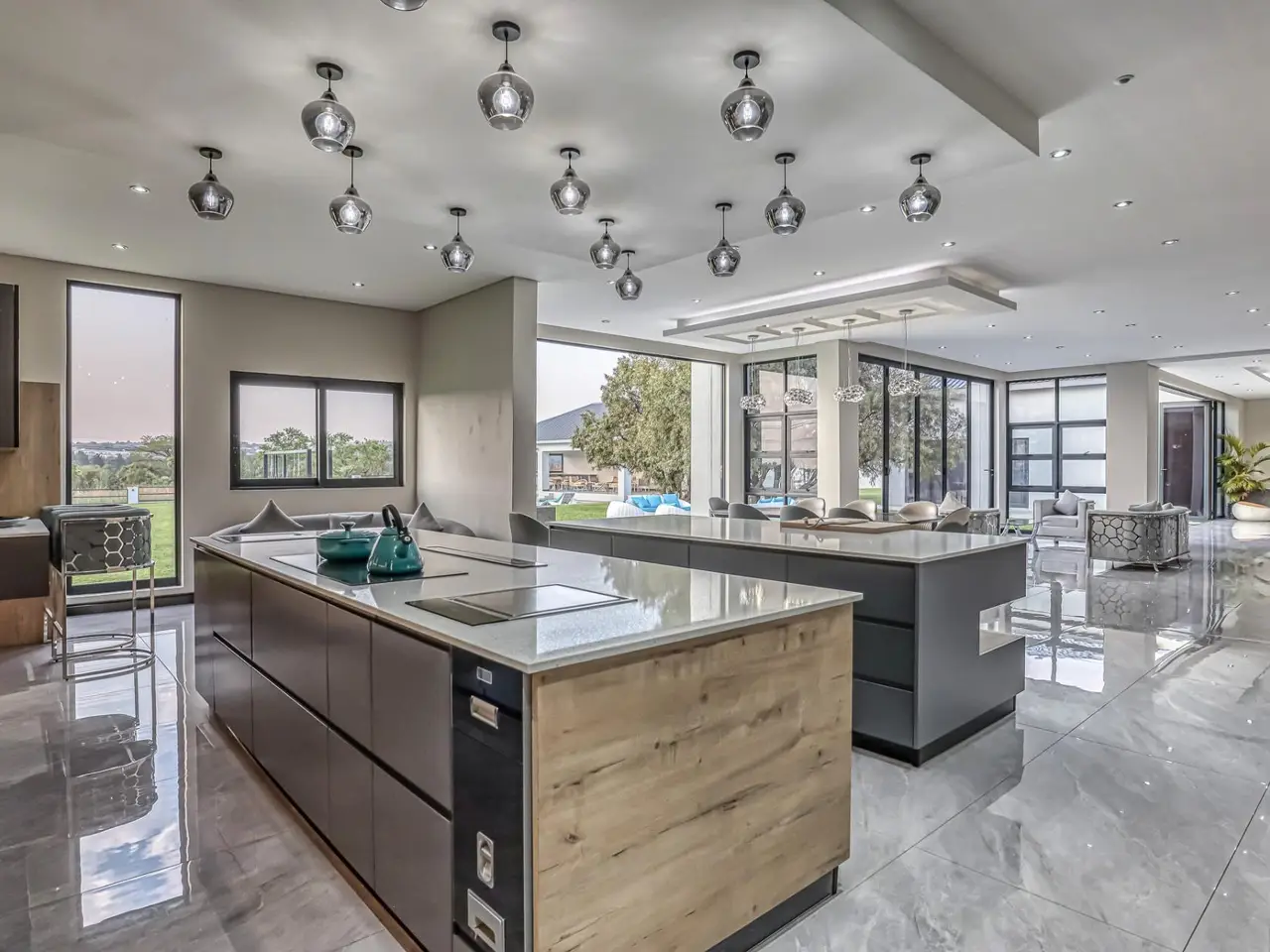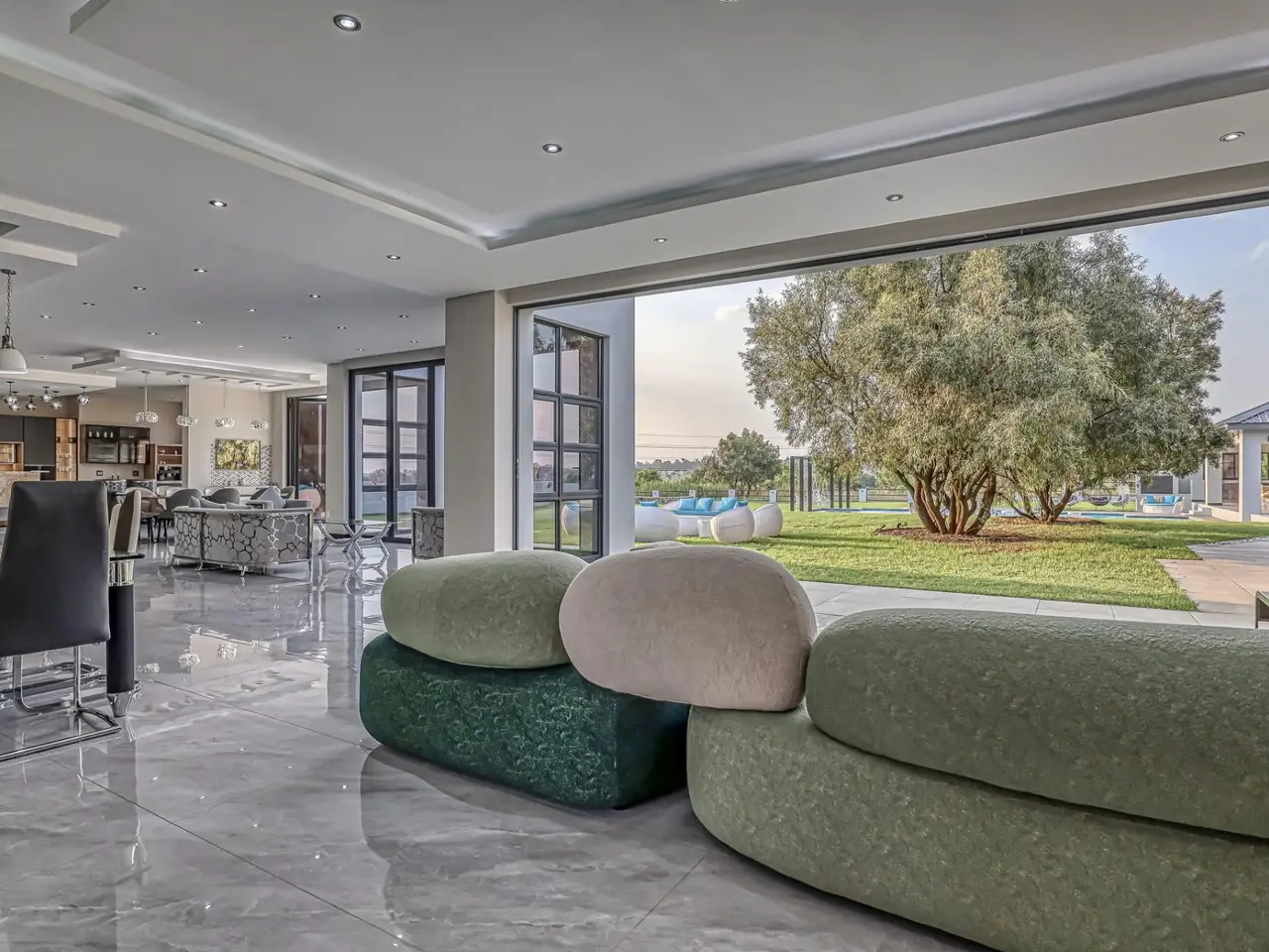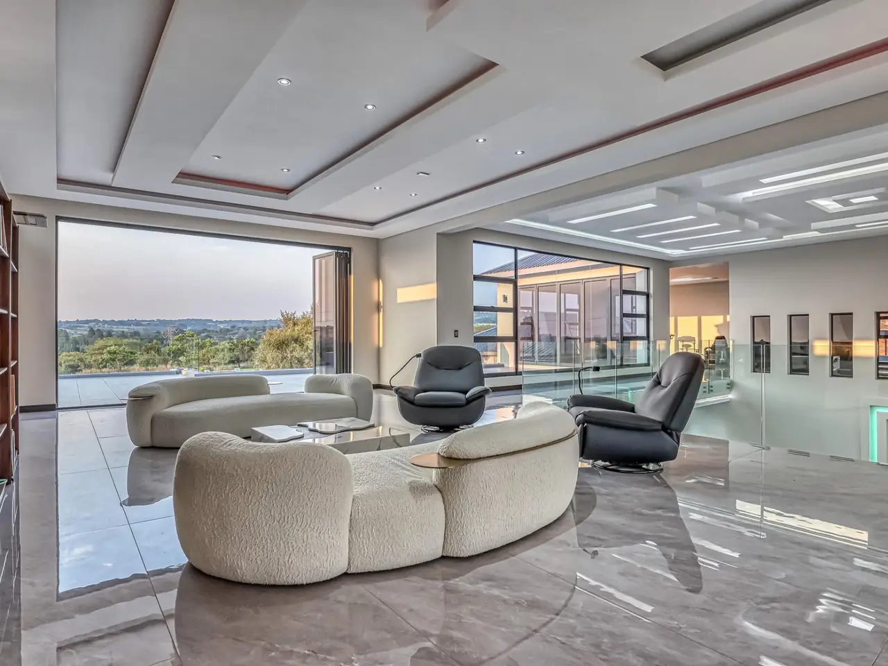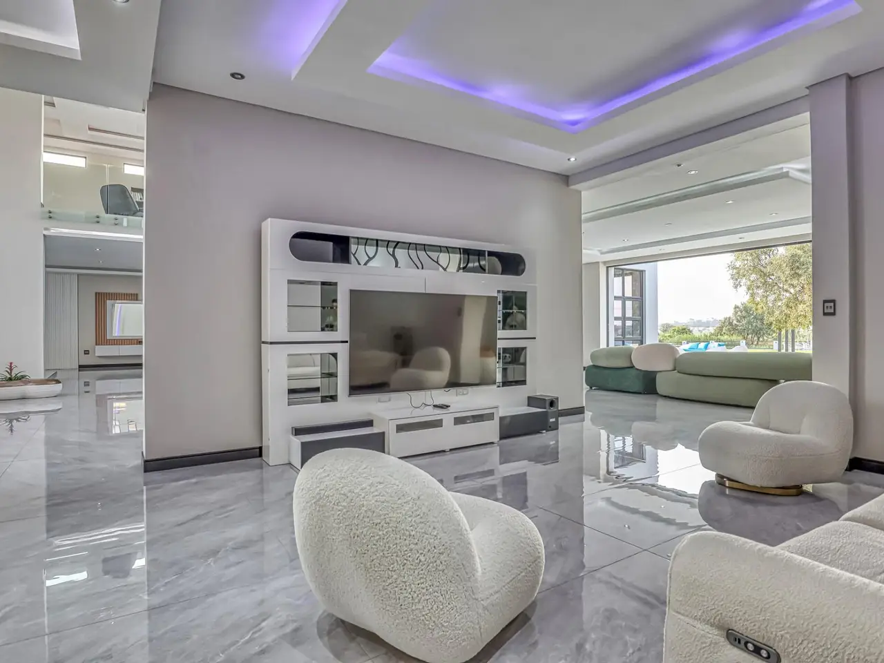 A Symphony of Glamour, Prestige & Modern Grandeur Excellence, prestige, and pure glamour define this ultra-luxurious 1,500sqm contemporary masterpiece set on a 5,000sqm stand in the elite Blue Hills Equestrian Estate GÇö a sanctuary for those who appreciate bold architecture, indulgent finishes, and the art of sophisticated living. From the moment you arrive, flowing water features, sleek lines, and grand proportions set the tone. The welcoming entrance hall unfolds into a world of opulent living GÇö formal lounges, a statement bar and champagne bar, and a series of entertainment zones designed for lavish gatherings and sunset soir+¬es. Expansive glass doors open to sun-drenched terraces where gold hues of the evening sky meet modern glamour. At the heart of the home lies a state-of-the-art kitchen, fitted with premium appliances, designer lighting, and bespoke cabinetry GÇö complemented by a walk-in pantry and meticulously planned scullery for seamless functionality. Five sumptuous en-suite bedrooms, each with elegant walk-in dressing rooms, offer privacy and comfort GÇö all thoughtfully positioned on the ground level. A private cinema room and family lounges invite relaxation in ultimate style. Ascend to the upper level, where an entire floor is dedicated to recreation and leisure GÇö featuring a fully equipped gym, library, billiards and ping pong area, and breathtaking panoramic views of the countryside. Outdoors, a west-facing pool house steals the show GÇö complete with a designer kitchen, gas cooking facilities, bathroom, and expansive seating and dining areas overlooking the sparkling pool. Perfect for sunset entertaining and endless summer nights. Luxury meets performance with a 20kW solar backup system with 28 panels, 10,000L water backup, staff suite, four spacious garages, and ample parking for five additional cars. This is a home for the connoisseur of fine living GÇö bold, beautiful, and utterly unforgettable. A once-in-a-lifetime opportunity to own a residence that redefines luxury.