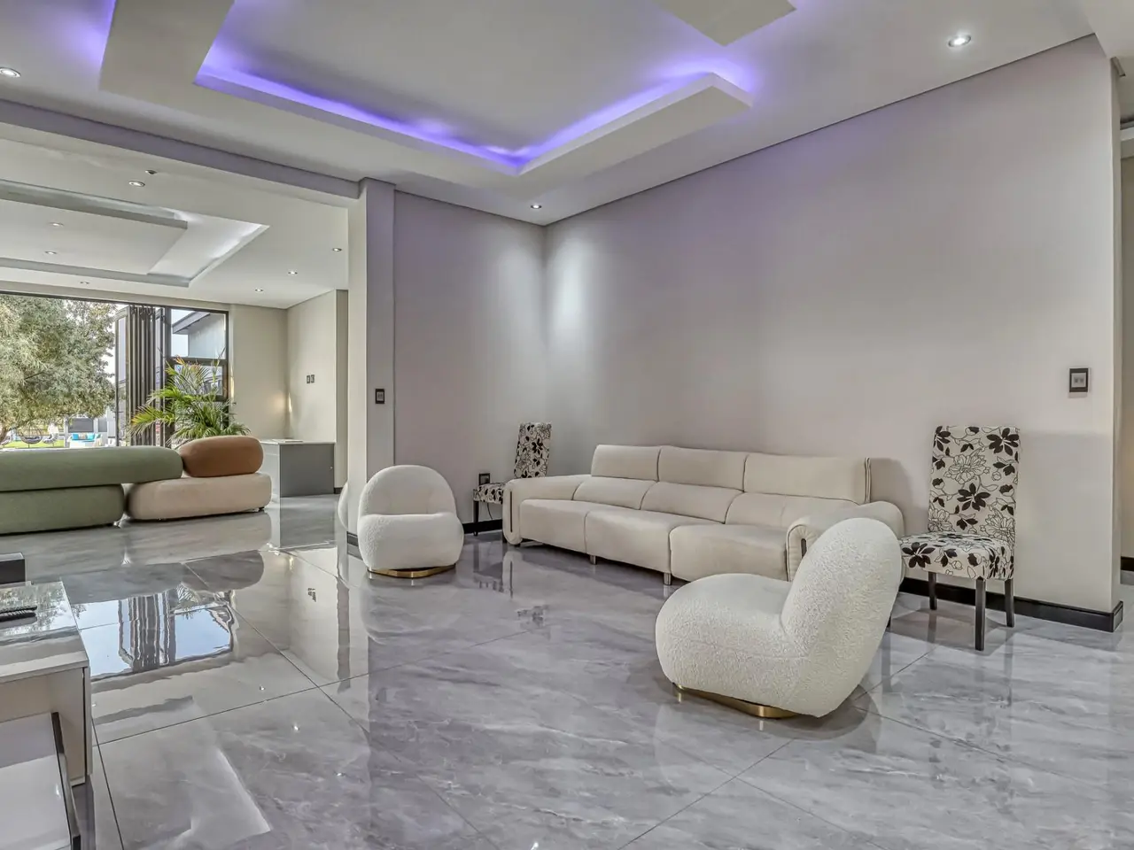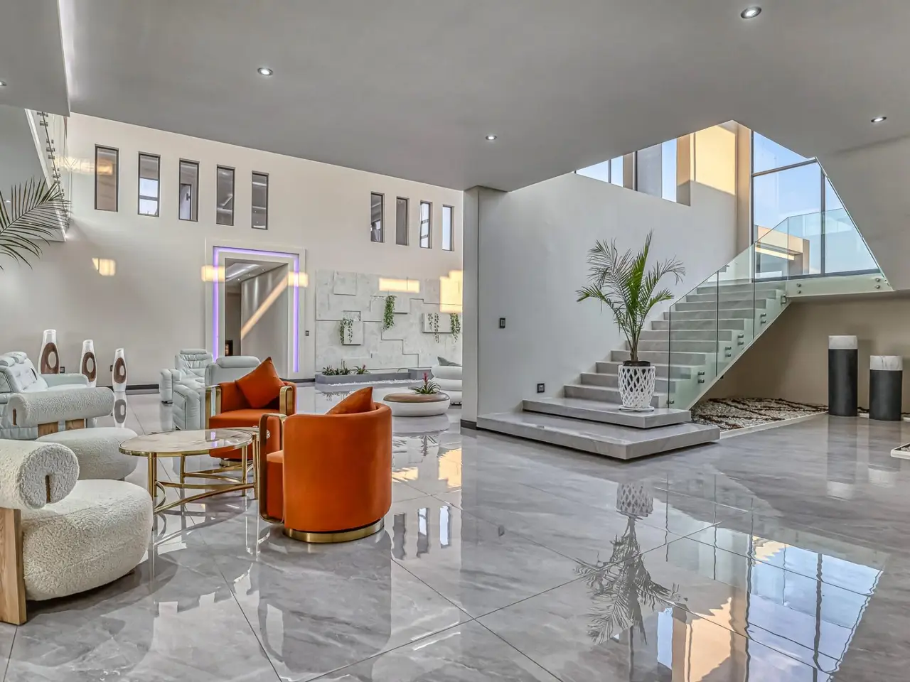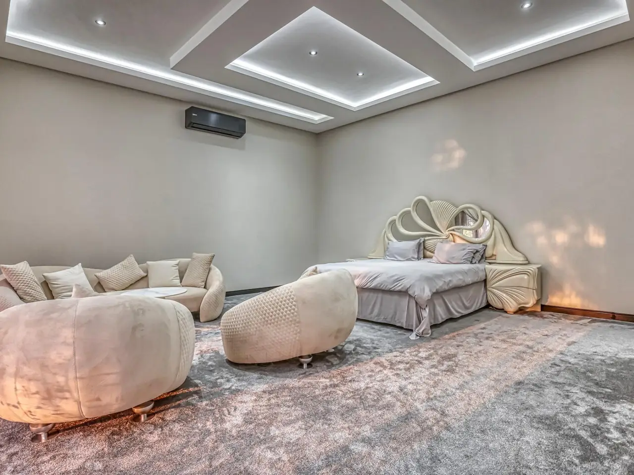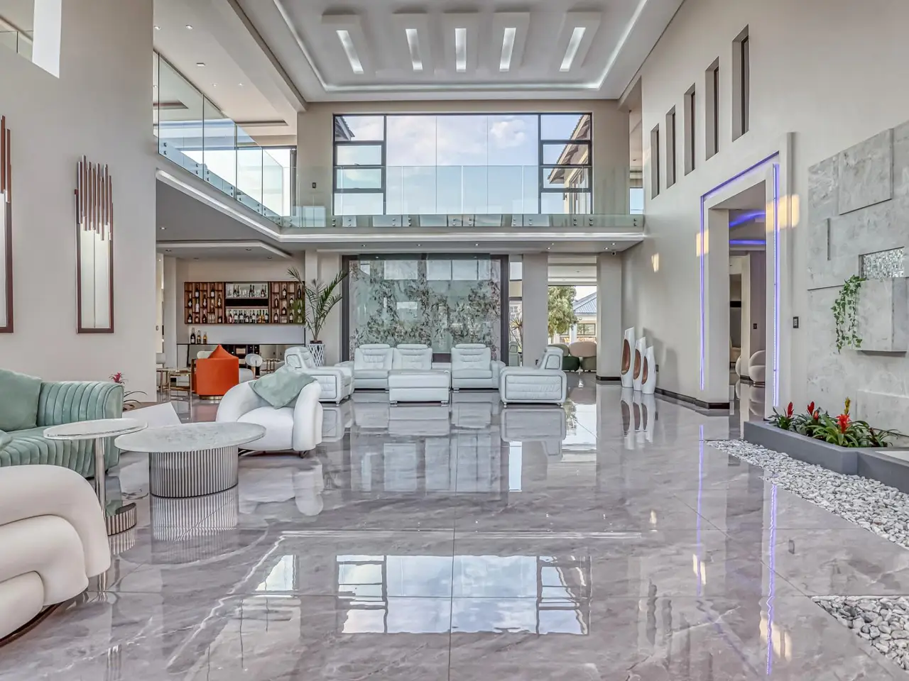 A Symphony of Glamour, Prestige & Modern Grandeur Excellence, prestige, and pure glamour define this ultra-luxurious 1,500sqm contemporary masterpiece set on a 5,000sqm stand in the elite Blue Hills Equestrian Estate GÇö a sanctuary for those who appreciate bold architecture, indulgent finishes, and the art of sophisticated living. From the moment you arrive, flowing water features, sleek lines, and grand proportions set the tone. The welcoming entrance hall unfolds into a world of opulent living GÇö formal lounges, a statement bar and champagne bar, and a series of entertainment zones designed for lavish gatherings and sunset soir+¬es. Expansive glass doors open to sun-drenched terraces where gold hues of the evening sky meet modern glamour. At the heart of the home lies a state-of-the-art kitchen, fitted with premium appliances, designer lighting, and bespoke cabinetry GÇö complemented by a walk-in pantry and meticulously planned scullery for seamless functionality. Five sumptuous en-suite bedrooms, each with elegant walk-in dressing rooms, offer privacy and comfort GÇö all thoughtfully positioned on the ground level. A private cinema room and family lounges invite relaxation in ultimate style. Ascend to the upper level, where an entire floor is dedicated to recreation and leisure GÇö featuring a fully equipped gym, library, billiards and ping pong area, and breathtaking panoramic views of the countryside. Outdoors, a west-facing pool house steals the show GÇö complete with a designer kitchen, gas cooking facilities, bathroom, and expansive seating and dining areas overlooking the sparkling pool. Perfect for sunset entertaining and endless summer nights. Luxury meets performance with a 20kW solar backup system with 28 panels, 10,000L water backup, staff suite, four spacious garages, and ample parking for five additional cars. This is a home for the connoisseur of fine living GÇö bold, beautiful, and utterly unforgettable. A once-in-a-lifetime opportunity to own a residence that redefines luxury.
