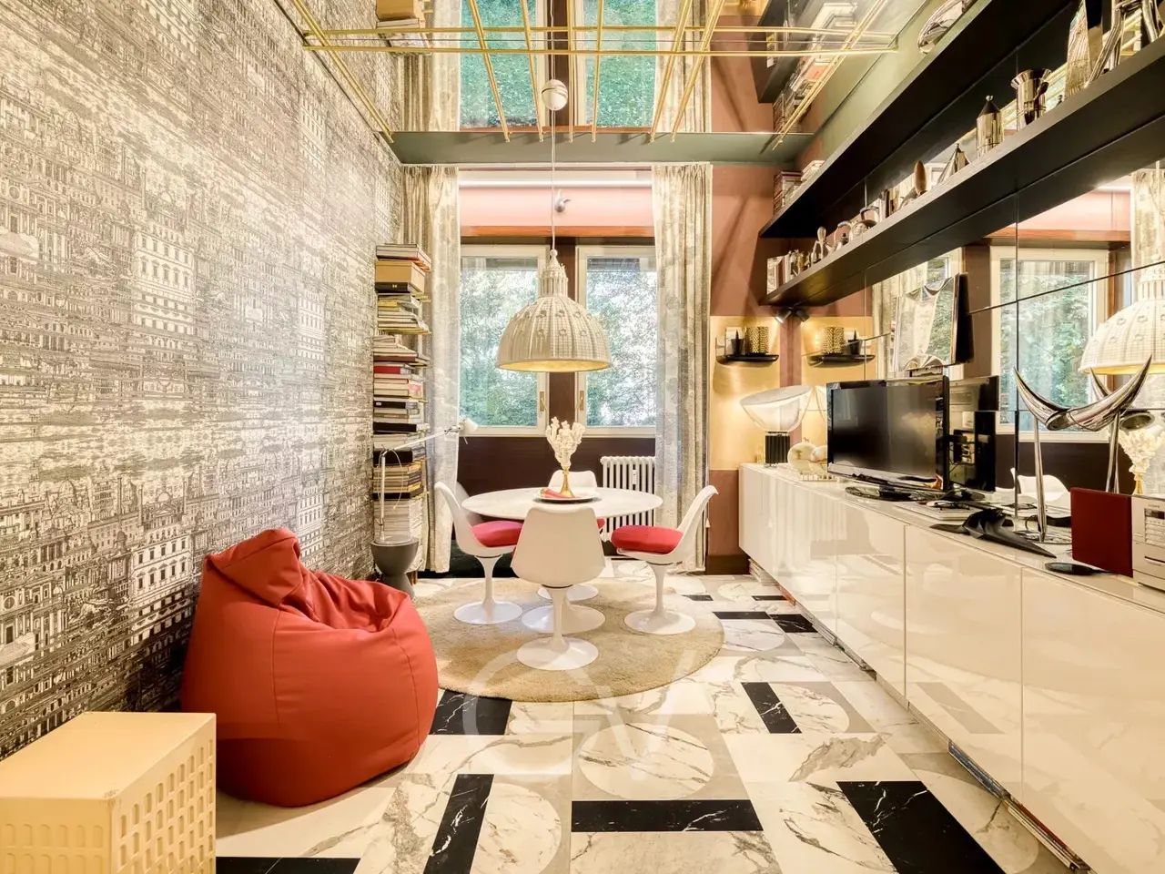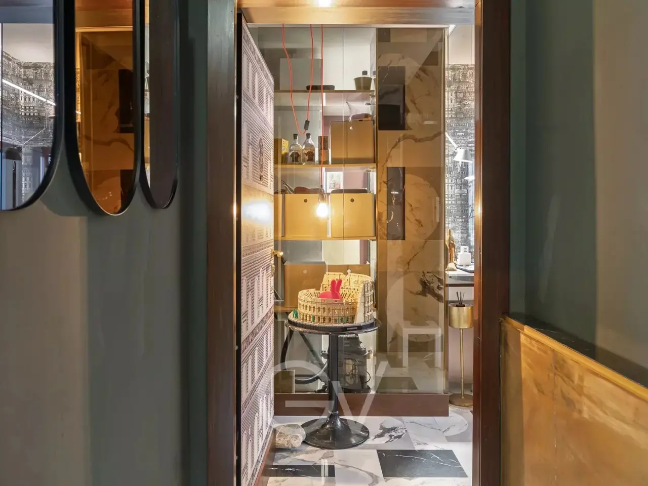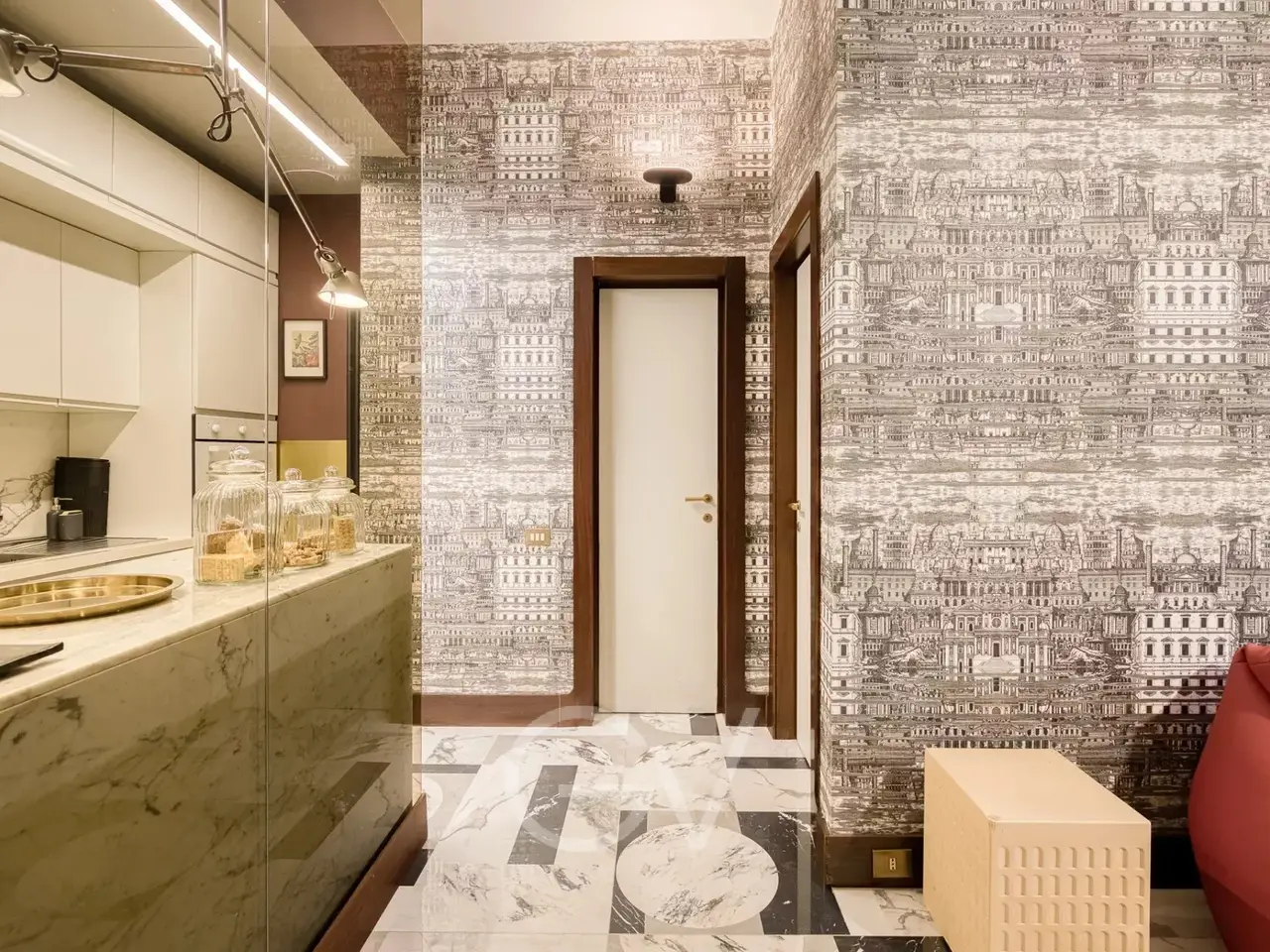 gv1369 - Senato, via Marina - In the heart of Milan, design and charm in cozy-chic two-room apartment. A charming and elegant 57sqm apartment is a marvelous peaceful nest, a chic oasis of sophisticated refinement where every detail is cured and studied to add beauty which goes well with the wonderful location, Via Marina, one of the most beautiful and seeked street of Milan, surrounded by secret gardens, in the historical center heart of Milan, just a few steps away from the Shopping District, but even more chic because it is immersed in the silence and exclusivity of living in one of the few residences present. The entrance, from the stately 1950’s building signed by the Architect Ignazio Gardella, opens in a private position on the mezzanine floor on an entrance with armoured door, from which takes shape a disengagement beautifully decorated with brass plates and marble-effect inlay stoneware which already makes you enter in the mood of the dwelling, which is accessed with a second armoured door. Here it develops a magnificent living room, overlooking the greenery and the Senato secret gardens, where the Fornasetti wallpaper invites you into a world of refined architecture, amplified by the mirrored wall and embellished by the long black marble shelf. In front of it, the eat-in kitchen remains semi-open and is on the other hand essential, white and well organized. The master bedroom also is illuminated by two large flanked windows and has a space for a big wardrobe. The windowed bathroom, also finely decorated in marble, has a wide shower and Gio Ponti taps in the brass series for Momoli. To complete a cellar and a suitable condominium area in use of the apartment used as a laundry / storage room with an additional balcony area to move the containers. The apartment is delivered with air conditioning and complete of all the fixed furnitures with the possibility of detecting the magnificent design furnitures present on request. The splendidly rationalist building faithful to Gardella’s Lombard tradition has centralized heating and presents large, majestic, common spaces that embellish the dwelling as well as an impeccable concierge service. Class F – Ipe 232,14. € 950.000. The choice of this property helps to support the mission of Theodora onlus. Photos, texts, floor plans, etc., are purely for indicative-illustrative purposes and do not constitute documents with contractual value and assumption. Giorgio Viganò Real Estate - 027636151 - www.giorgiovigano.com