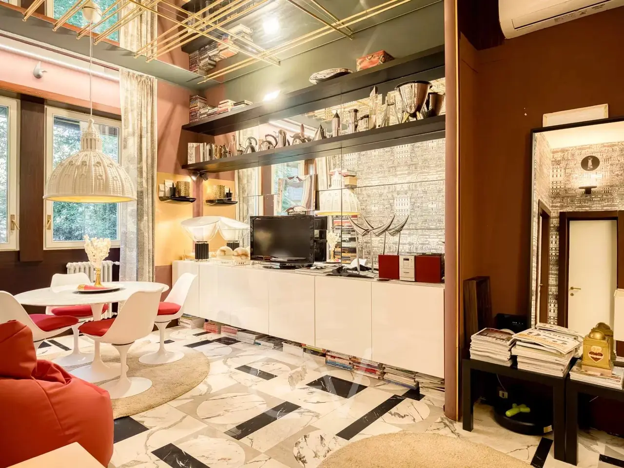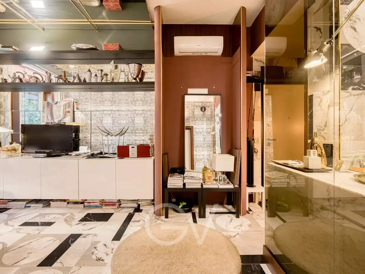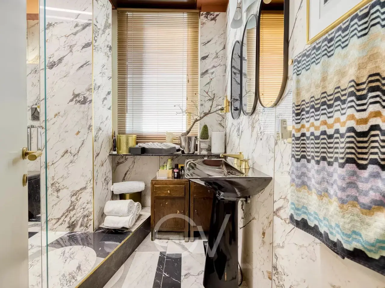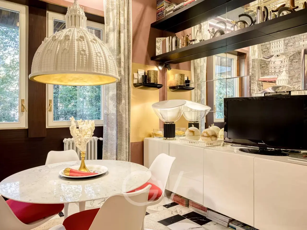 gv1369 - Senato, via Marina - In the heart of Milan, design and charm in cozy-chic two-room apartment. A charming and elegant 57sqm apartment is a marvelous peaceful nest, a chic oasis of sophisticated refinement where every detail is cured and studied to add beauty which goes well with the wonderful location, Via Marina, one of the most beautiful and seeked street of Milan, surrounded by secret gardens, in the historical center heart of Milan, just a few steps away from the Shopping District, but even more chic because it is immersed in the silence and exclusivity of living in one of the few residences present. The entrance, from the stately 1950’s building signed by the Architect Ignazio Gardella, opens in a private position on the mezzanine floor on an entrance with armoured door, from which takes shape a disengagement beautifully decorated with brass plates and marble-effect inlay stoneware which already makes you enter in the mood of the dwelling, which is accessed with a second armoured door. Here it develops a magnificent living room, overlooking the greenery and the Senato secret gardens, where the Fornasetti wallpaper invites you into a world of refined architecture, amplified by the mirrored wall and embellished by the long black marble shelf. In front of it, the eat-in kitchen remains semi-open and is on the other hand essential, white and well organized. The master bedroom also is illuminated by two large flanked windows and has a space for a big wardrobe. The windowed bathroom, also finely decorated in marble, has a wide shower and Gio Ponti taps in the brass series for Momoli. To complete a cellar and a suitable condominium area in use of the apartment used as a laundry / storage room with an additional balcony area to move the containers. The apartment is delivered with air conditioning and complete of all the fixed furnitures with the possibility of detecting the magnificent design furnitures present on request. The splendidly rationalist building faithful to Gardella’s Lombard tradition has centralized heating and presents large, majestic, common spaces that embellish the dwelling as well as an impeccable concierge service. Class F – Ipe 232,14. € 950.000. The choice of this property helps to support the mission of Theodora onlus. Photos, texts, floor plans, etc., are purely for indicative-illustrative purposes and do not constitute documents with contractual value and assumption. Giorgio Viganò Real Estate - 027636151 - www.giorgiovigano.com