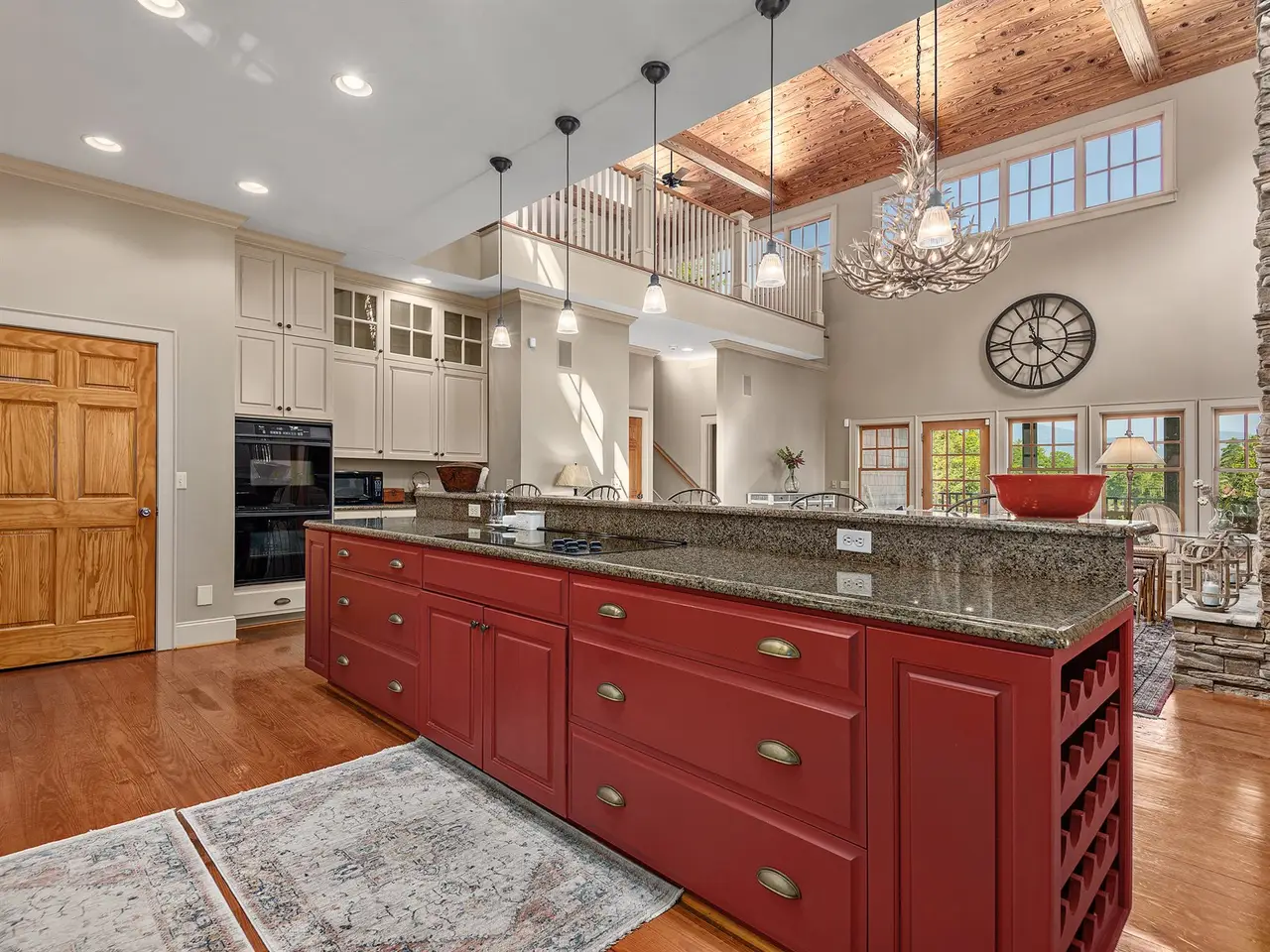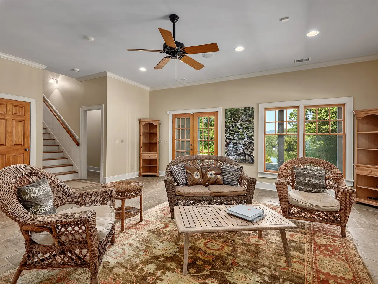 Idyllic lakefront home tucked in a private cove on Lake Adger is the perfect mountain getaway! Featuring year-round lake and mountain views, this home sits close to the water and has a gentle sloped yard with stone pathway to the lake and your own floating dock. This home checks all the boxes including an open floor plan, a large versatile kitchen, warm pine wood floors, and a marvelous great room with a dramatic two-story stacked stone fireplace and vaulted wood ceilings. The rooms are spacious, and the ceilings are almost 10' tall throughout. Relax and listen to the splashing creek from the wraparound covered porch or terrace level patio. Create the ultimate home office on the second level loft. Invite all of your friends because there is plenty of room including a terrace level family room with entertainment kitchenette, a large bunk room, and bonus rooms throughout. Loads of storage, and an attached tandem garage with plenty of room to store your water toys. This is the lake life!