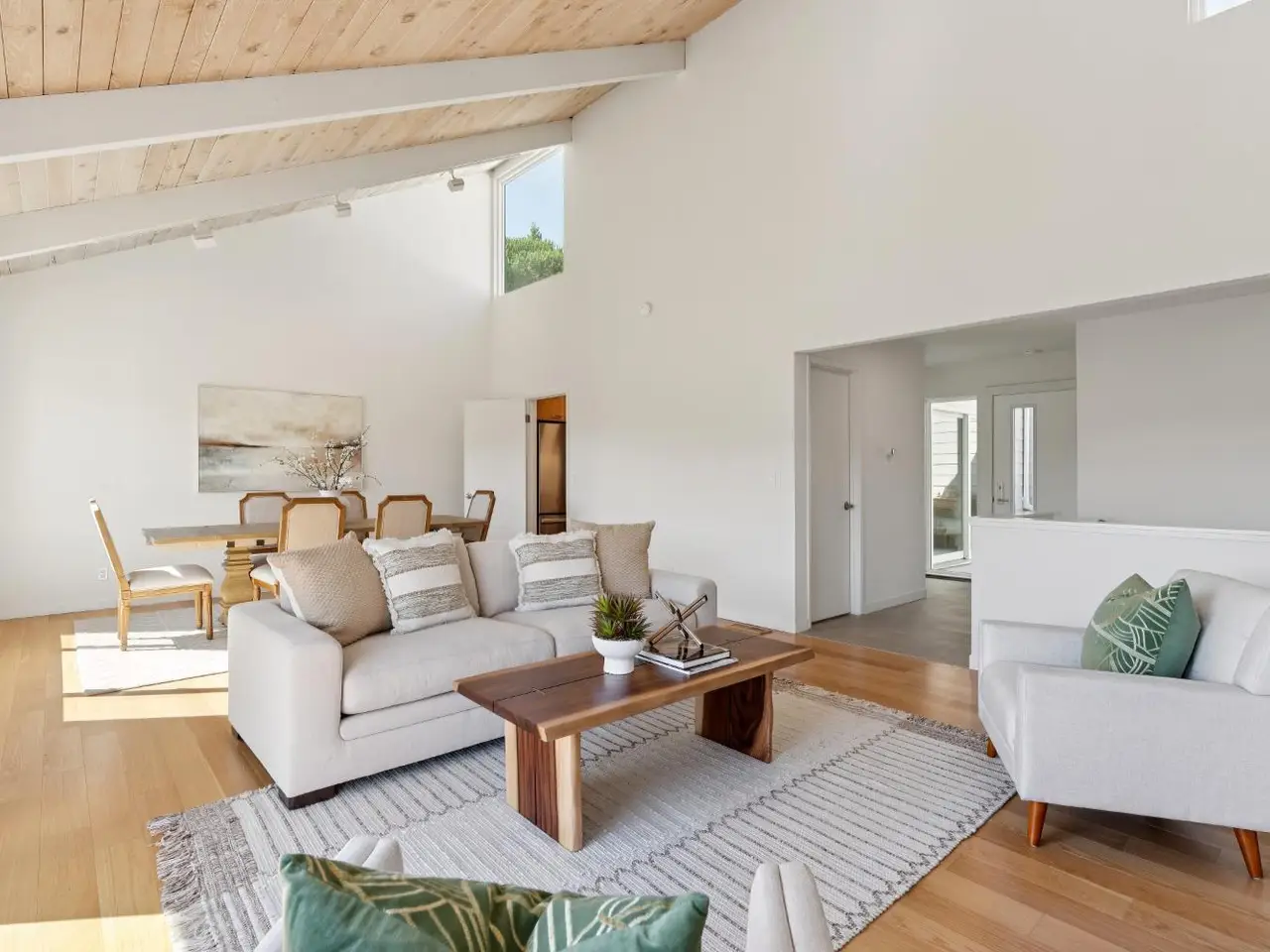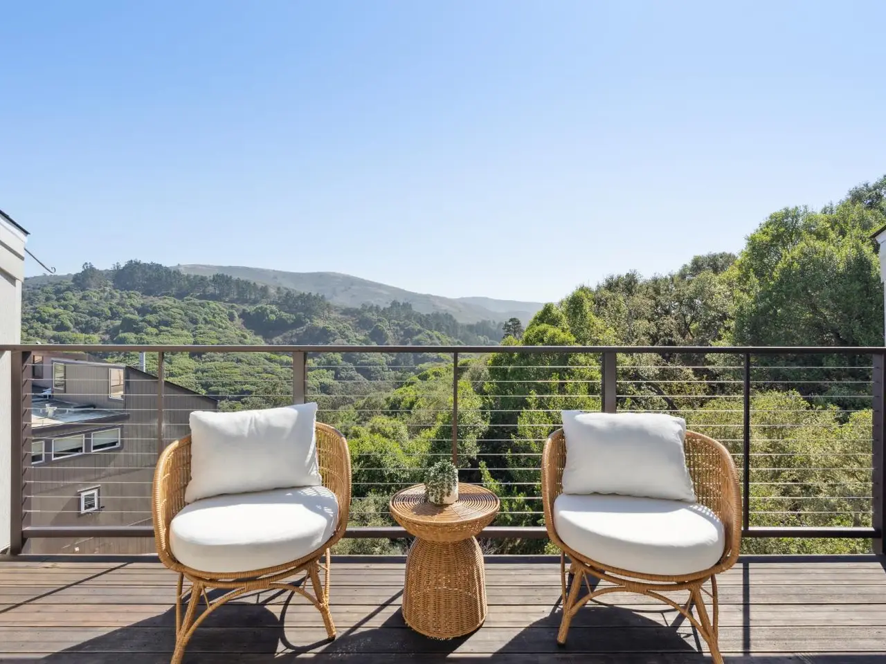 Stunning, stylishly remodeled home in Marinview featuring light-filled, open spaces with two bedrooms, two versatile bonus rooms, and two and a half baths. Situated on a quiet cul-de-sac and perched with tranquil, expansive views overlooking the Golden Gate National Recreation Area, this attached residence brings natural beauty to your doorstep. The living and dining room showcases soaring, open-beamed ceilings, gleaming hardwood floors, and a gas fireplace, while large windows and sliding doors bathe the space in natural light and open seamlessly to the view deck. The chef's kitchen delights with maple cabinetry, quartz countertops, and premium appliances including a five-burner induction range, plus a breakfast bar and informal dining area that opens to a peaceful, porcelain-tiled entry courtyard. The lower level houses two bedrooms, both bonus rooms, and a well-equipped laundry room. The spacious primary suite features a luxurious bath and private deck. A two-car garage completes the home. Perfectly positioned with trailheads nearby and close to Tam Valley's shopping, restaurants, and top-rated schools. Downtown Mill Valley is just minutes away. Easy access to Highway 101.