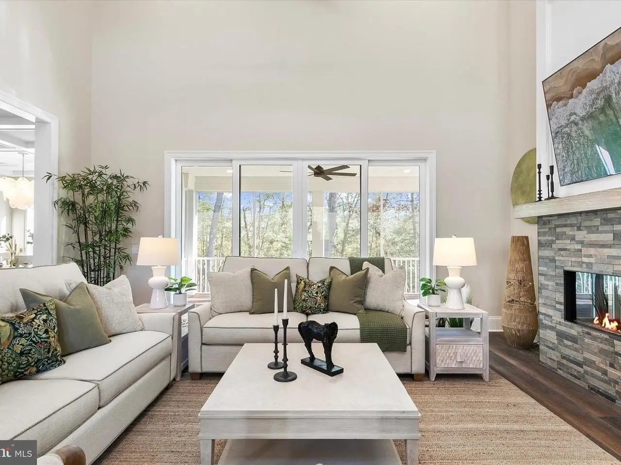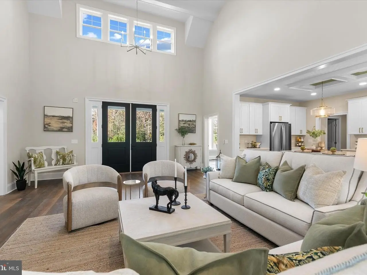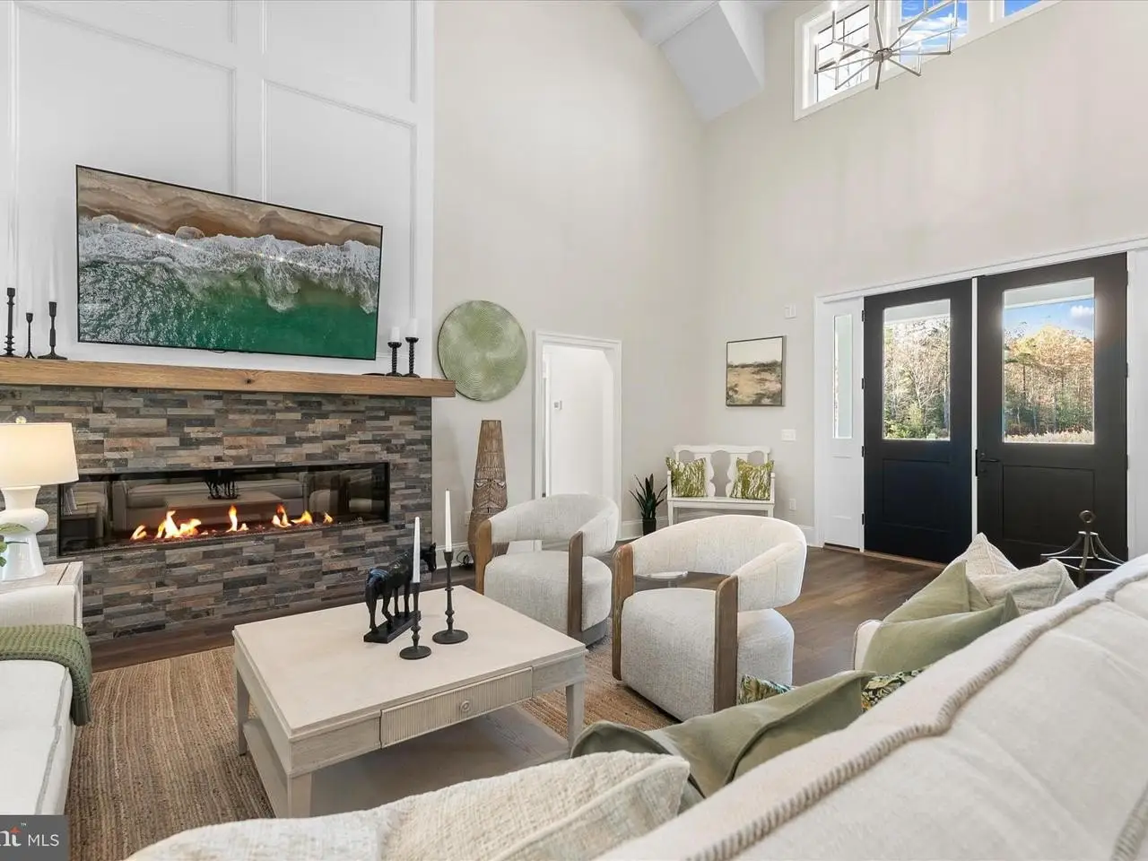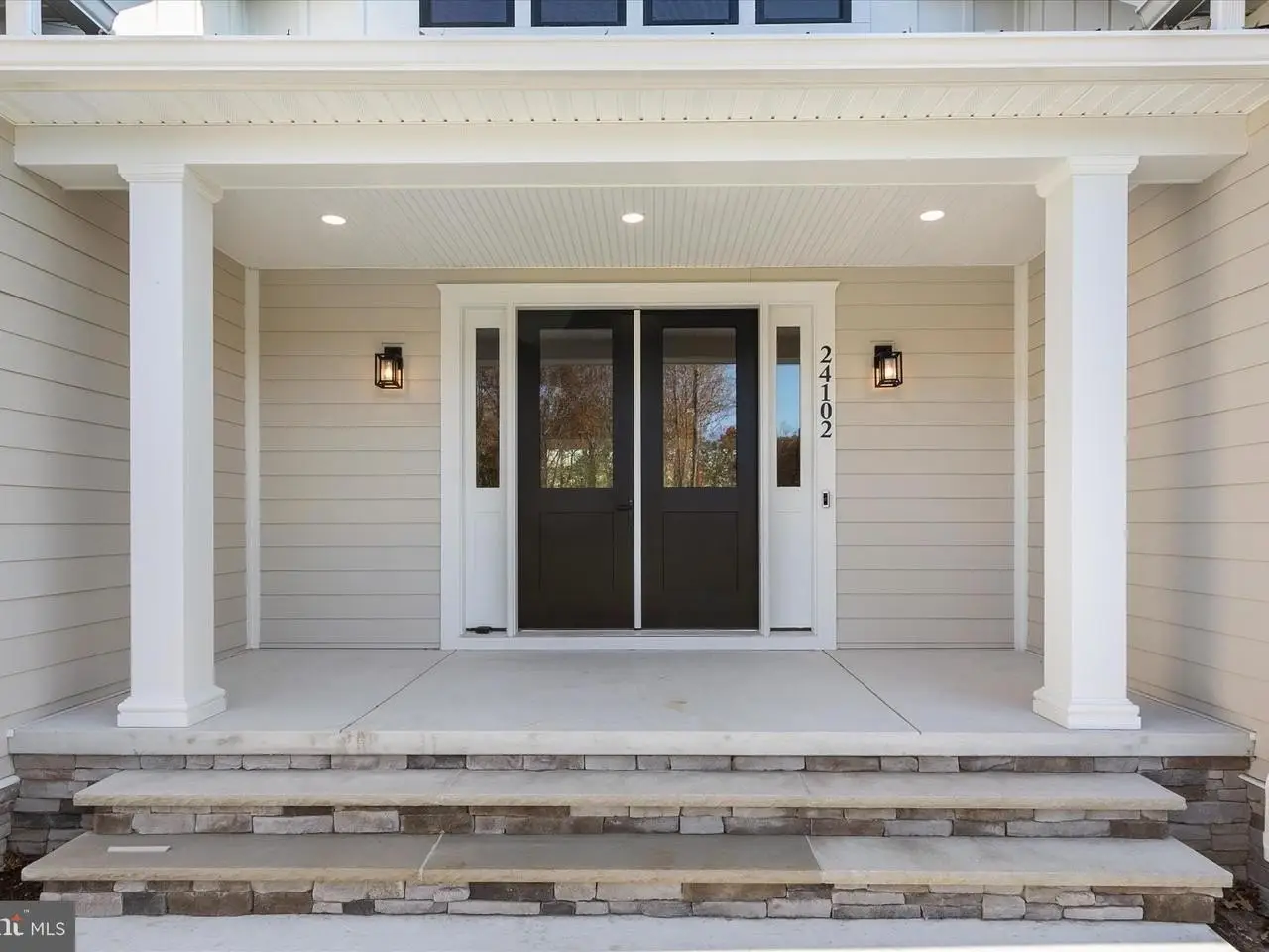 Introducing 24102 Ingram Drive, an architectural masterpiece crafted by Garrison Homes. This distinguished Georgetown model sits on a .82-acre homesite, privately backed by mature trees and designed to impress from every angle. The exterior blends modern and coastal elements with multiple roof peaks, a mix of horizontal, vertical, and shake siding accented by stone, and striking metal roof details. A sweeping walkway leads to the covered front porch, anchored by stately columns and double entry doors framed with sidelights, setting an inviting tone for what awaits inside. Step through the doors into a beautiful two-story great room featuring a sleek linear gas fireplace wrapped in stone, accented by a crisp white accent wall that carries to the ceiling. A dramatic wall of glass doors opens to the screened porch and composite rear deck, perfectly framing the wooded backdrop and flooding the interior with natural light. The open floor plan transitions effortlessly into a designer kitchen that is both functional and beautiful. A quartz island, illuminated by elegant pendant lighting, offers comfortable seating for casual meals and gatherings. The space is equipped with a full suite of stainless-steel appliances, including a five-burner gas range with a striking range hood, complemented by 42-inch soft-close cabinetry, detailed trim, and a stylish tile backsplash. Luxury vinyl plank flooring extends throughout the main level, unifying each space with a warm, contemporary aesthetic. The adjacent dining area, highlighted by coffered ceilings and a statement chandelier, provides the perfect atmosphere for entertaining. Just off the kitchen, a deep walk-in pantry offers ample storage, while a laundry room with cabinetry and a sink adds everyday convenience. A nearby mudroom with hooks creates an ideal drop zone for coats, bags, and shoes. The primary suite is a showpiece of craftsmanship and serenity, highlighted by a cathedral ceiling with white shiplap ceiling, dual walk-in closets, and a spa-like bath showcasing two vanities, a freestanding soaking tub beneath a chandelier, and a walk-in subway-tiled shower with dual showerheads and niches. Three additional bedrooms, each with walk-in closets and ceiling fans, provide comfortable accommodations on the main level. The side-entry two-car garage includes a separate exit door and a storage closet for convenience. Outside, the property is enhanced by professional landscaping with an irrigation system to keep it lush and green. The lower level offers endless potential with a full footprint of the home, walk-out access through glass sliding doors to a patio, and rough-in plumbing ready for customization. A third upper-level space with its own rough-in and two rooms adds flexibility for a future home office, gym, or guest retreat. Outside, the Ingrams Point community offers enchanting nature trails weaving through woodlands and along serene streams, as well as parks and open spaces, providing limitless opportunities for outdoor recreation. Indulge in nearby dining, shopping, and entertainment, while relishing the convenience of Delaware beaches and coastal amenities just a short drive away. Do not miss this rare opportunity to immerse yourself in the pinnacle of luxury living in the breathtaking Garrison Homes Georgetown model at Ingrams Point. Schedule your exclusive private tour today and embark on a journey of unparalleled refinement and sophistication.