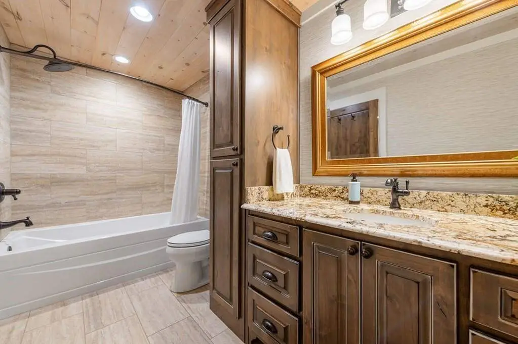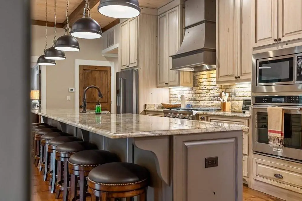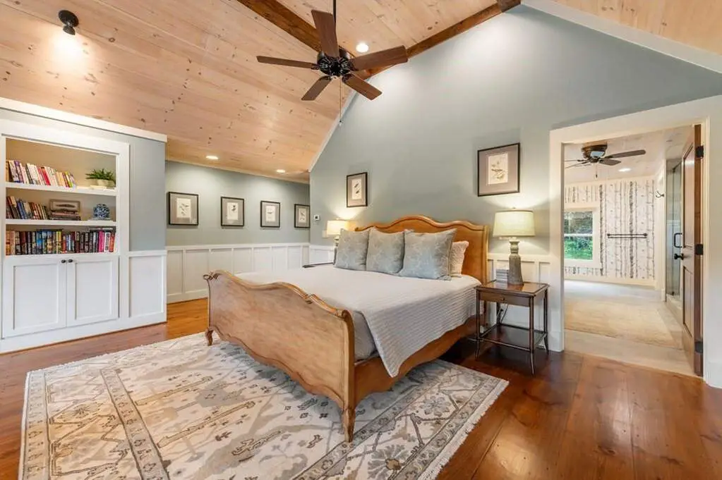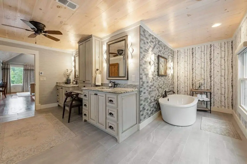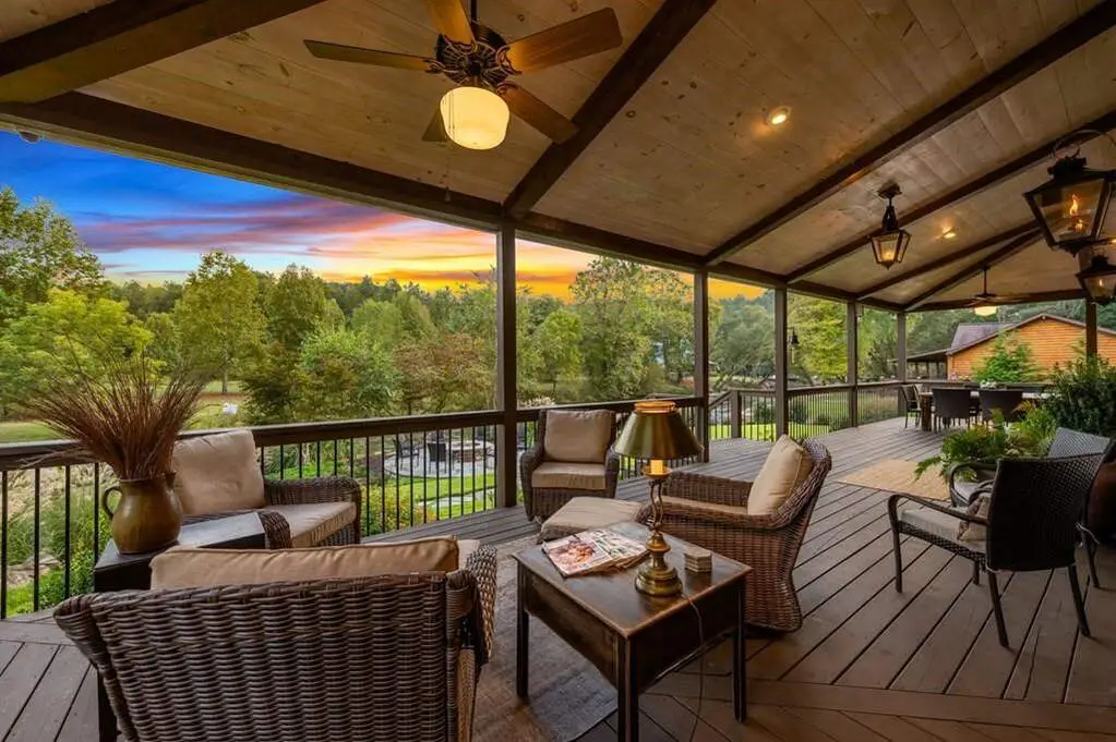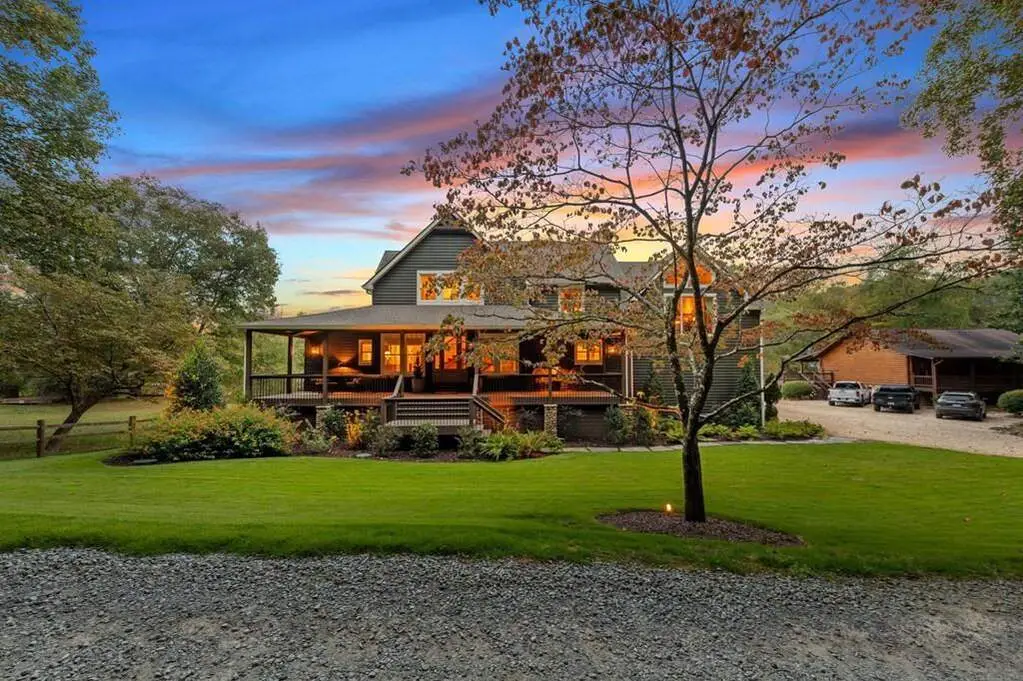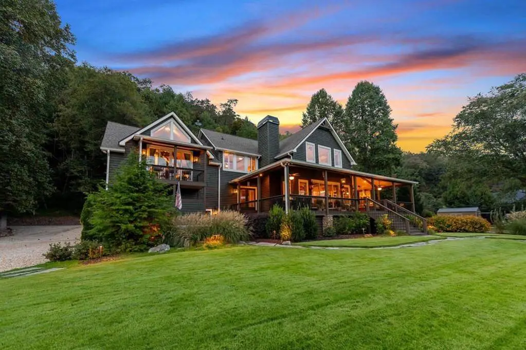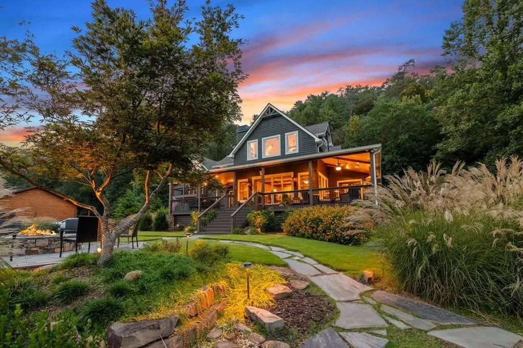 River's Edge is a 6-bedroom, 5-bathroom, fully furnished home with 114' of Toccoa River frontage. It underwent a complete remodel and landscape transformation in 2020, interior designed by Cindy Trimble of Studio Trimble Design of Blue Ridge, GA. The home has 5643 (+/-) heated and cooled sq. ft., 1,400 sq. ft. of front porch, 1,600 sq. ft. of porch facing the river, 16x16 deck extending over the river, a hot tub, and rock firepit with two sets of rock steps leading to the river. The kitchen, living, and dining areas are all open with lots of counter space for cooking and entertaining. Beautiful wide-plank eastern pine floors are featured throughout, with Persian rugs and tasteful dcor that provide a sophisticated lodge feel. The home has three master suites, two on the main floor and one on the second floor. The second-floor master suite features three closets, double vanity sinks, large walk-in shower with separate soaker tub, and heated floors. The second floor also has a bedroom with three single beds and one double bed, plus a full bathroom. The basement has a large living area; two bedrooms, one with a queen bed, and one with four full beds; a full bathroom with double sinks, and walk-in shower. There are four Tennessee fieldstone fireplaces in the home. Located above the garage is a bonus/billiards room with vaulted ceiling, bar, and private balcony. The back porch overlooking the river features a cooking area with a built-in grill and bar fridge along with a sitting area and custom-made dining table that seats eight. The professionally landscaped yard features Zeon Zosia grass, underground drainage, irrigation system, outdoor accent lighting, and camera system. With access to two fish weirs, and a fish feeder that feeds trout daily, it offers some of the best fishing on the tailwater! The attention to detail in this home is something to see and appreciate.