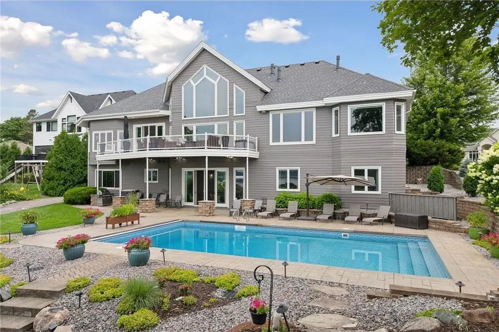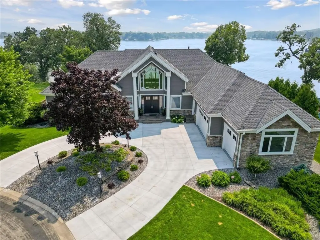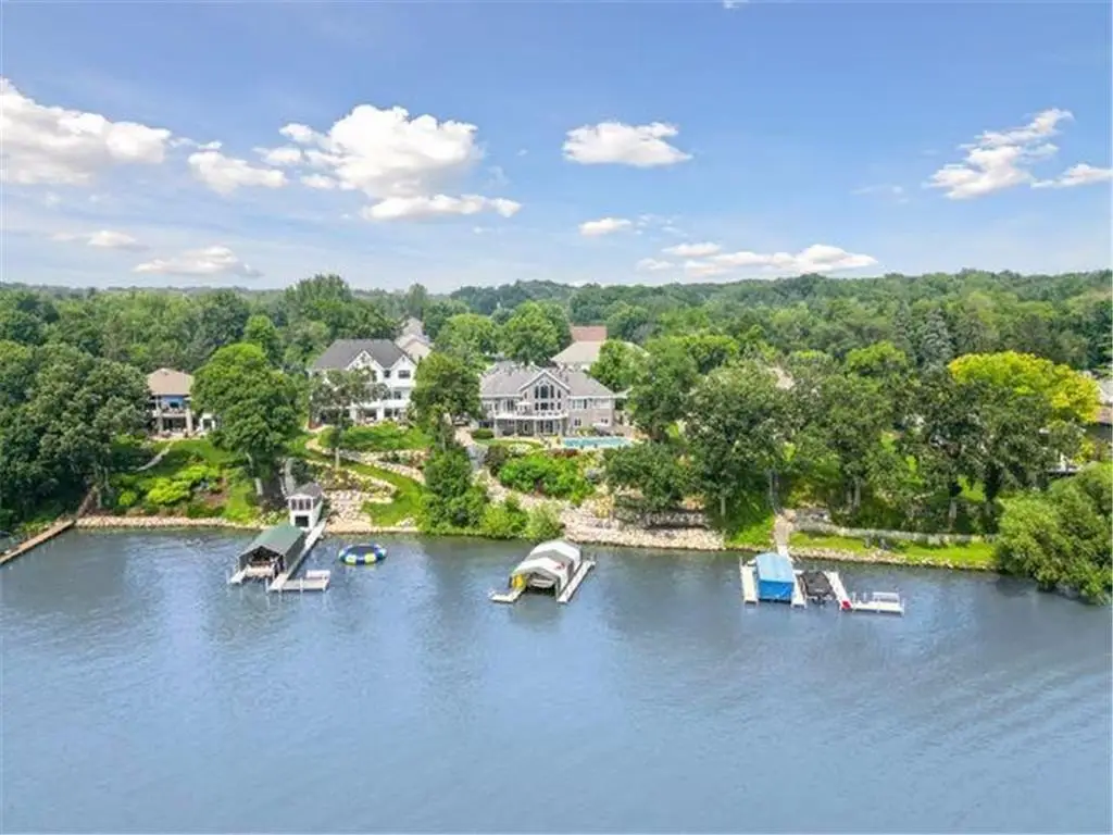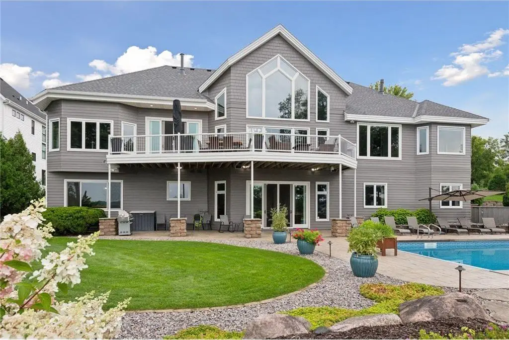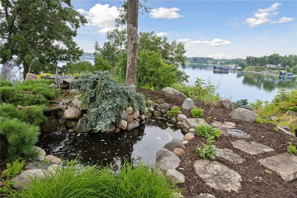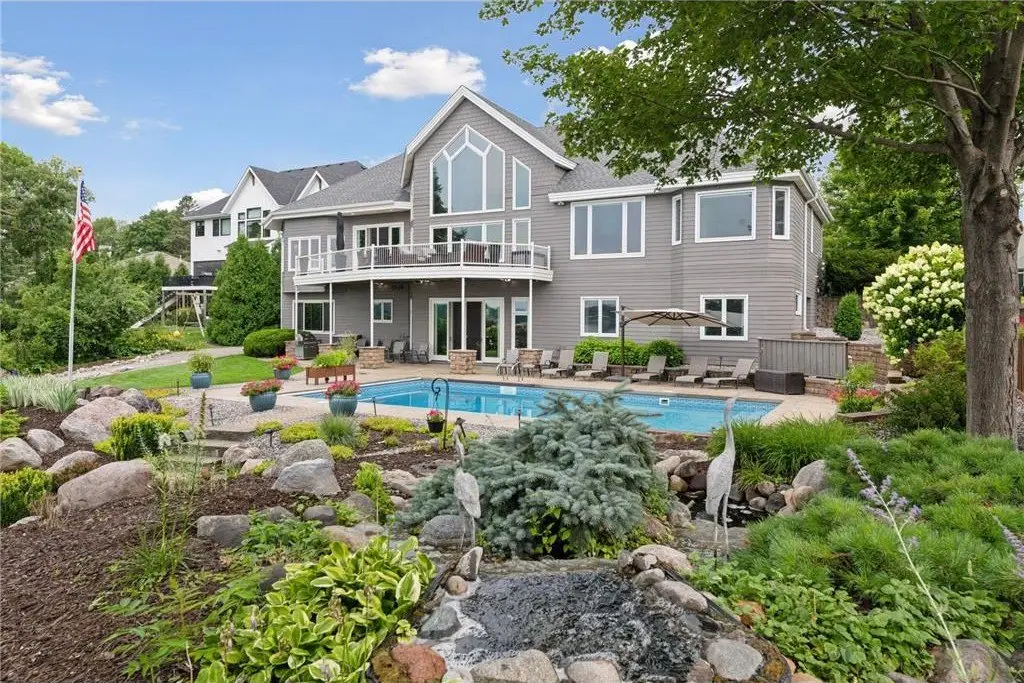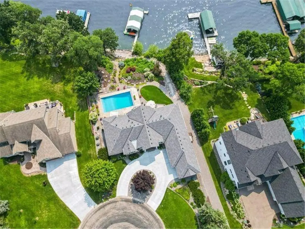 This amazing Lake Minnetonka home sits on 128 feet of south-facing shoreline overlooking Jennings Bay. A refreshing 20 x 40-foot saltwater pool and tranquil waterfall feature and beautifully manicured landscaping seamlessly connects the pool area to the lakefront. This exceptional home is filled with natural light, dramatic vaults, stunning lake views, hardwood floors, and amazing updates throughout. A vaulted wall of windows showcasing long lake views takes center stage. The redesigned chef’s kitchen - well-appointed with premium amenities, an informal dining area with deck access + bayed sitting area are the heart of the home. Main level living convenience includes the primary suite with stunning bath with steam shower and soaker tub, a walk-in primary closet with center island, a vaulted office, laundry, mudroom and two additional baths on this main level. The walk-out lower level is entertainment ready with its large family room offering a gas fireplace with stone surround & large doors which slide open to connect to the pool area + an adjoining 2nd kitchen and billiards/game area. Also find three bedrooms and three baths, and a huge workshop and second laundry and storage areas. Geothermal heating and cooling and sound system throughout the house. Incredible curb appeal with circular concrete drive, mature landscaping, and room for six cars between the upper and lower garages.